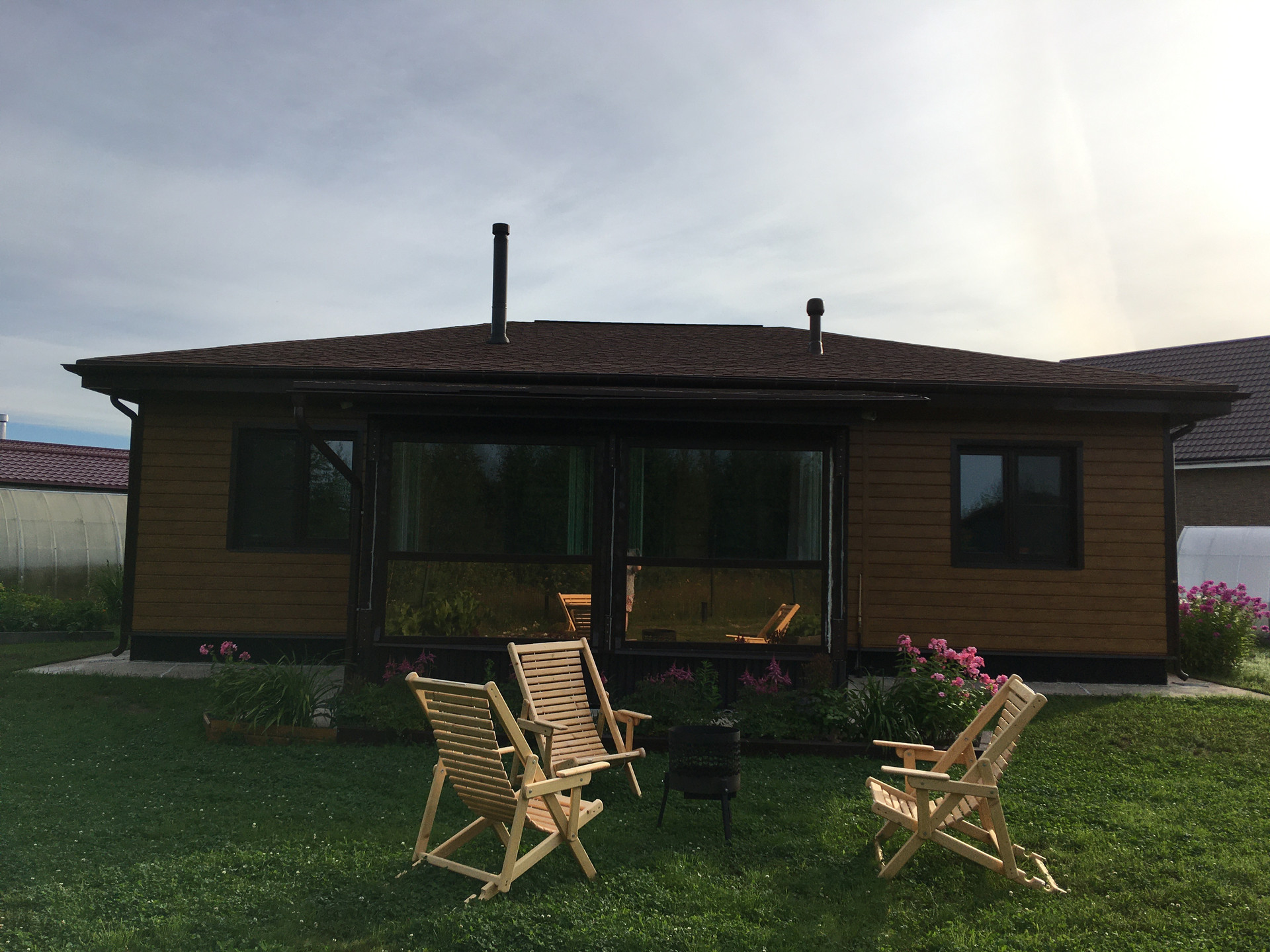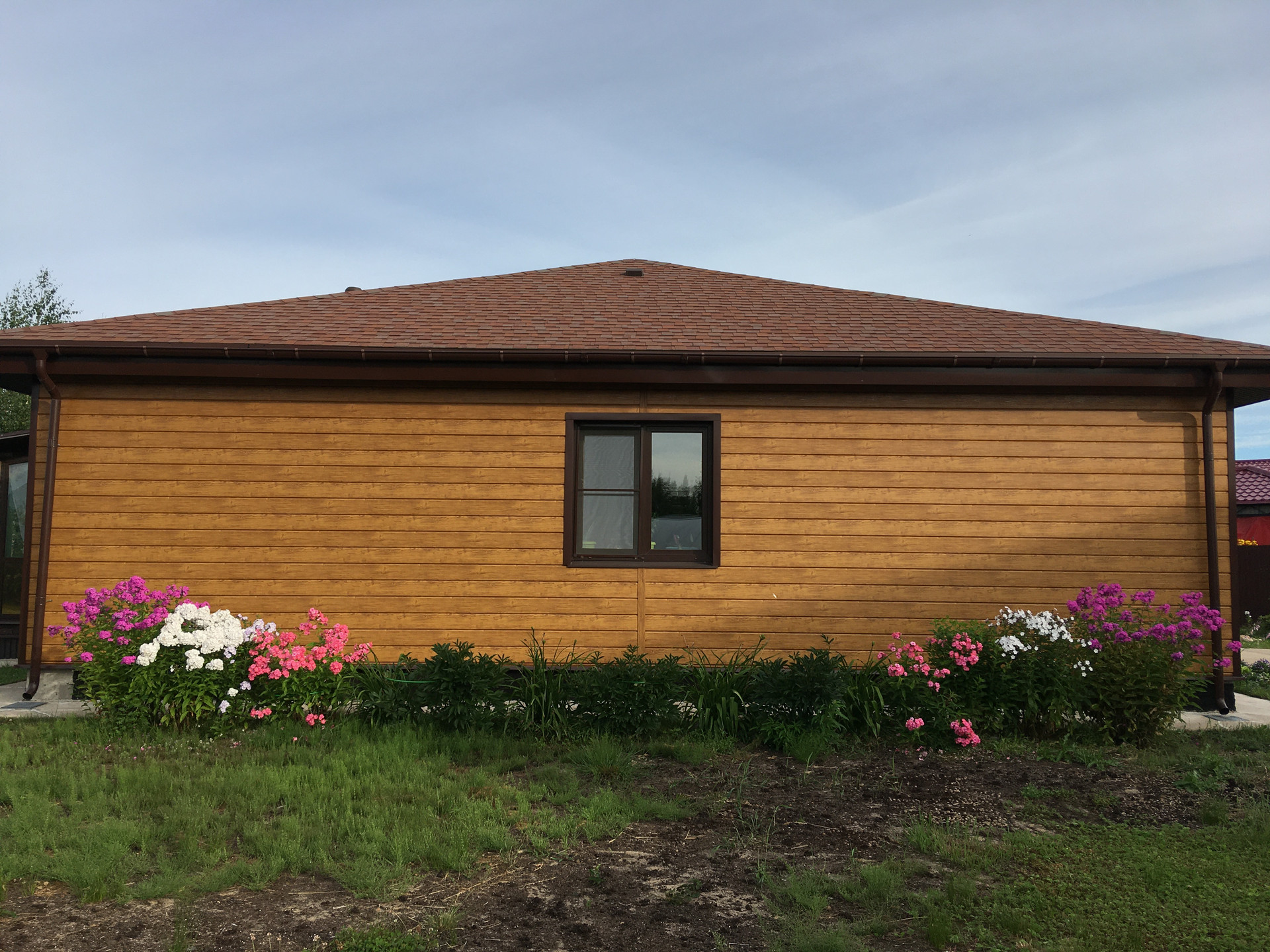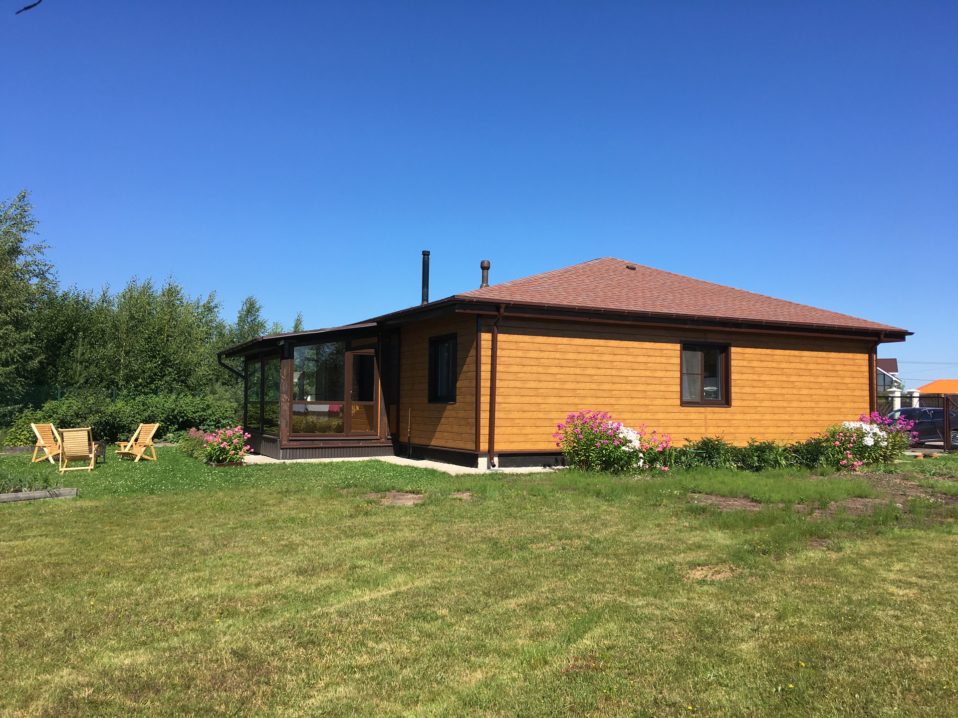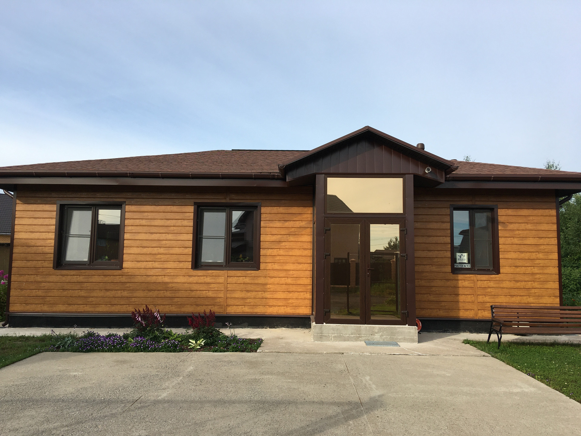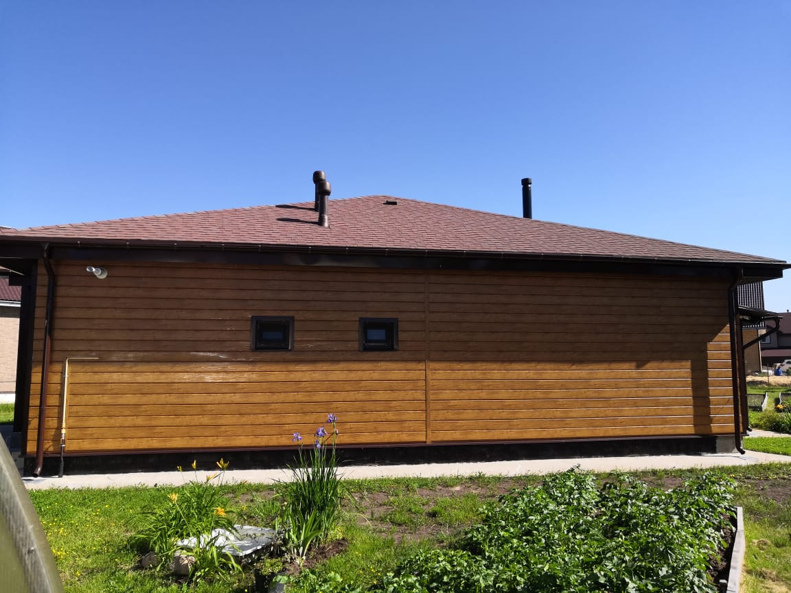 Стены: газобетон Аэрок (ЛСР) 375 мм, обшит металлическим сайдингом под дерево Grand Line (гарантия 50 лет).
