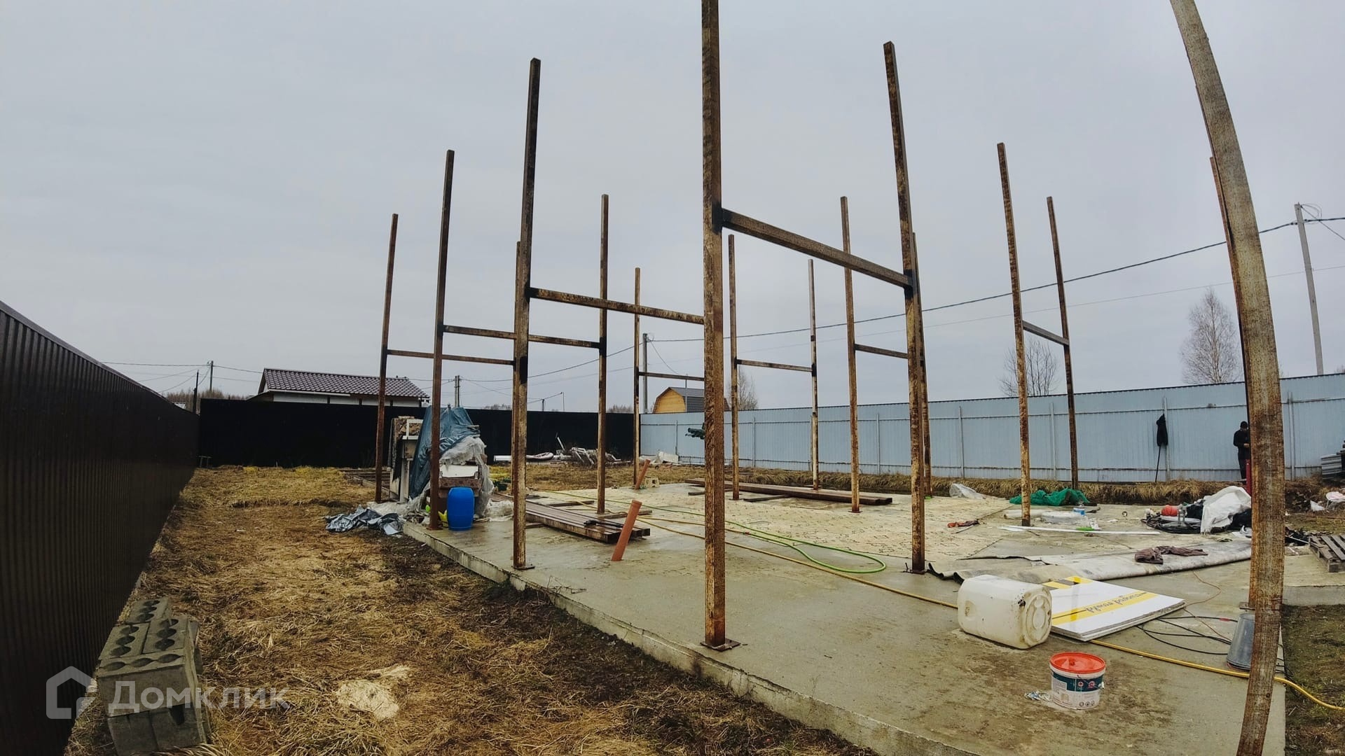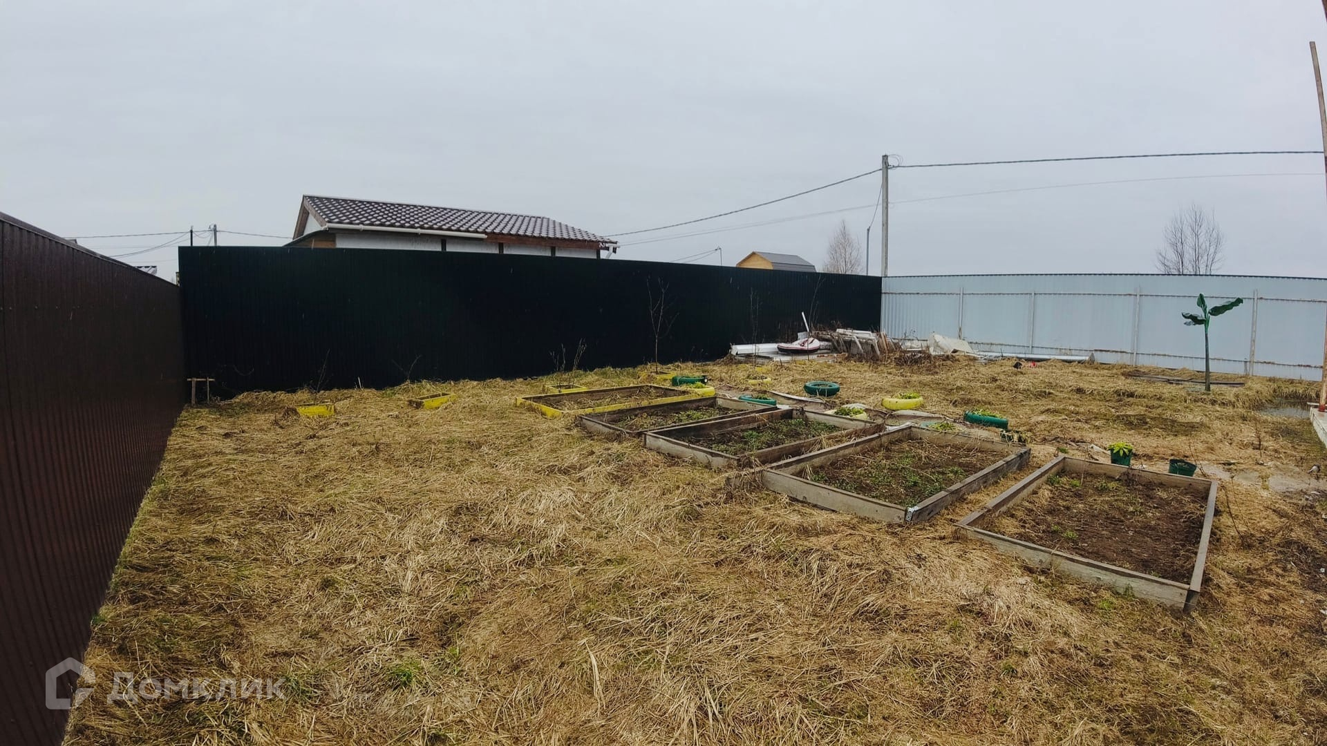 Огорожен со всех сторон забором из профнастила высотой 2.5 метра. Имеются откатные ворота.