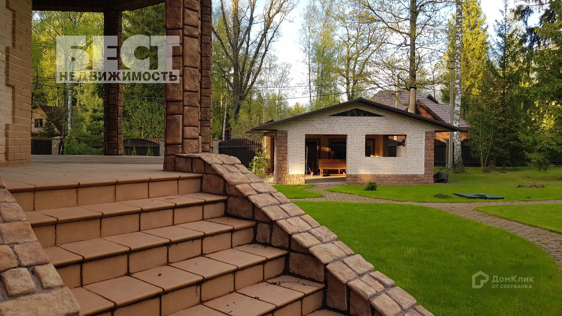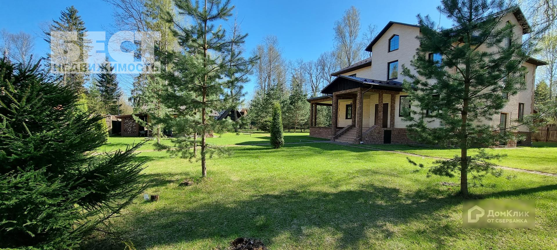 Участок 40 соток с ухоженным газоном, с различными деревьями — дубы, березы, ели, туи, много сосен. Участок выровнен, дренирован, система полива, дорожки, освещение. Газ — 100 кВт. Электричество — трехфазное, 19 кВт. Интернет.