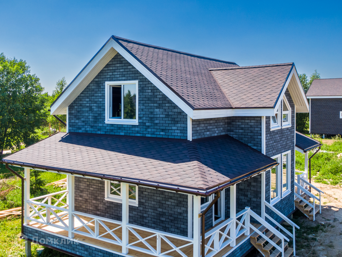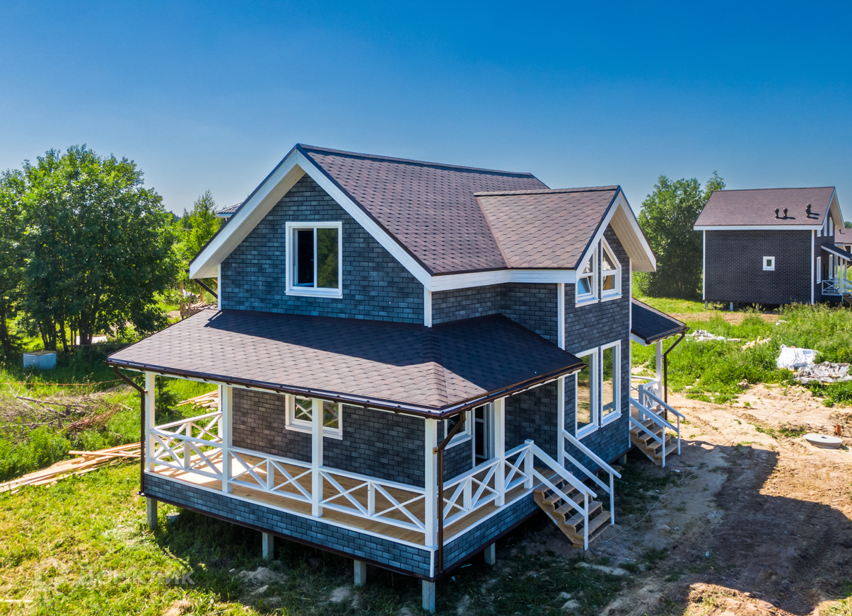 Строительство дома производится по технологии Дом.ТН (Дом Технониколь), с соблюдением всех стандартов компании Технониколь. Наружная отделка выполняется фасадной плиткой Хауберк, в качестве кровельного покрытия выступает гибкая черепица Шинглас, внутренняя отдела помещений выполнена имитатором бруса покрытым лессирующим антисептиком с выделением текстуры дерева, в сан.узлах на полу и стенах установлена кафельная плитка. Смонтированы натяжные потолки со встроенными светильниками, установлены розетки, включатели и переключатели. Отопление за счет электрического котла, а в помещениях установлены радиаторы. Отделка пола – ламинат, в сан.узлах кафельная плитка. Окна поворотно-откидные створки с двухкамерными стеклопакетами.