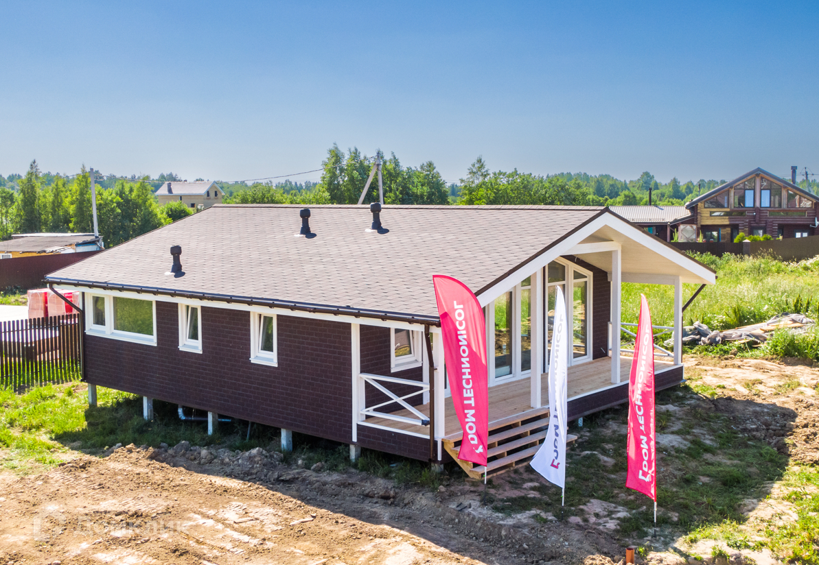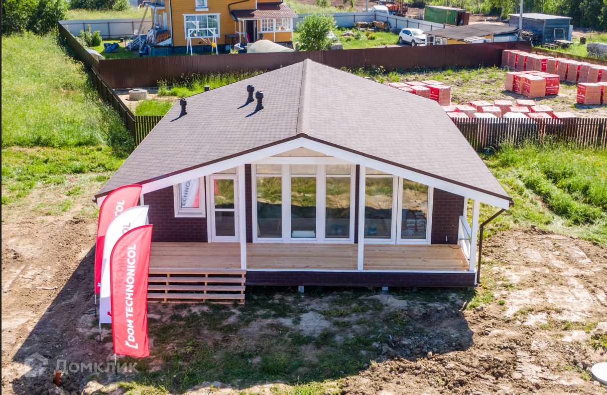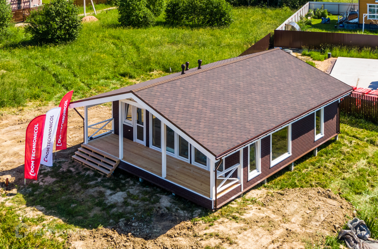 Строительство дома производится по технологии Дом.ТН (Дом Технониколь), с соблюдением всех стандартов компании Технониколь. Наружная отделка выполняется фасадной плиткой Хауберк, в качестве кровельного покрытия выступает гибкая черепица Шинглас, внутренняя отдела помещений выполнена имитатором бруса покрытым лессирующим антисептиком с выделением текстуры дерева, в сан.узлах на полу и стенах установлена кафельная плитка. Смонтированы натяжные потолки со встроенными светильниками, установлены розетки, включатели и переключатели. Отопление за счет электрического котла, а в помещениях установлены радиаторы. Отделка пола – ламинат, в сан.узлах кафельная плитка. Окна поворотно-откидные створки с двухкамерными стеклопакетами.