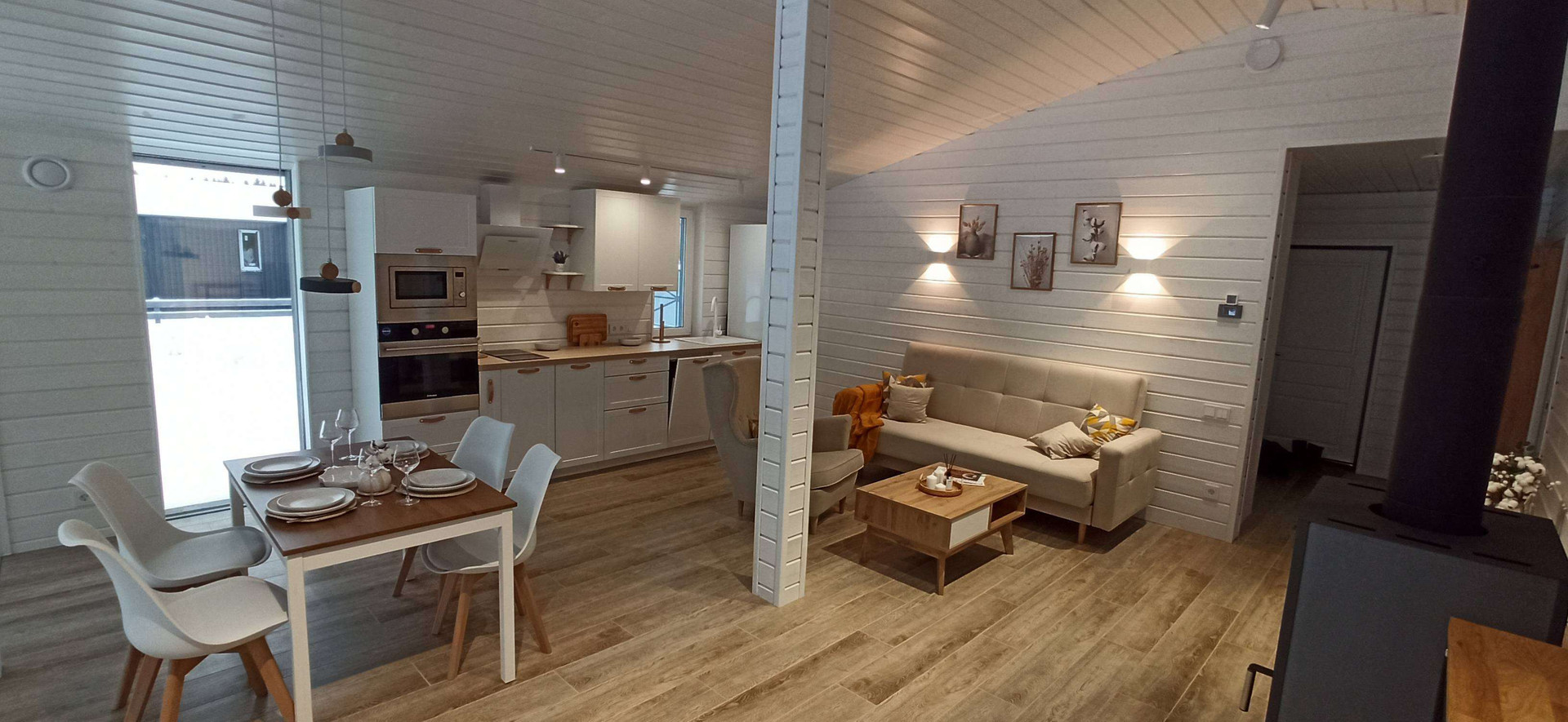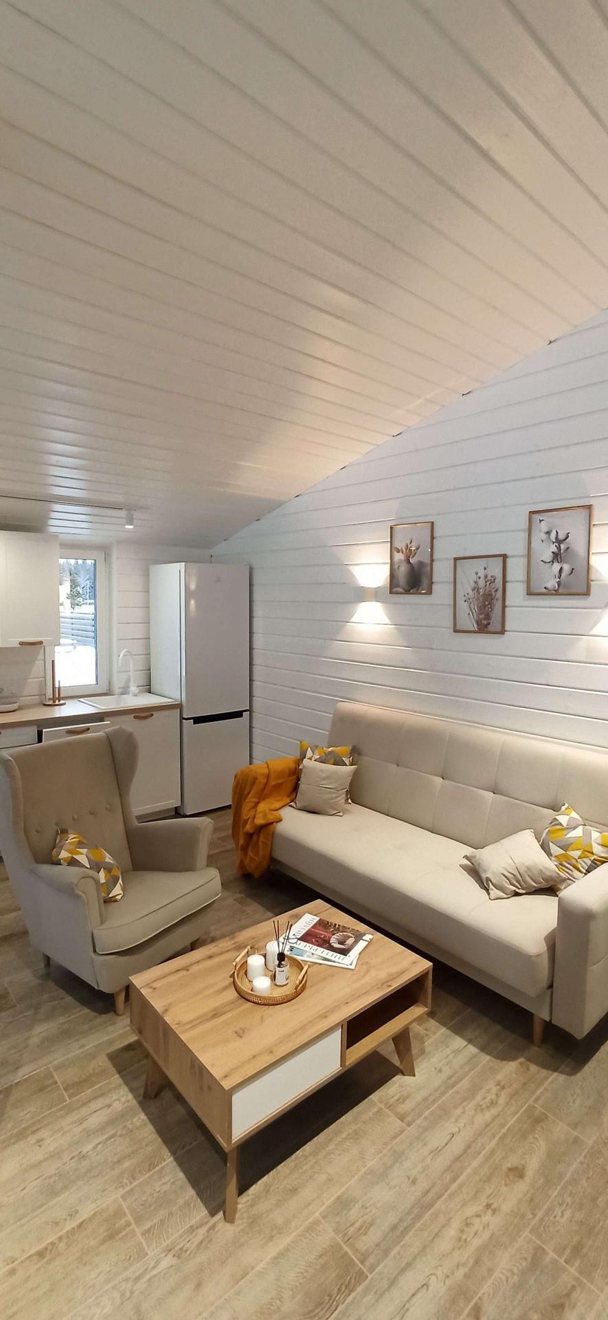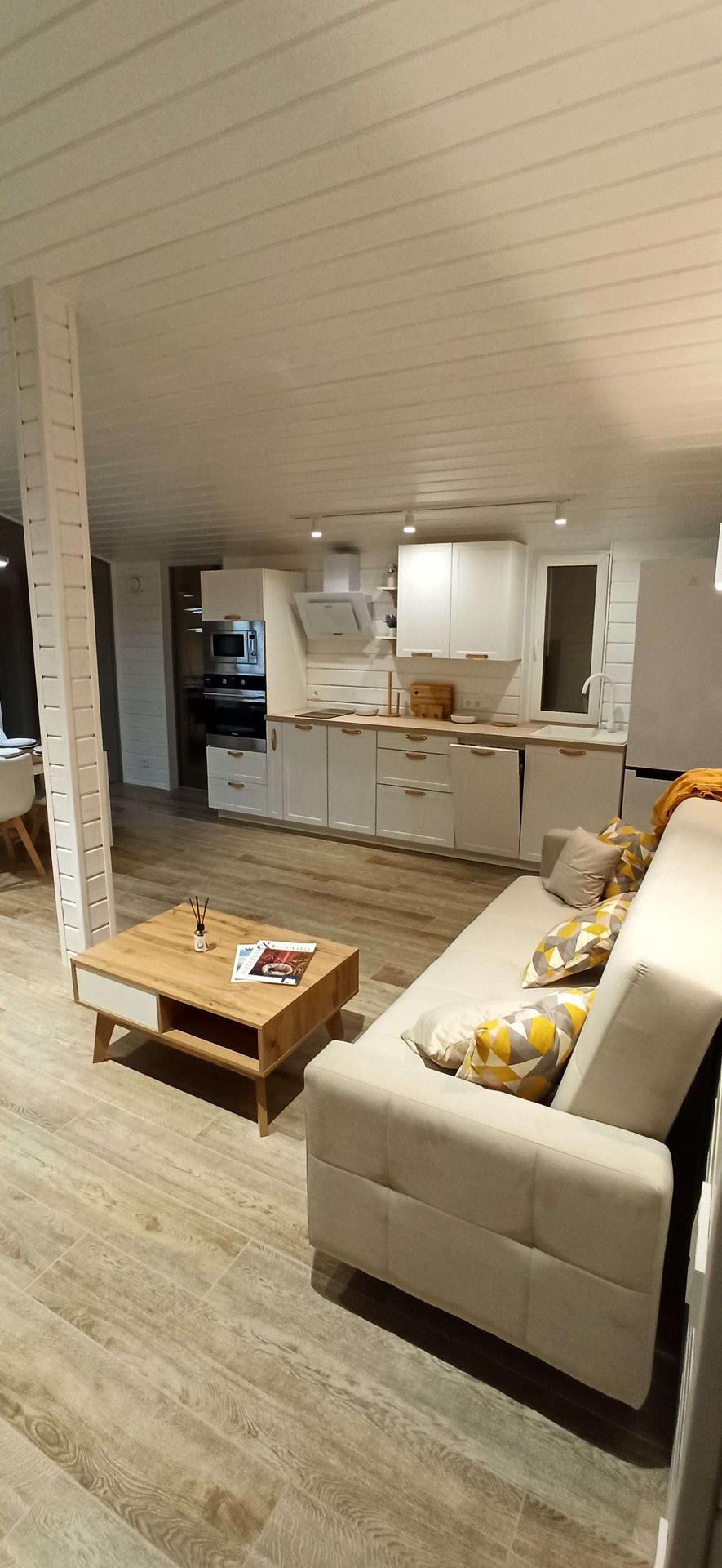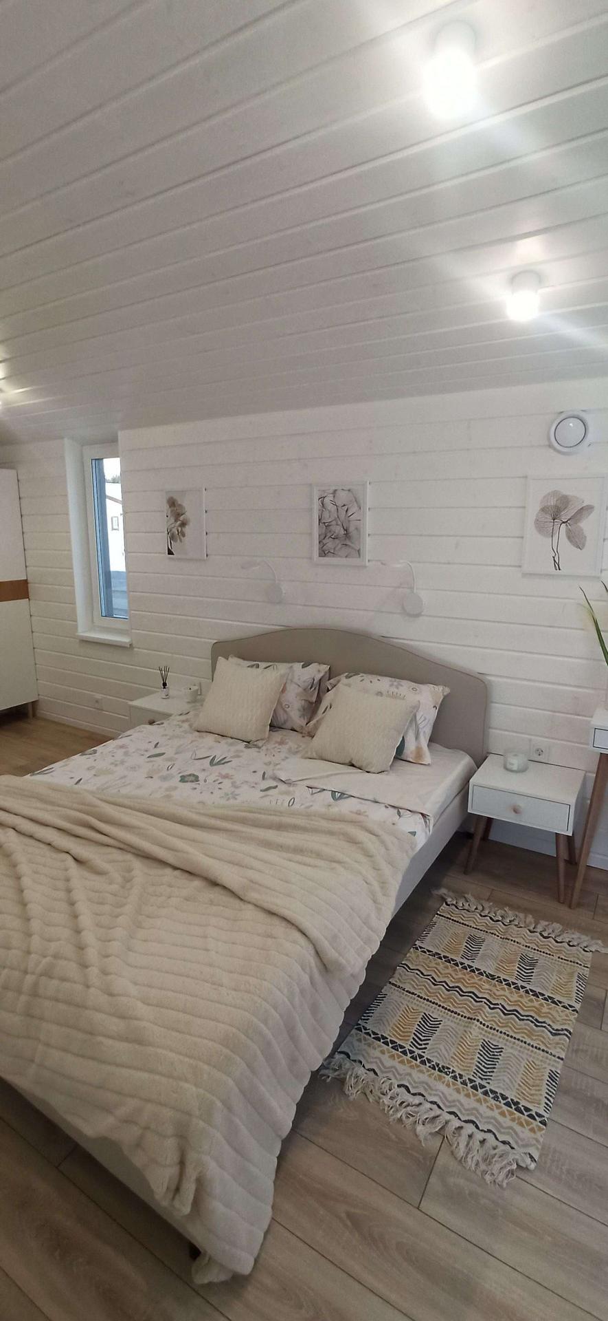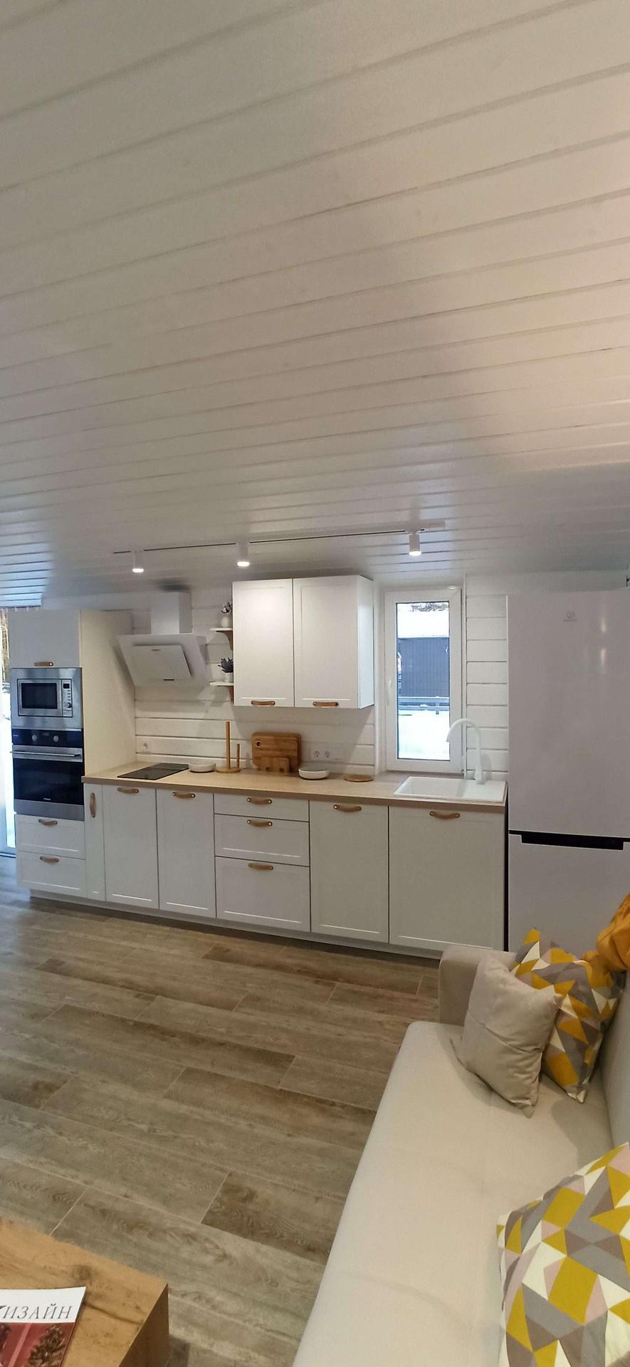 ✅ Внутренняя отделка выполнена имитацией бруса 145*21мм, пол - ламинат 33 класс в комнатах, в коридоре, с.у. и гостинной керамогранит.