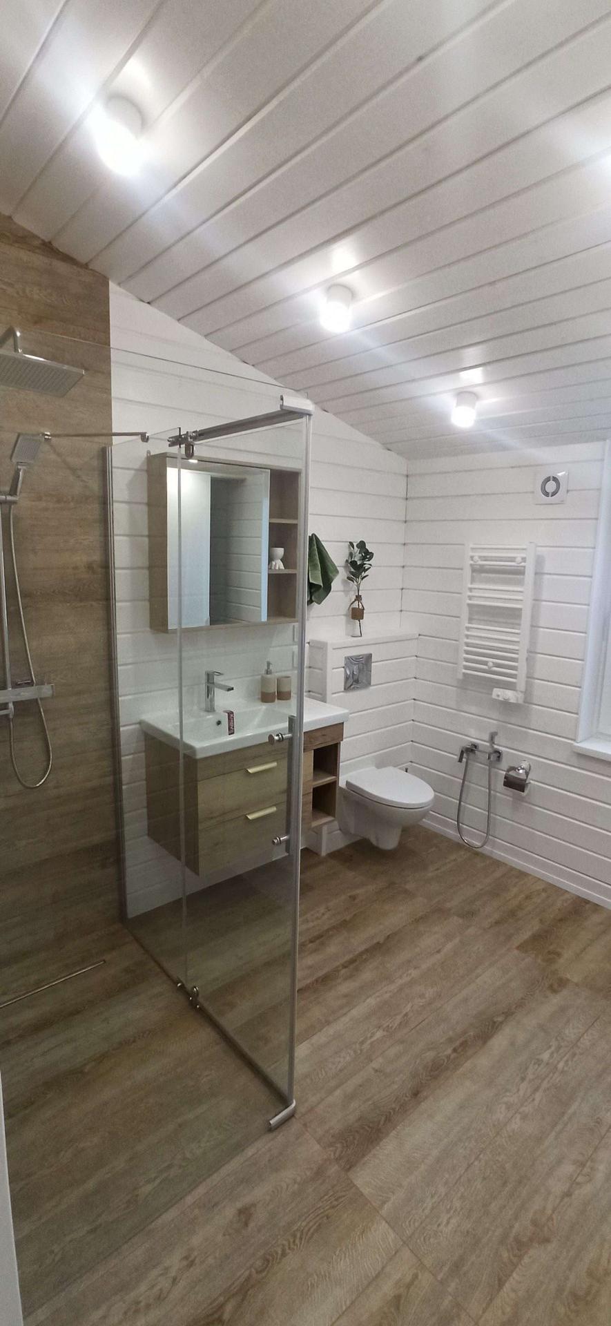 ✅В С.У. электрический теплый пол, полотенцесушитель, подвесная мойка с тумбой, зеркало с подсветкой, стеклянная душевая, подвесной унитаз, пенал.