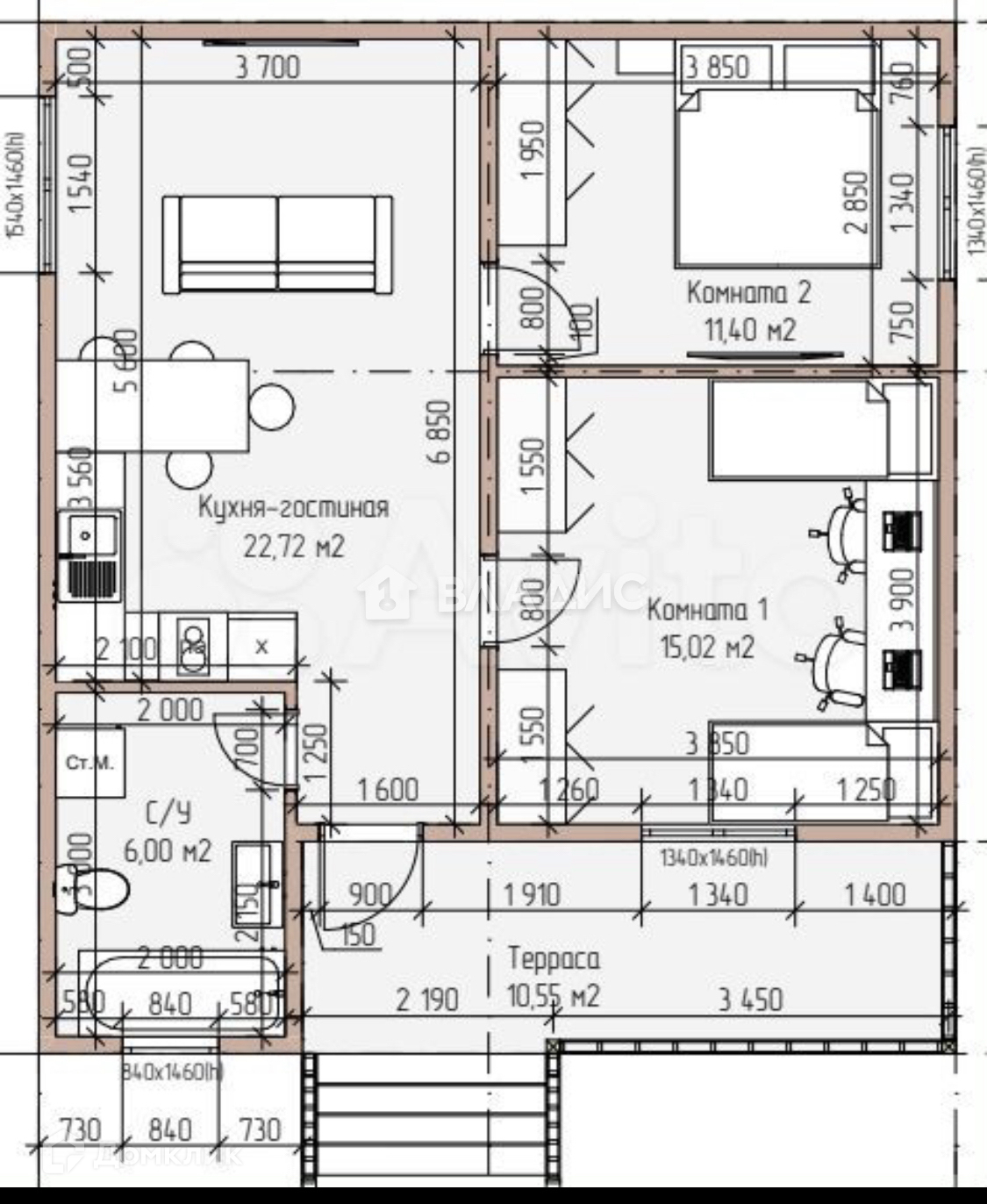 Общая площадь 57.5 м2