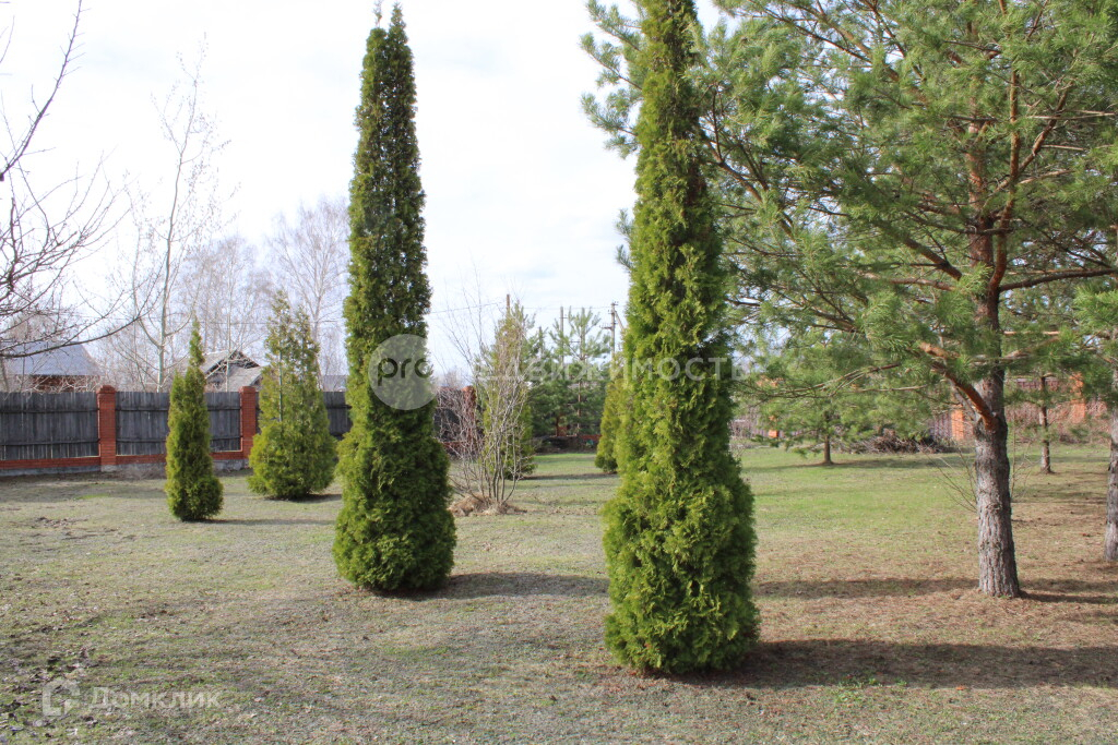 Участок площадью 20 соток ограждён забором. На въезде площадка с тротуарной плиткой. Внутренняя территория благоустроена, посажены фруктовые и сосновые деревья, есть открытая веранда для отдыха с качелями и зоной барбекю.