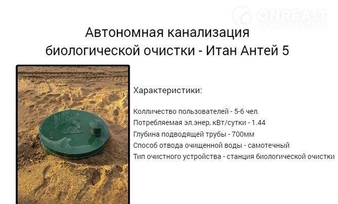 • Канализация  установлена локальная станция биологической очистки, Септик - ИТАЛ АНТЕЙ 5. Рассчитана на 5-6 проживающих постоянно в доме человек.