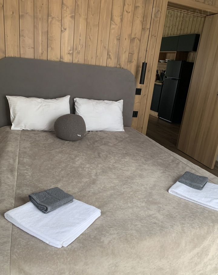 - 1 Спальня: Двухспальная кровать, новое белое отельное постельное бельё, одеяла с подушками, полотенца, халаты.