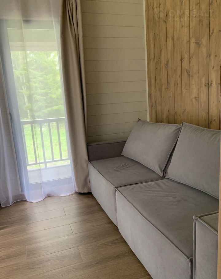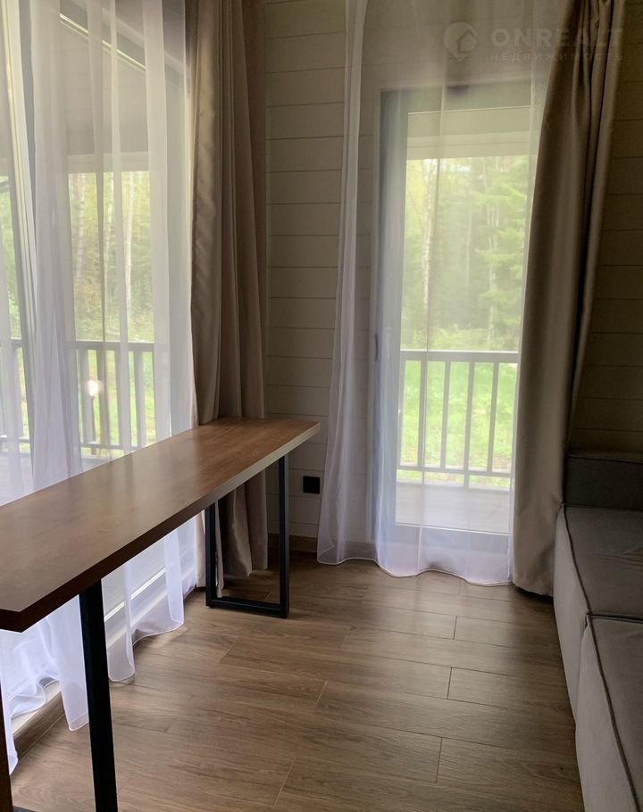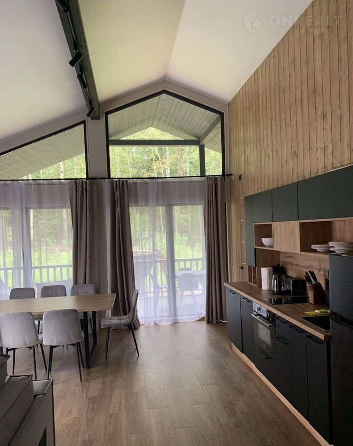 Коттедж имеет просторную кухню-гостиную с панорамными окнами, две спальни (с большой кроватью и двумя раздельными кроватями), кабинет с раскладным двухспальным диваном и просторную крытую террасу. Панорамные окна во всех комнатах с лесным видом создают неповторимую атмосферу. Кухня оборудована необходимой бытовой техникой и посудой.