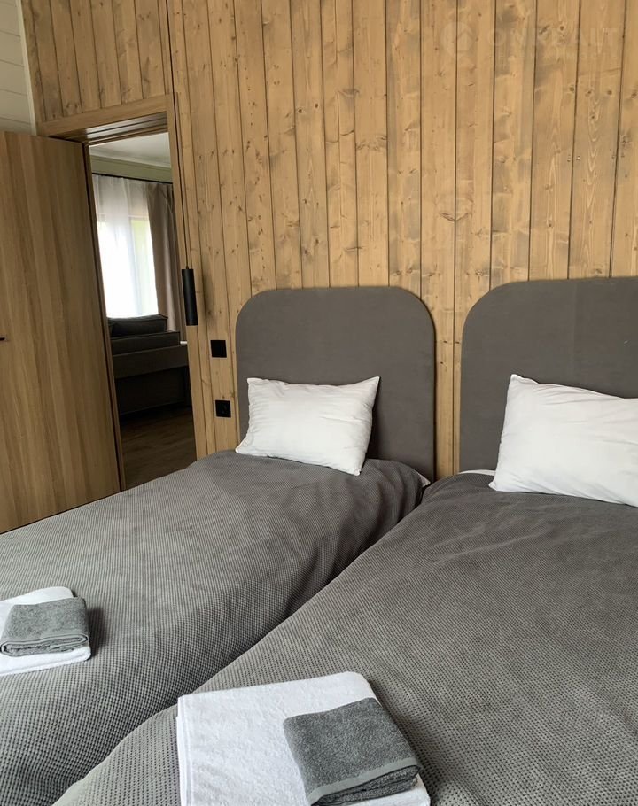 - 2 Спальня: Две односпальные кровати, новое белое отельное постельное бельё, одеяла с подушками, полотенца, халаты.