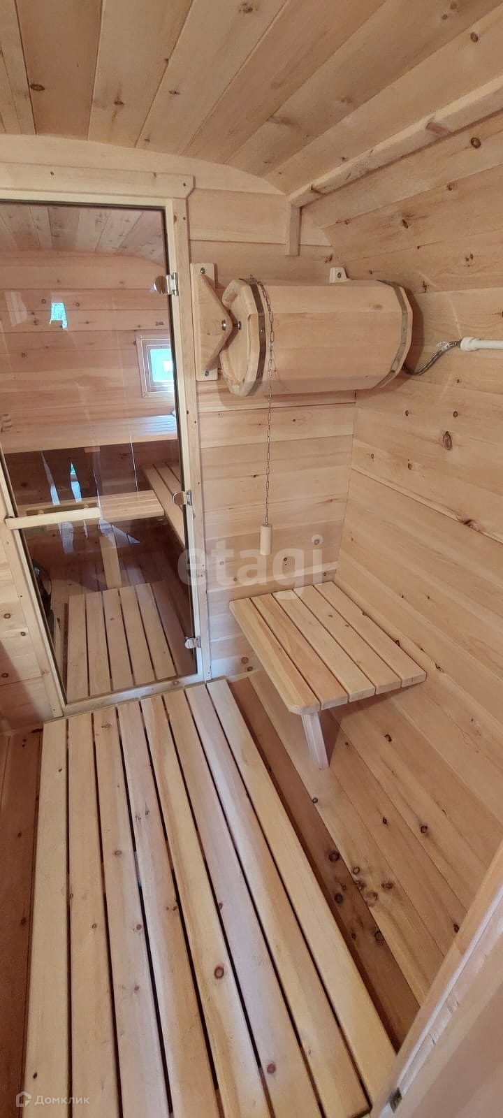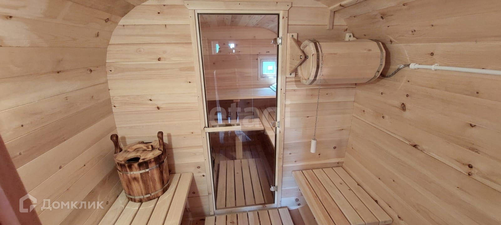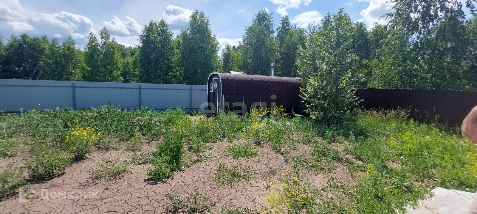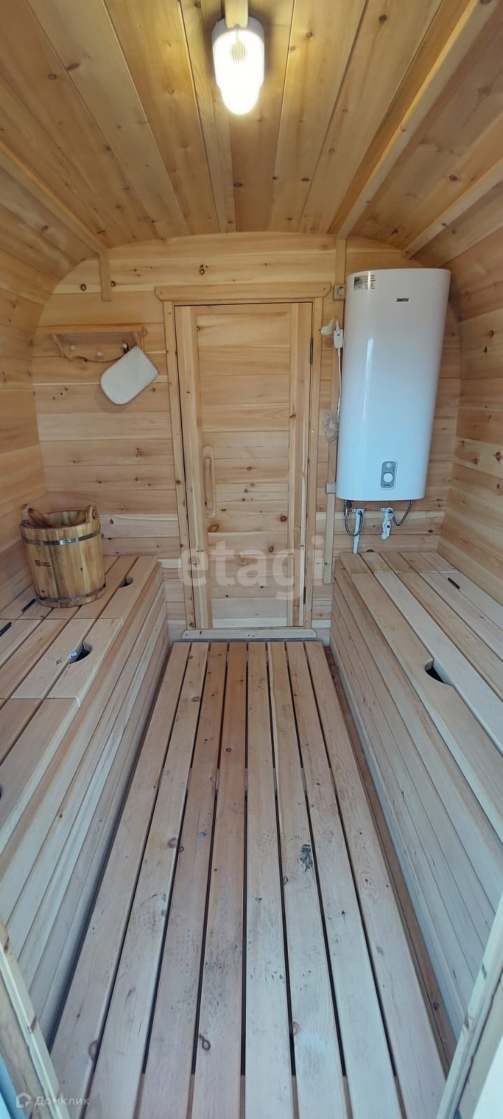 На участке располагается баня-бочка с подведенной водой и водонагревателем.