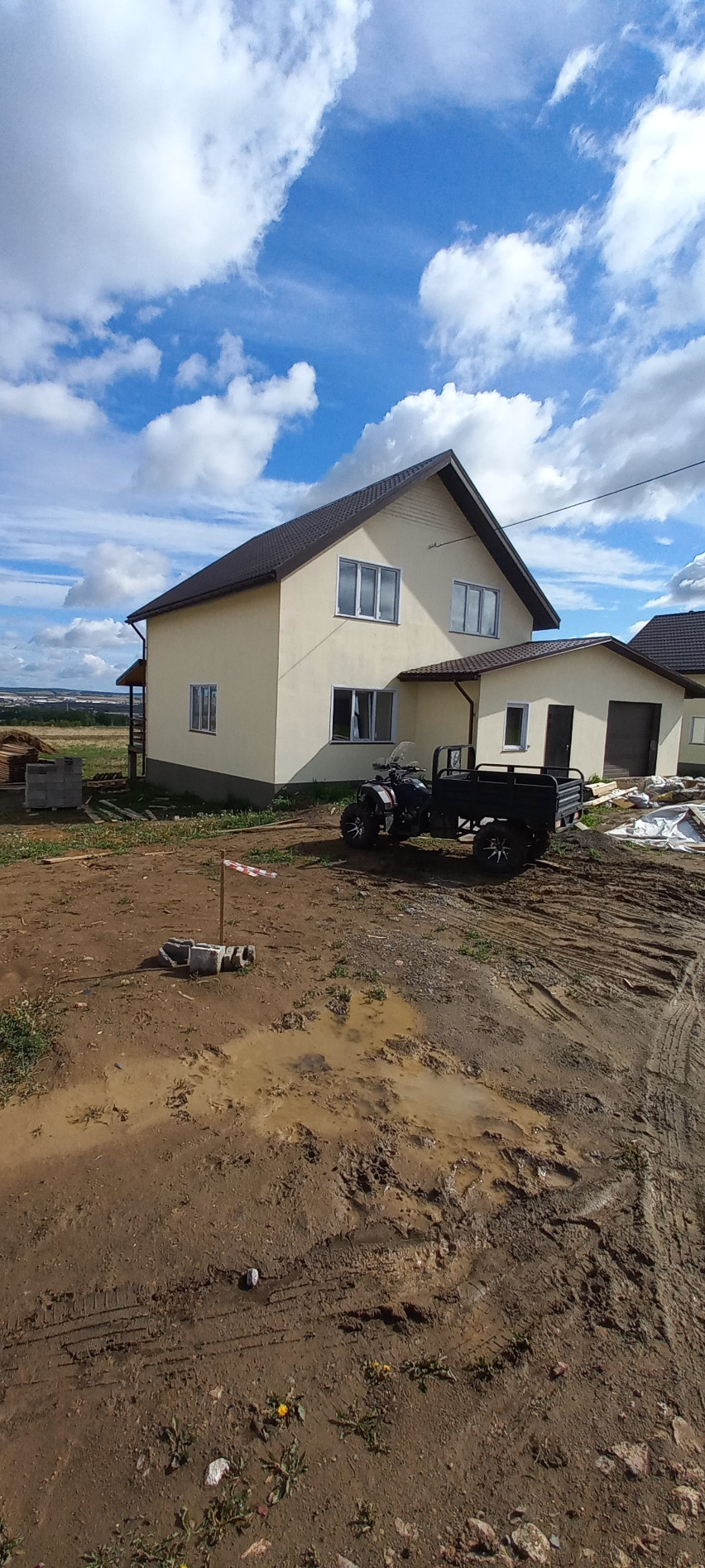 Дом построен из блоков по финской технологии, толщина стен 20 см с фасадным утеплением пеноплекс 50 мм, фундамент - ленточный армированный, монолитная стяжка с утеплением, встроенная система водяного теплого пола, второй этаж мансардный, утеплитель-эковата; окна ПВХ, натяжной потолок; скрытая медная электропроводка в двойной изоляции; перекрытия монолитные, межкомнатные двери; фасадная отделка- клеевая штукатурка ; внутренняя отделка-штукатурка, финишная шпатлевка, окраска. Напольное покрытие-1 этаж керамогранит, 2 этаж линолеум. Система отопления водяной теплый пол с электрическим котлом 15 кВТ. Септик 5 м.куб. Подходит под ипотеку с гос. поддержкой, сельскую ипотеку, материнский сертификат. Предложение от собственника-застройщика.
