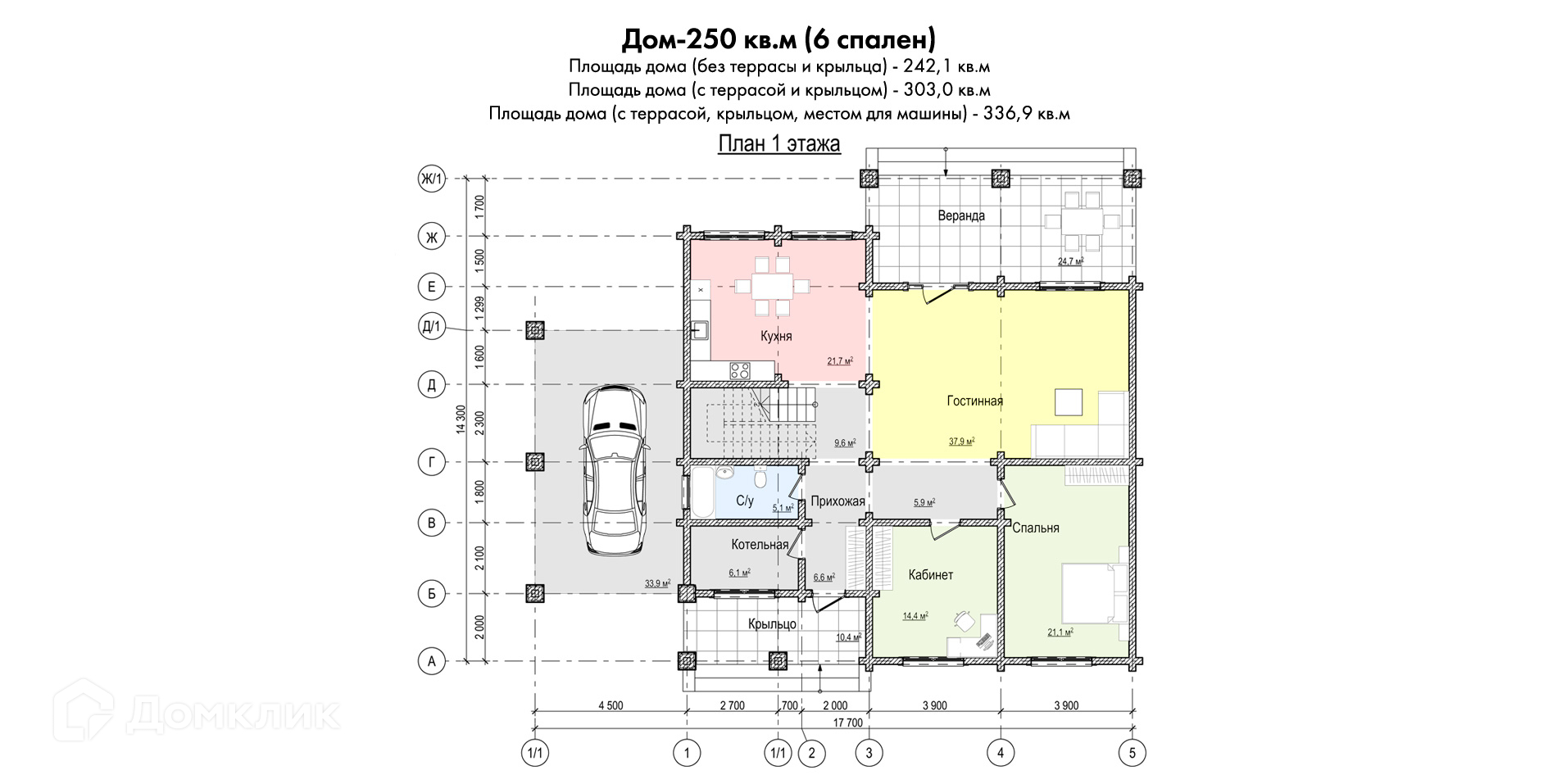 из бруса 200х200мм, общая площадь 342 кв.м. (с террасой, крыльцом и местом для машины).