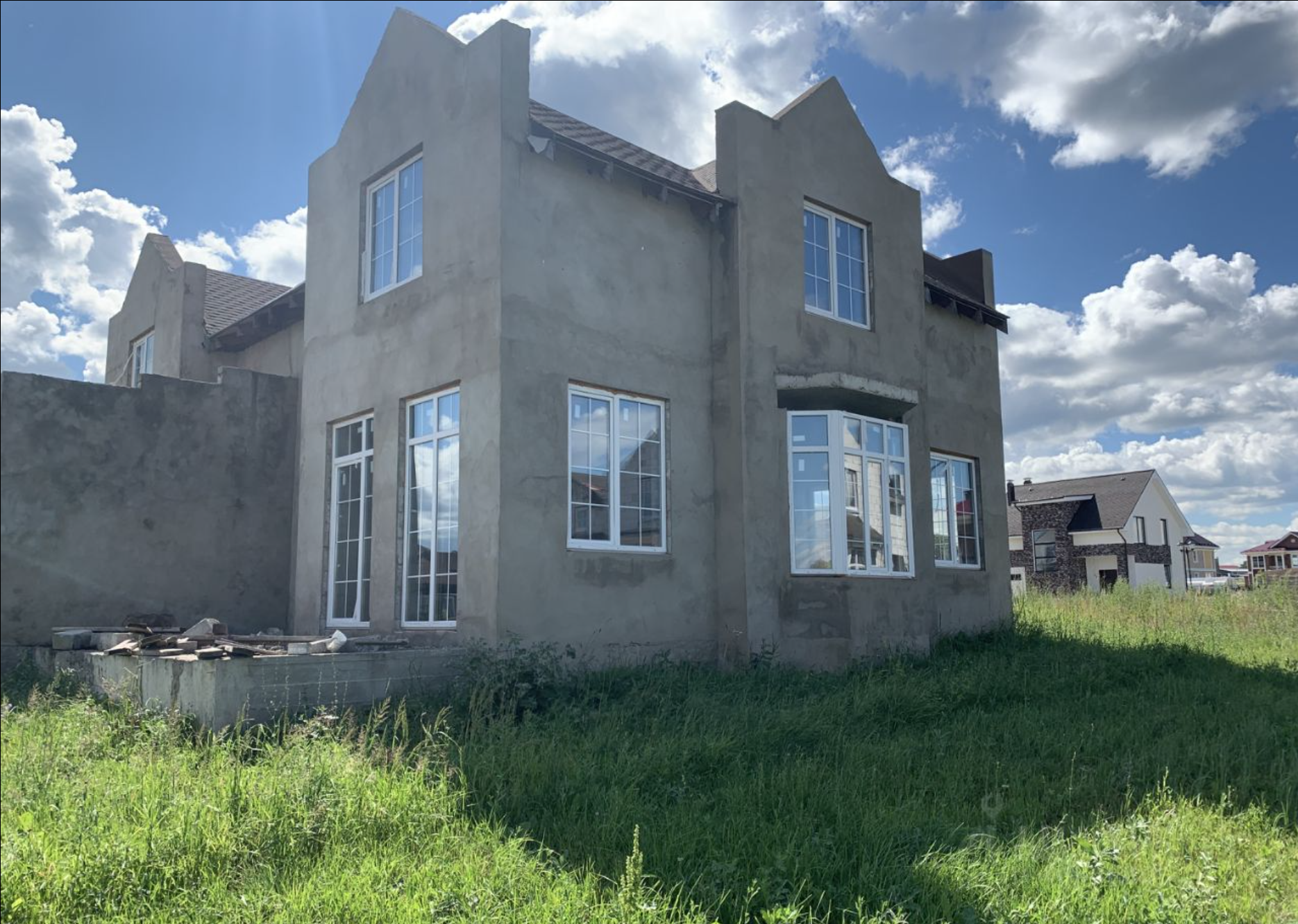 На текущий момент не завершены работы по декоративной отделке фасада, монтажу водосточной системы, устройству отмостки.