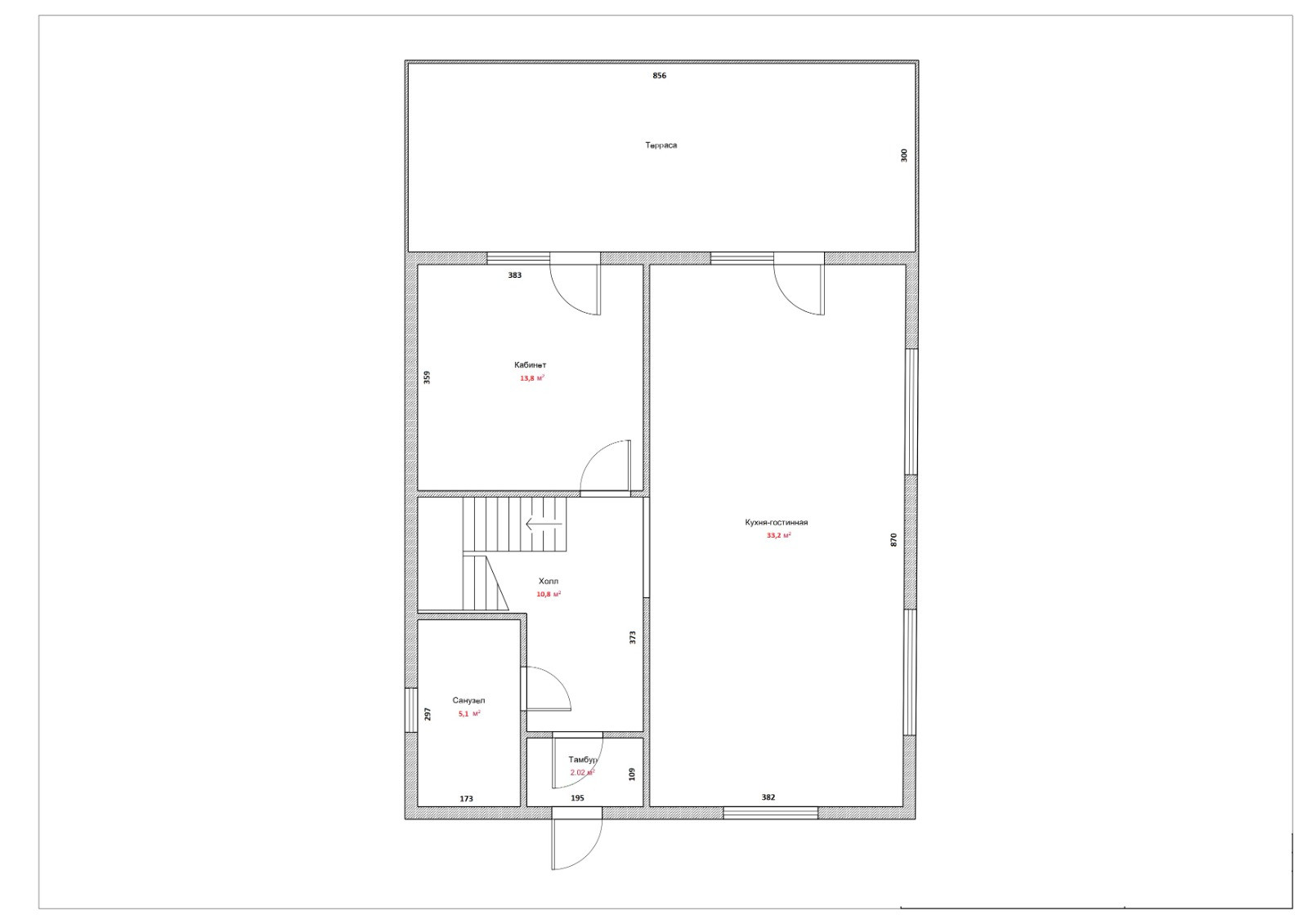 Планировка: первый этаж - гостиная-кухня, котельная, санузел, холл, тамбур, кабинет, просторная терраса, второй этаж - санузел, три спальни