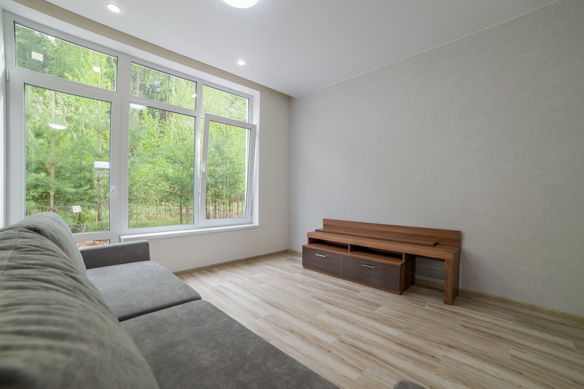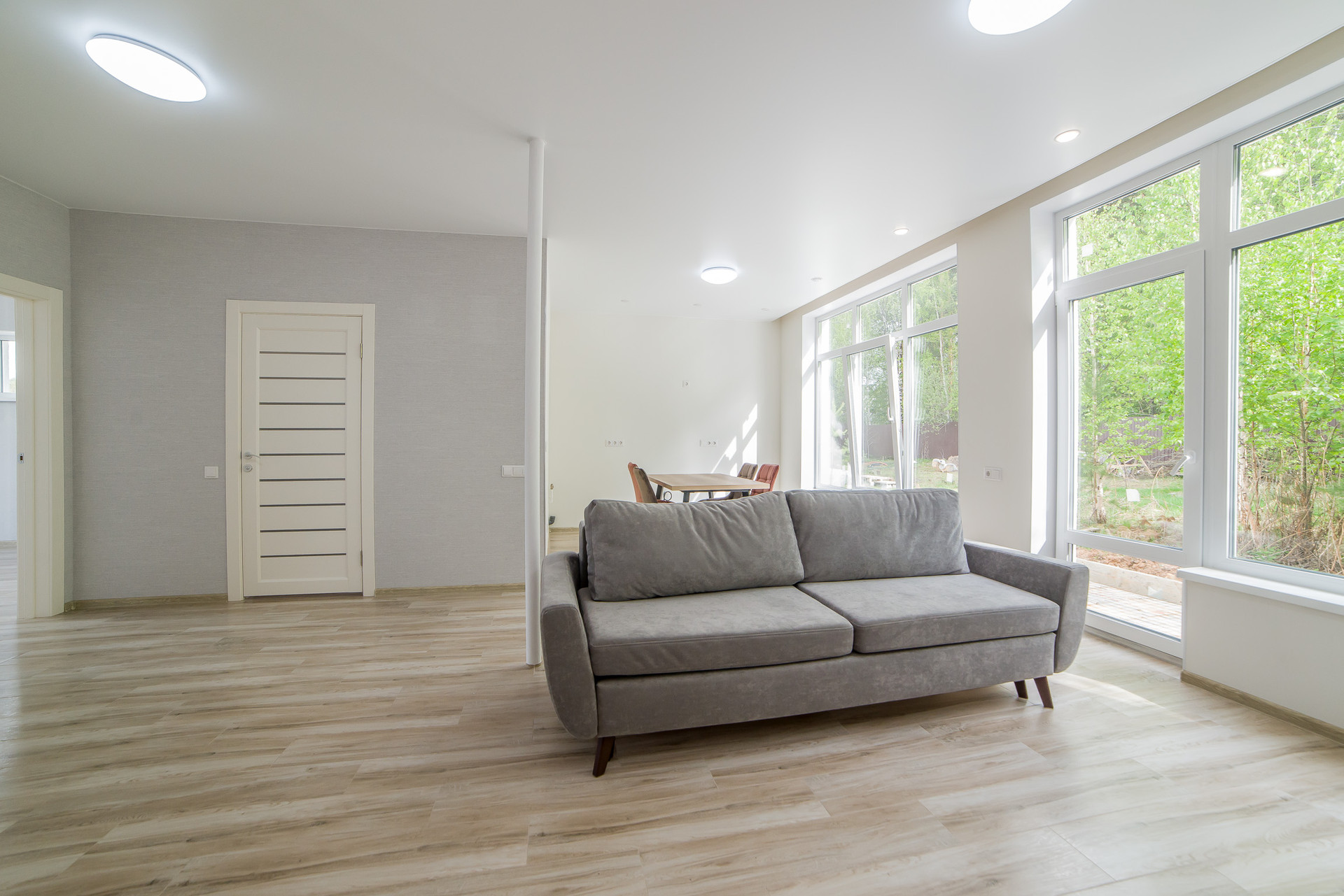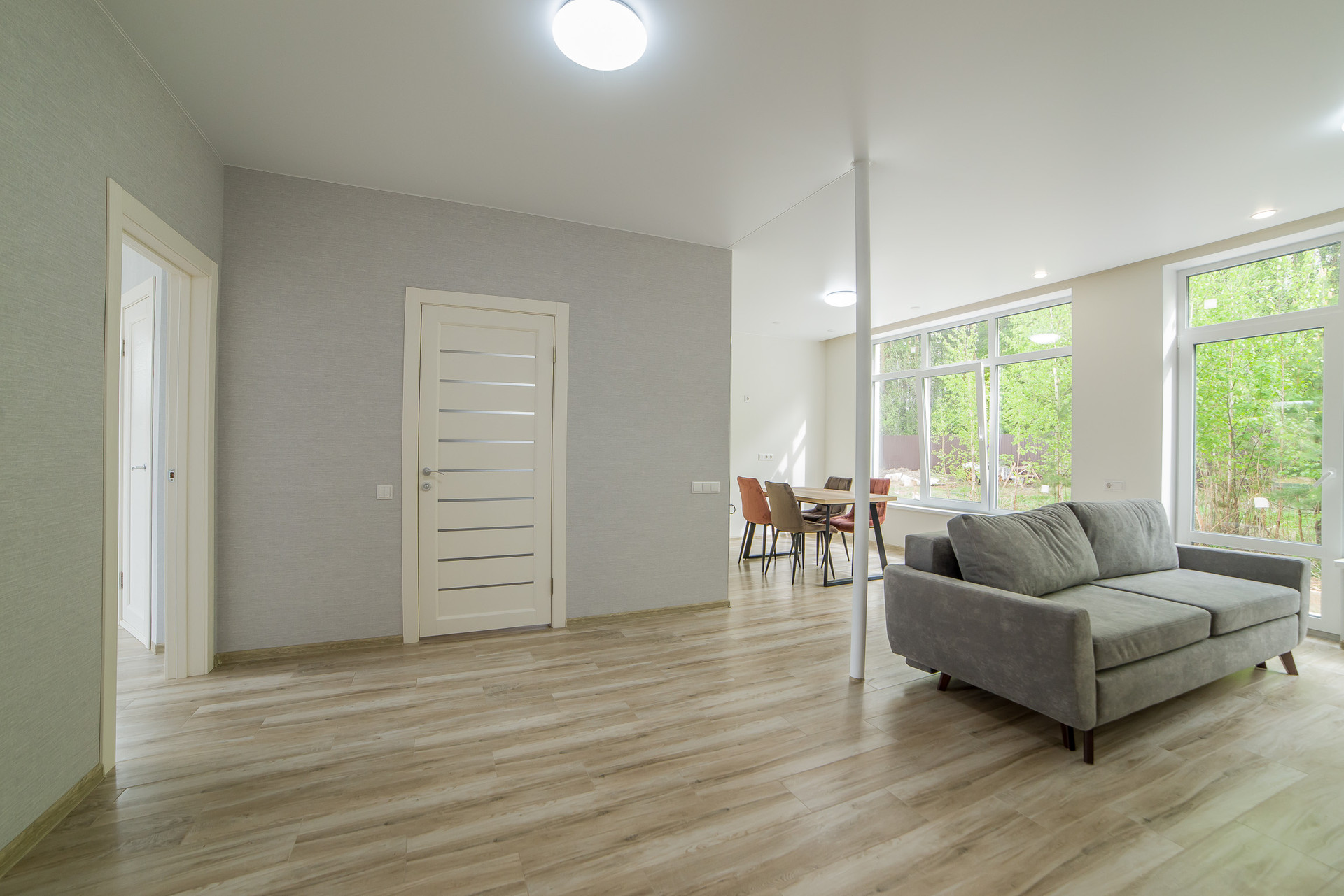 Просторная гостиная-кухня, санузел, холл, терраса с выходом в лес, две спальни