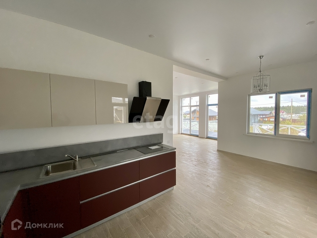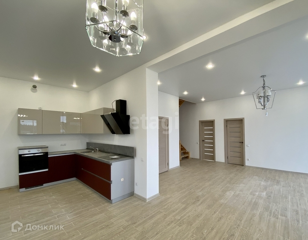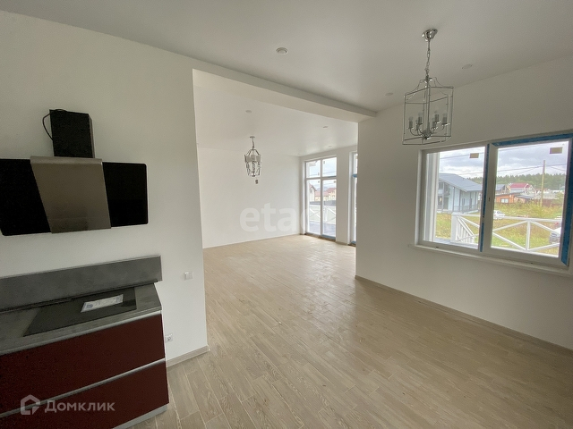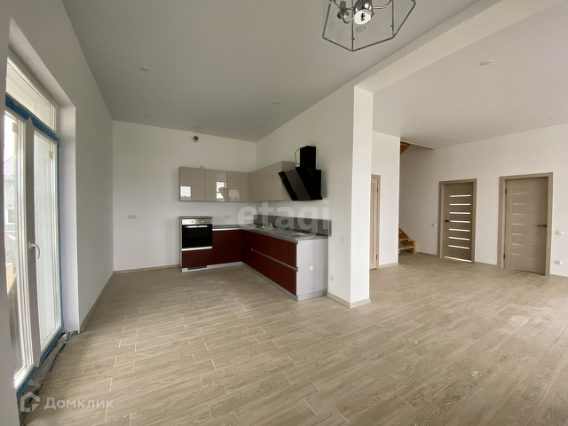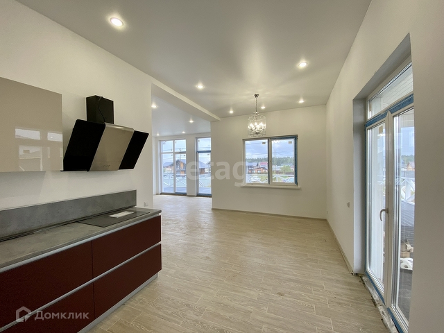 В доме будет сделана сделана отделка под ключ. На первом этаже большая кухня с выходом на террасу, комната и гостиная. Кухня будет оборудована всей необходимой техникой и шкафчиками.