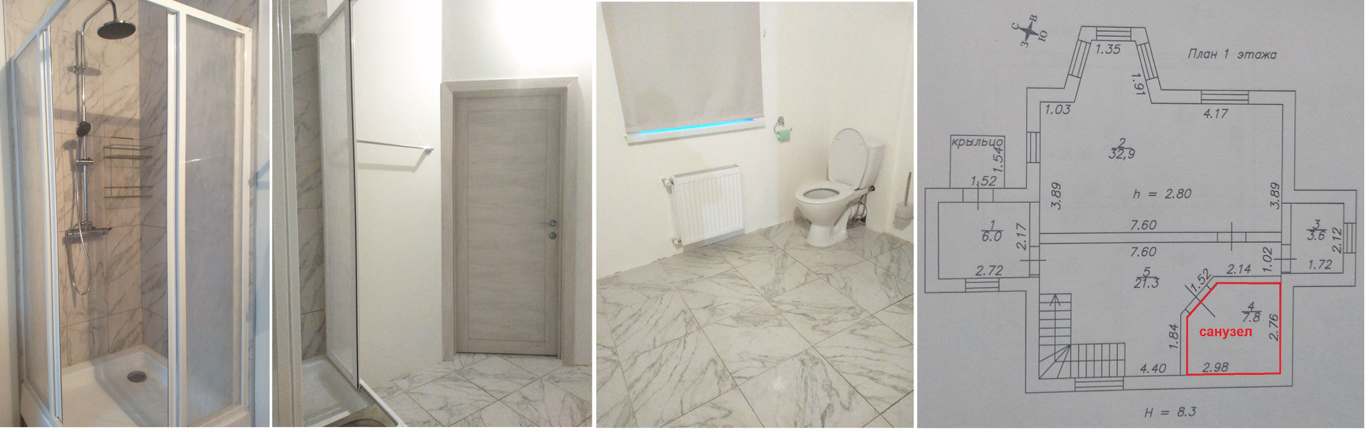 В санузле установлена душевая кабина Ravak (производство Чехия) с лейкой и тропическим душем. Готовы коммуникации для ванны, стиральной и сушильной машин. Унитаз и раковина установлены и работают.