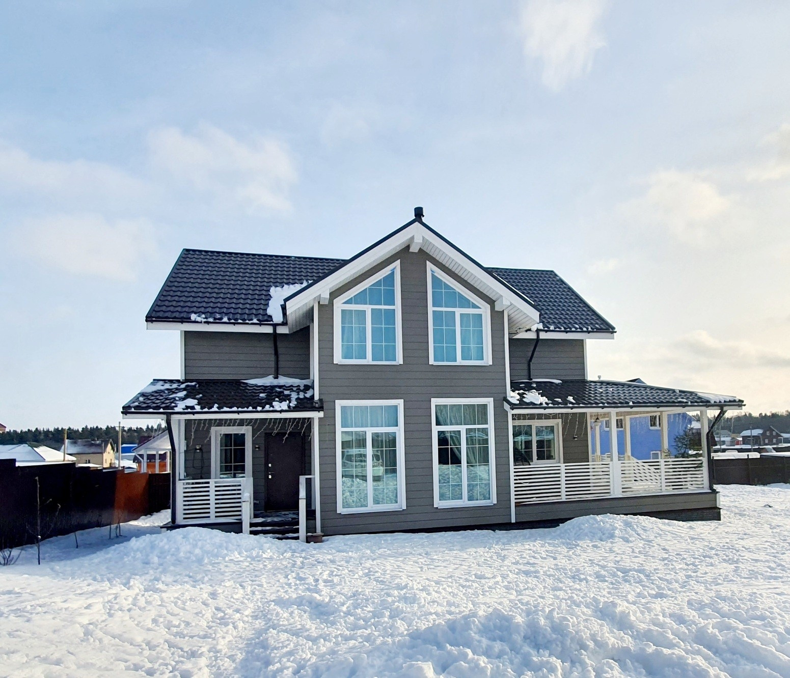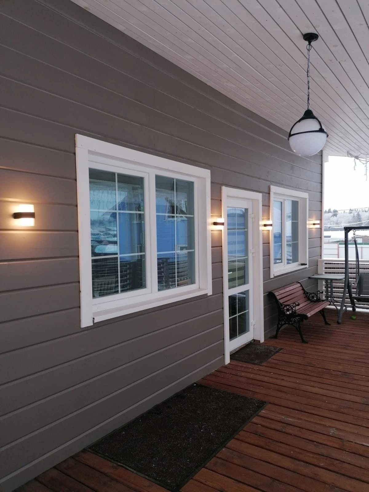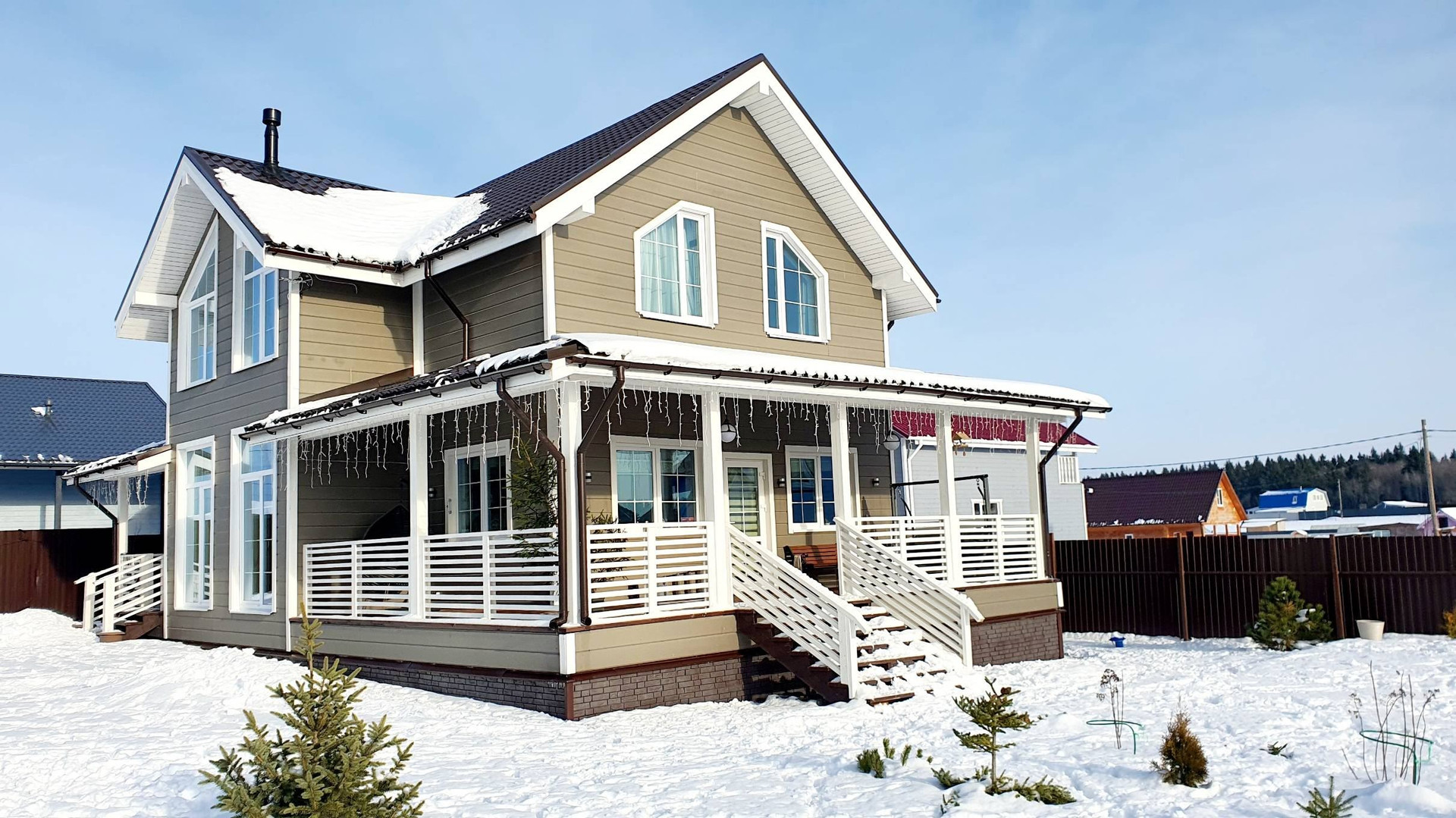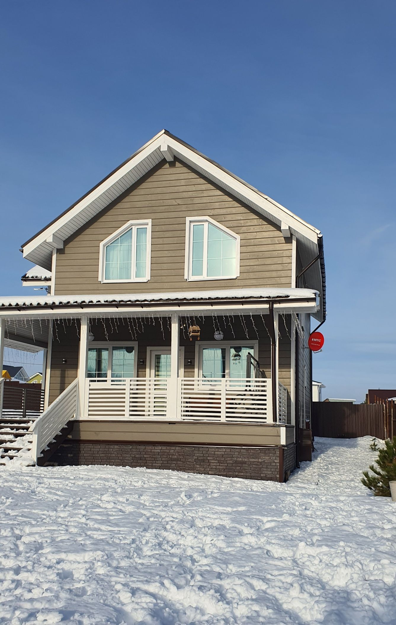 Дом стоит на винтовых сваях, стены каркасные с утеплением 200 мм, кровля - металлочерепица (утепление 250 мм). Наружняя отделка дома - имитация бруса, окрашен Tikkurila, установлены энергосберегающие стеклопакеты, входная металлическая дверь. Внутренняя отделка - имитация бруса, полы на первом этаже керамогранит, на втором - ламинат. Отопление дома - электрокотёл: на первом этаже водяные полы с подогревом + печь-камин от Invicta, второй этаж - радиаторы.