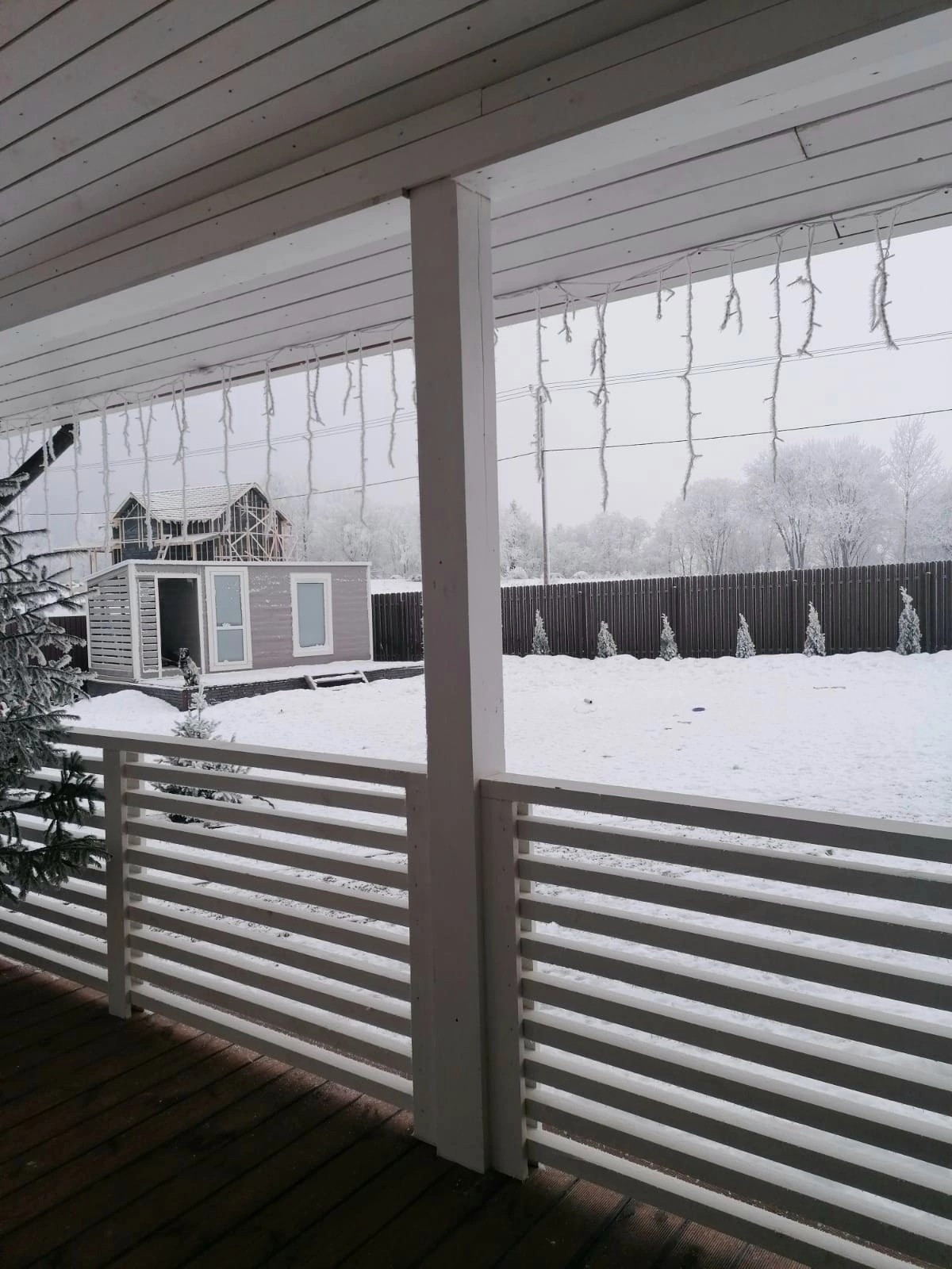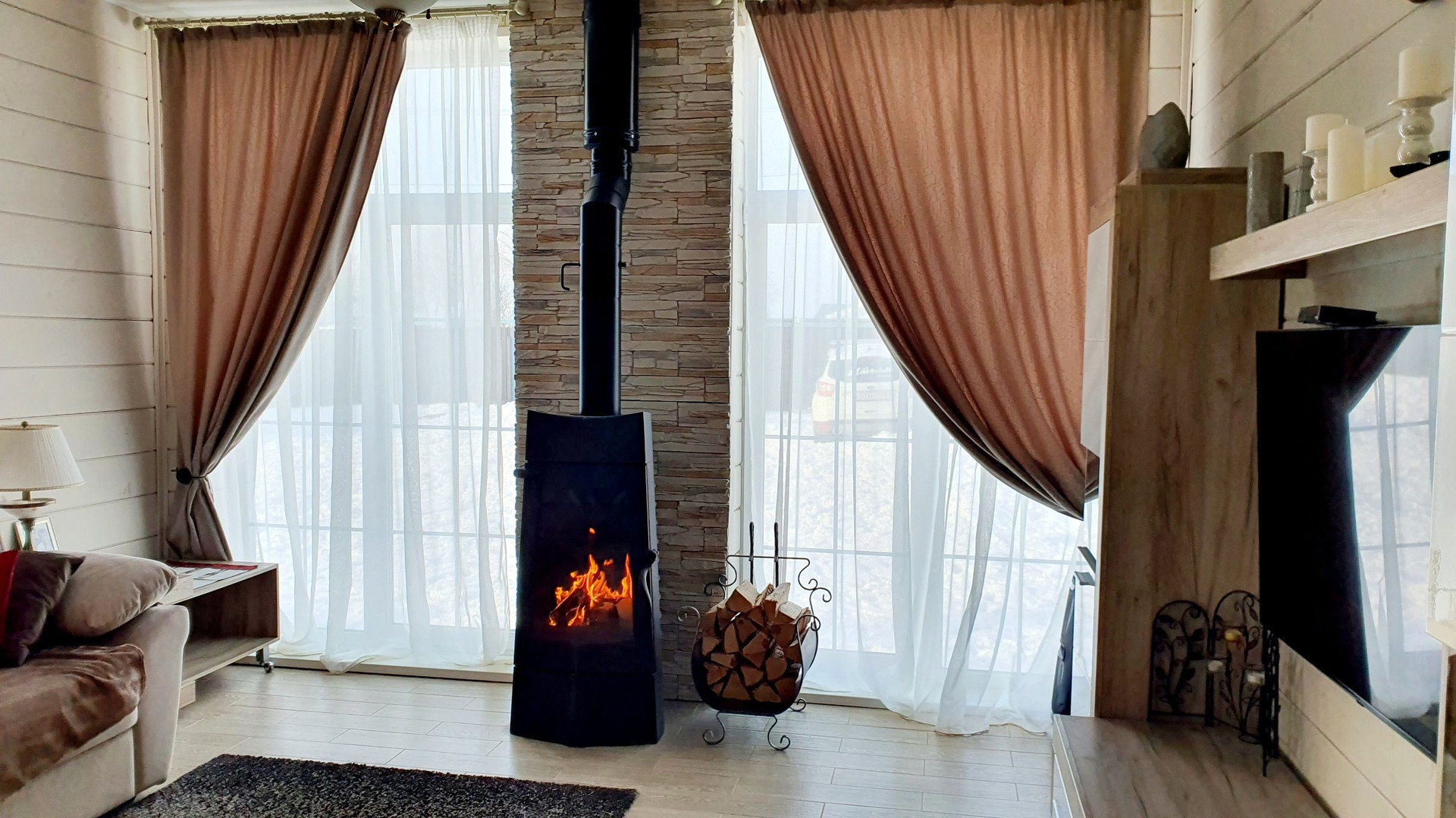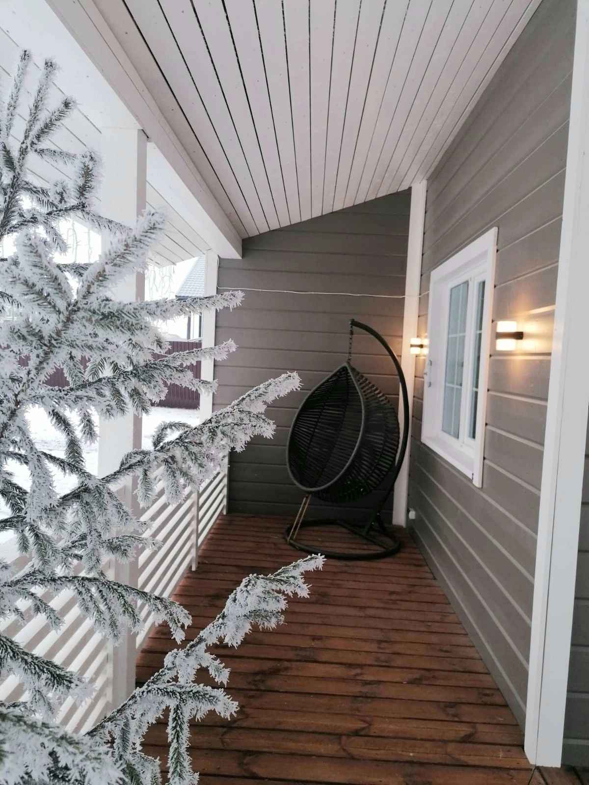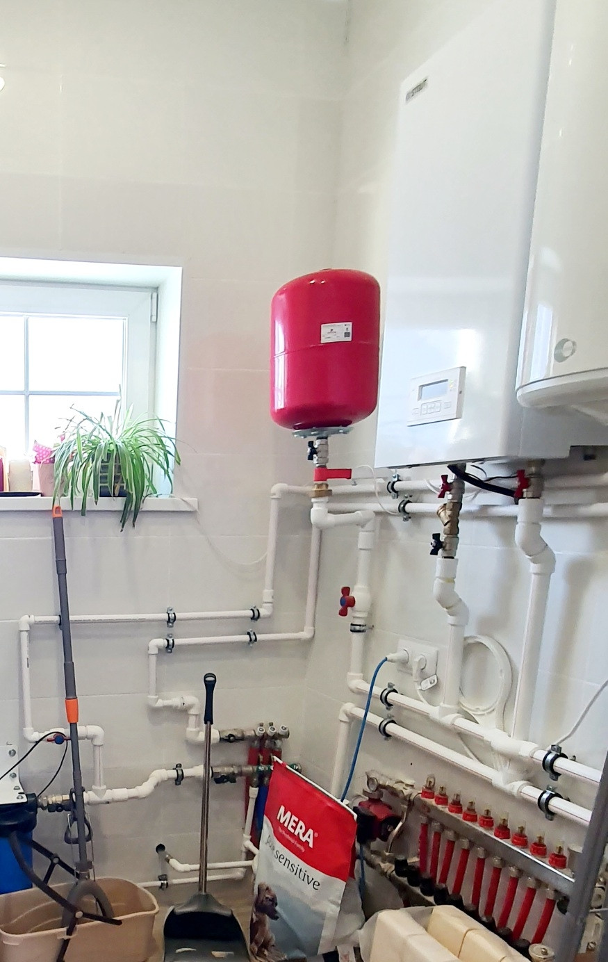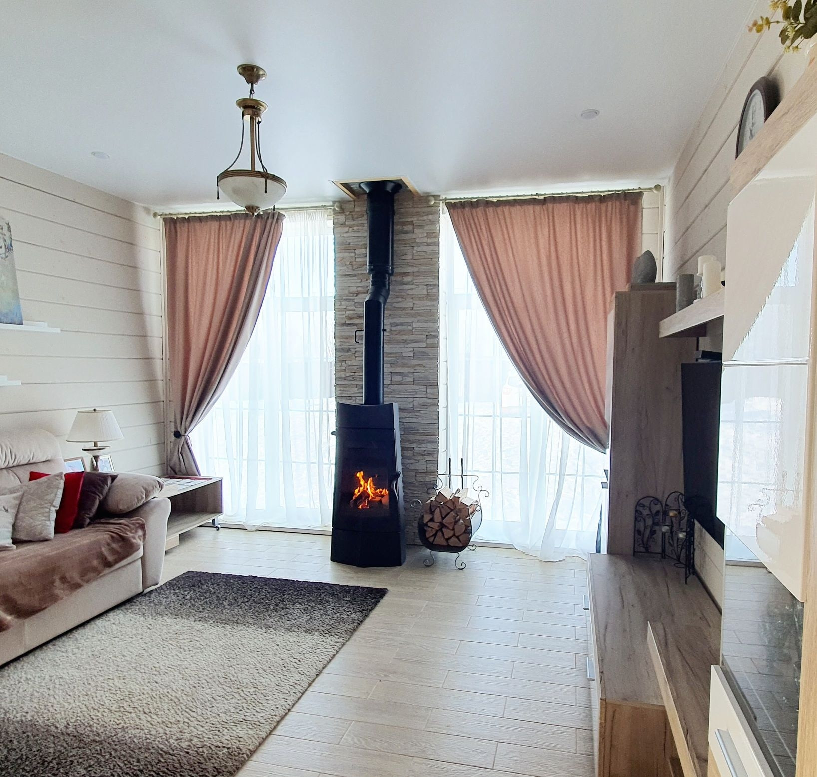 Дом стоит на винтовых сваях, стены каркасные с утеплением 200 мм, кровля - металлочерепица (утепление 250 мм). Наружняя отделка дома - имитация бруса, окрашен Tikkurila, установлены энергосберегающие стеклопакеты, входная металлическая дверь. Внутренняя отделка - имитация бруса, полы на первом этаже керамогранит, на втором - ламинат. Отопление дома - электрокотёл: на первом этаже водяные полы с подогревом + печь-камин от Invicta, второй этаж - радиаторы.