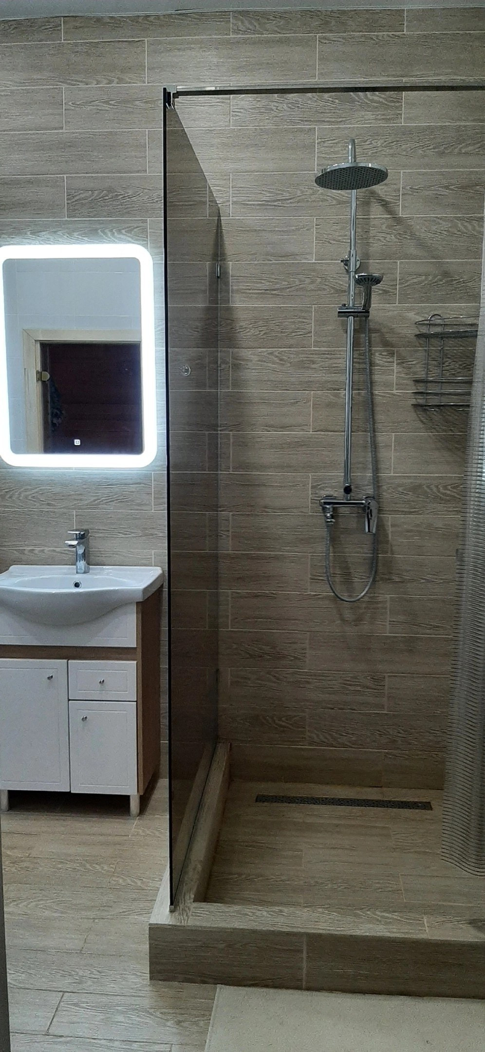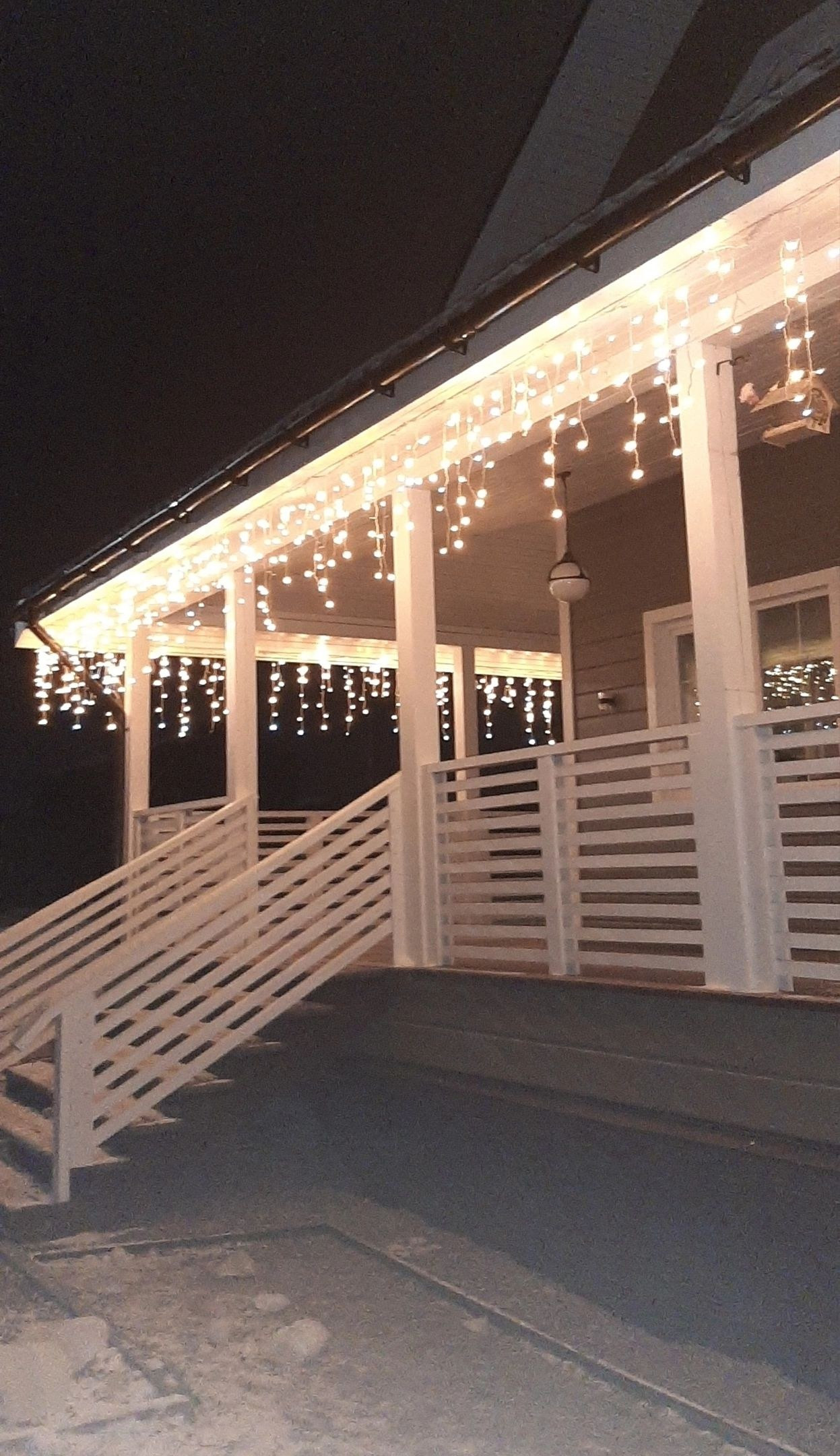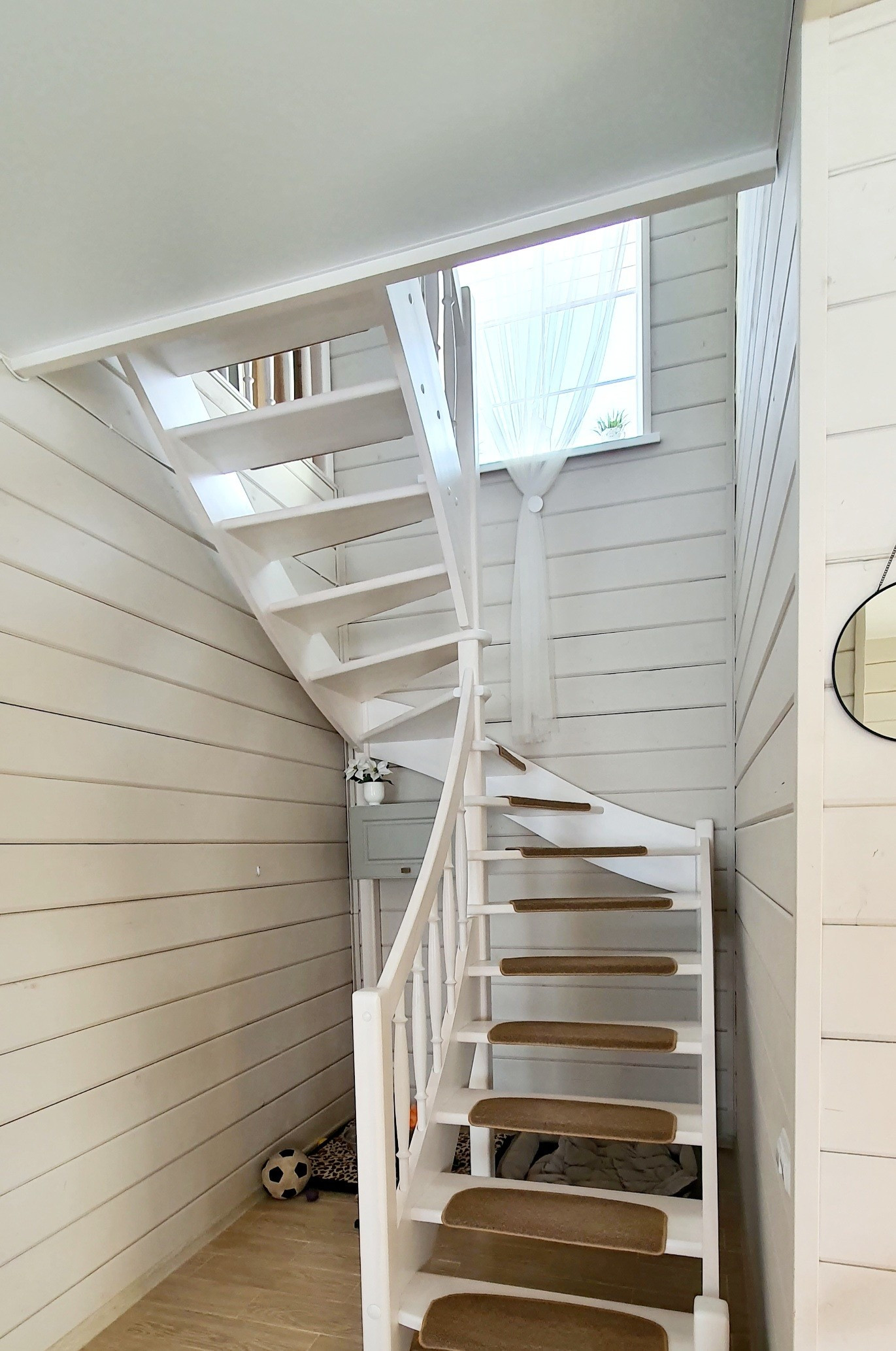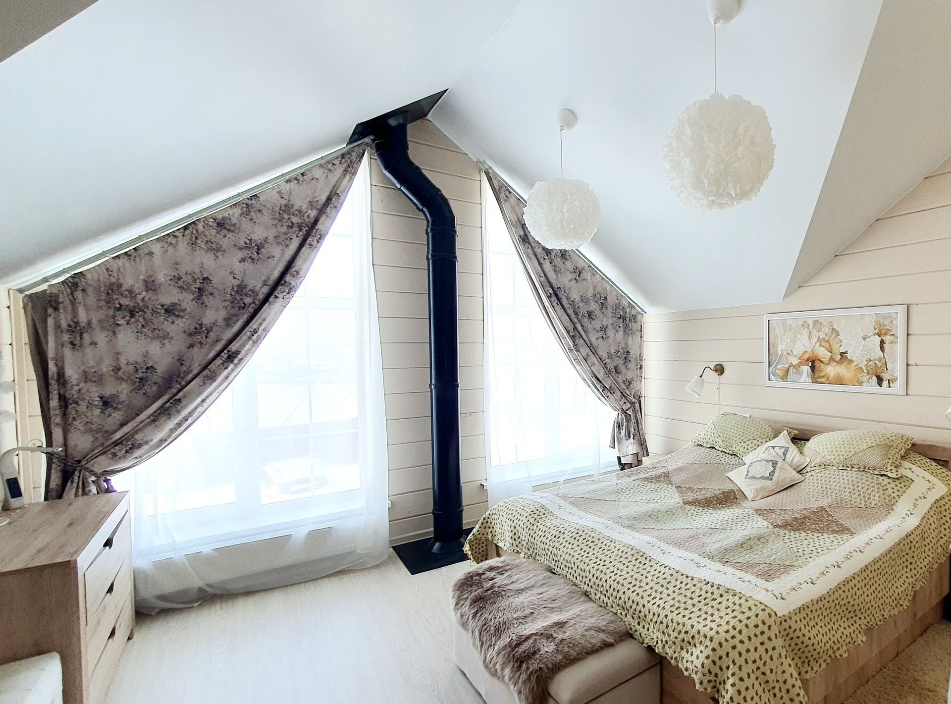 Дом стоит на винтовых сваях, стены каркасные с утеплением 200 мм, кровля - металлочерепица (утепление 250 мм). Наружняя отделка дома - имитация бруса, окрашен Tikkurila, установлены энергосберегающие стеклопакеты, входная металлическая дверь. Внутренняя отделка - имитация бруса, полы на первом этаже керамогранит, на втором - ламинат. Отопление дома - электрокотёл: на первом этаже водяные полы с подогревом + печь-камин от Invicta, второй этаж - радиаторы.