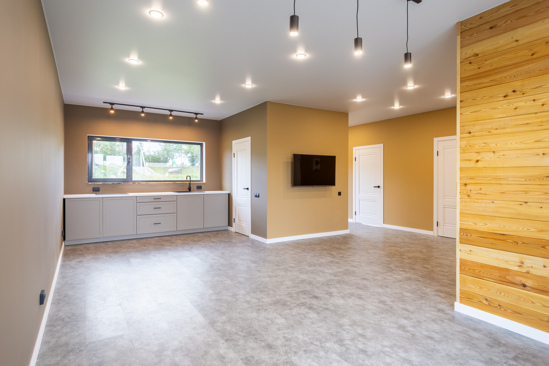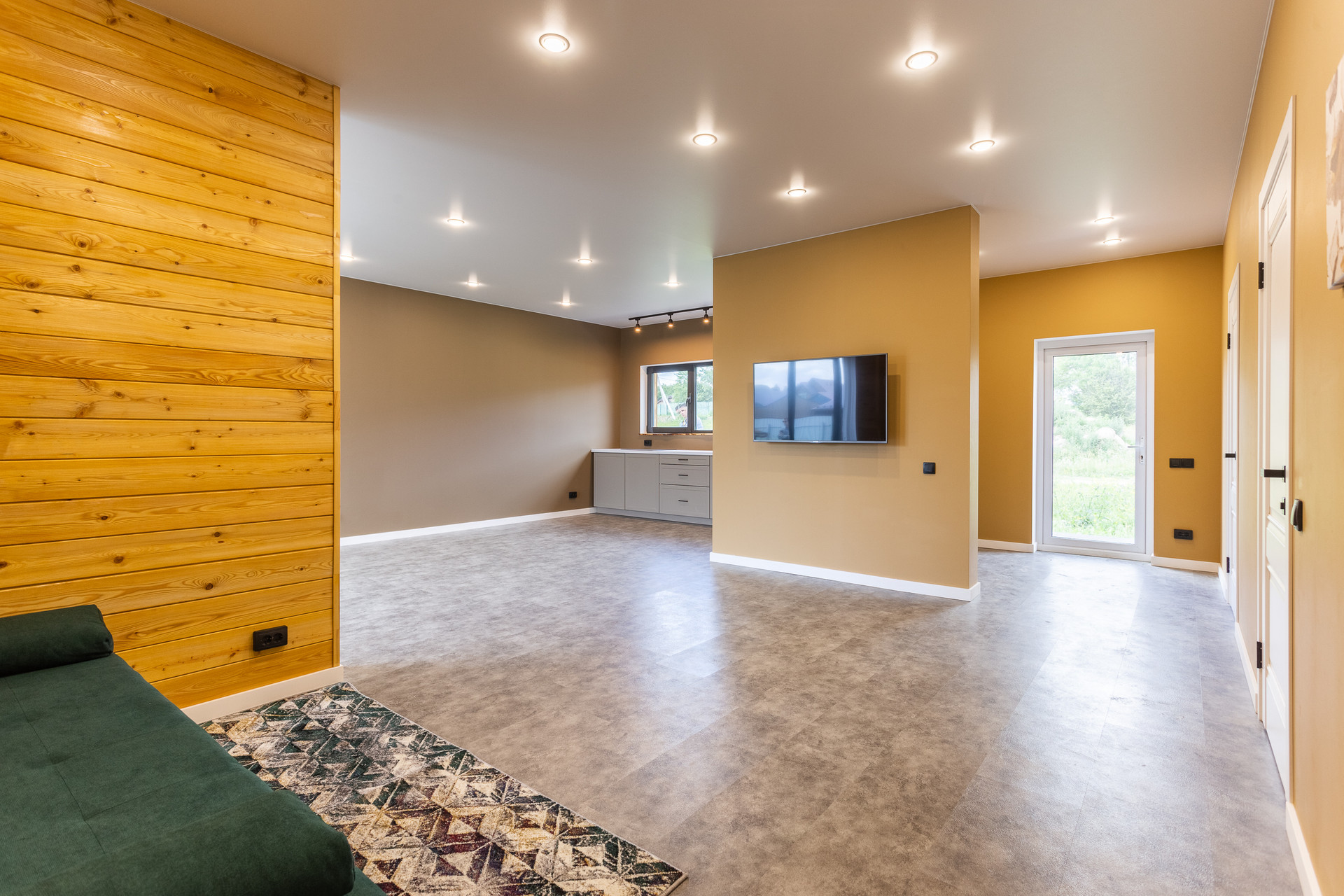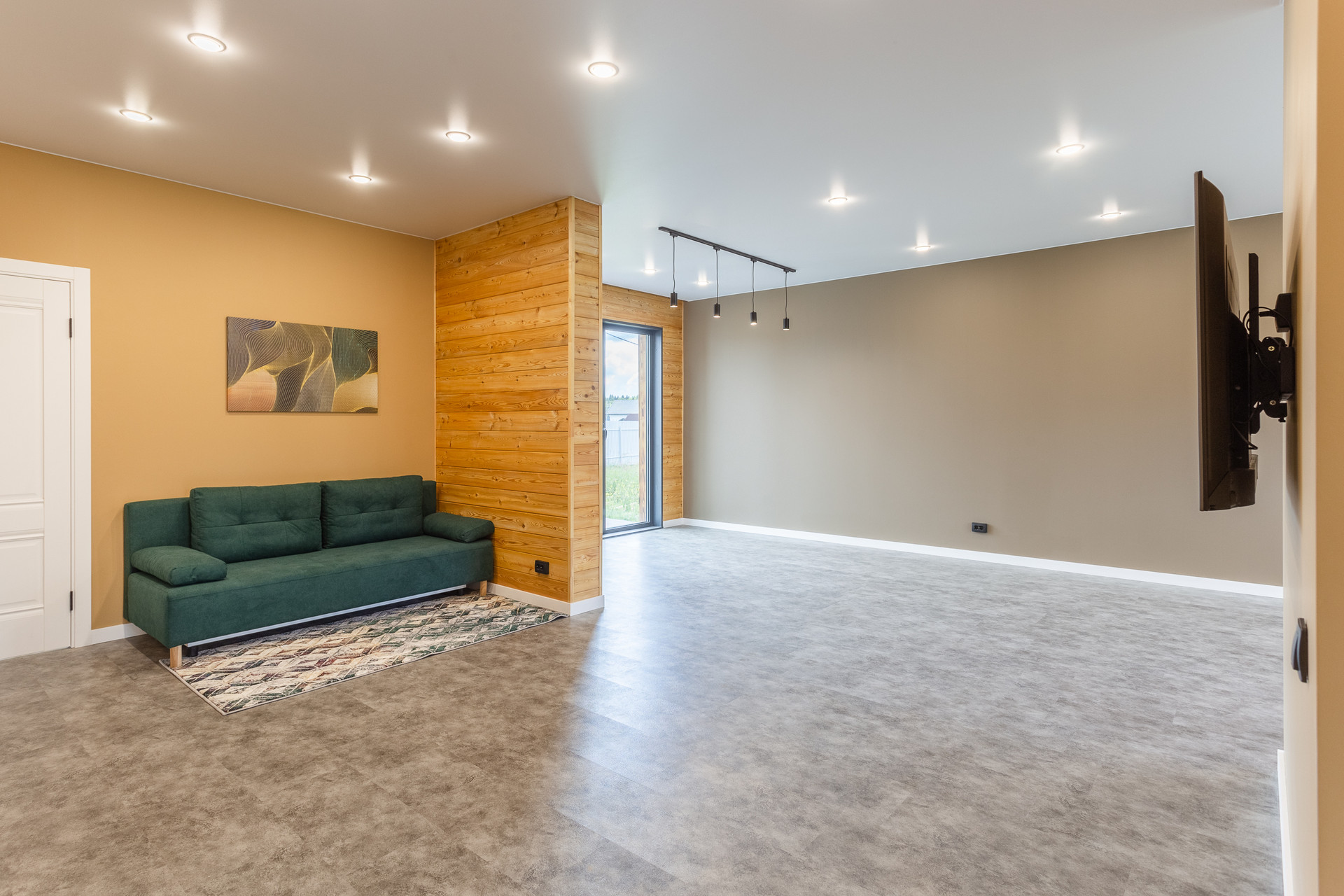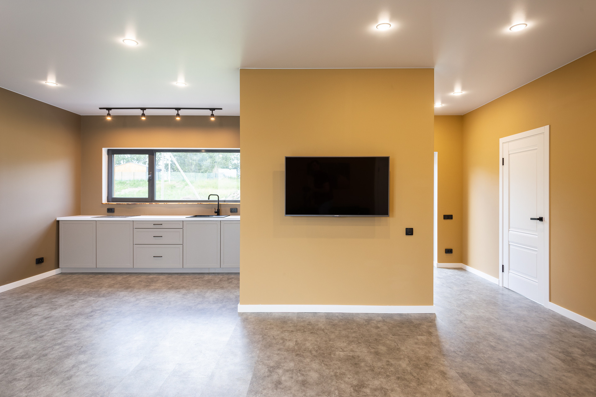 - На полу износостойкий, влагостойкий плотный кварц винил, не трескается, не рассыхается, не боится воды, в санузле - керамогранит/кварц винил.