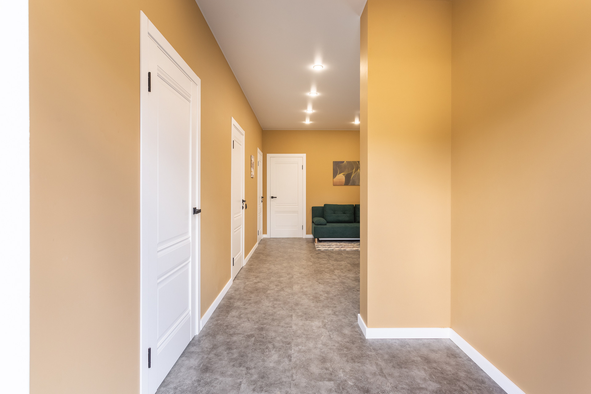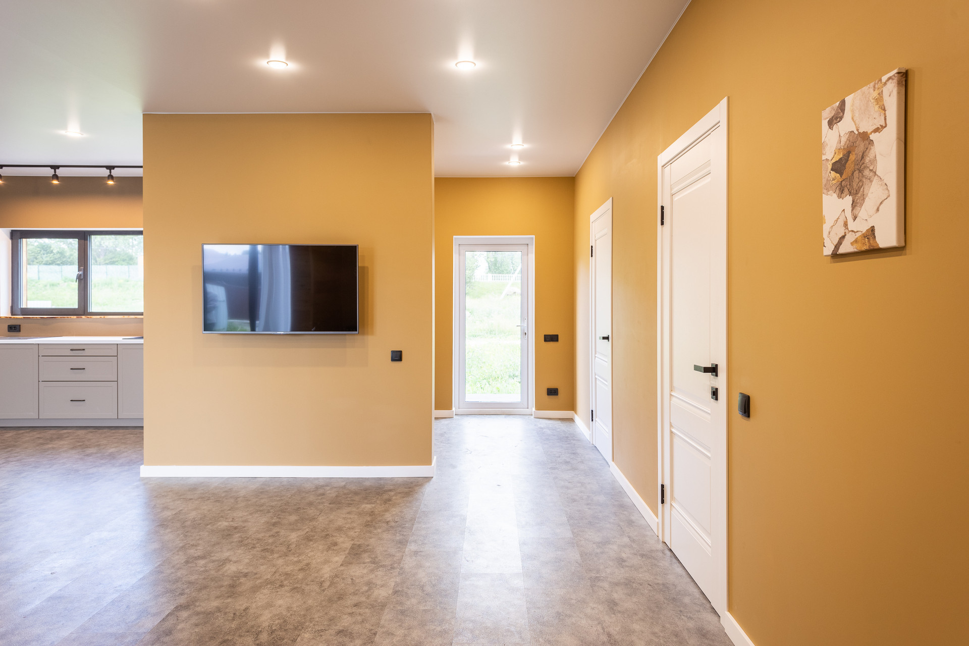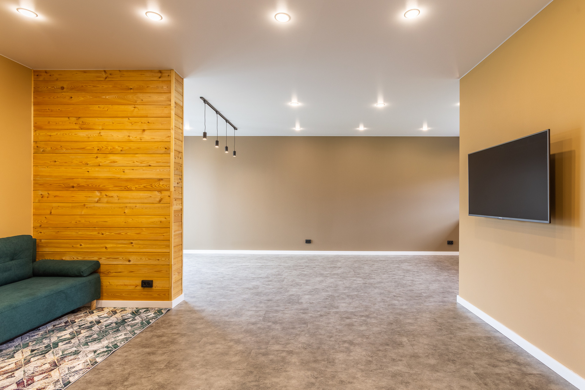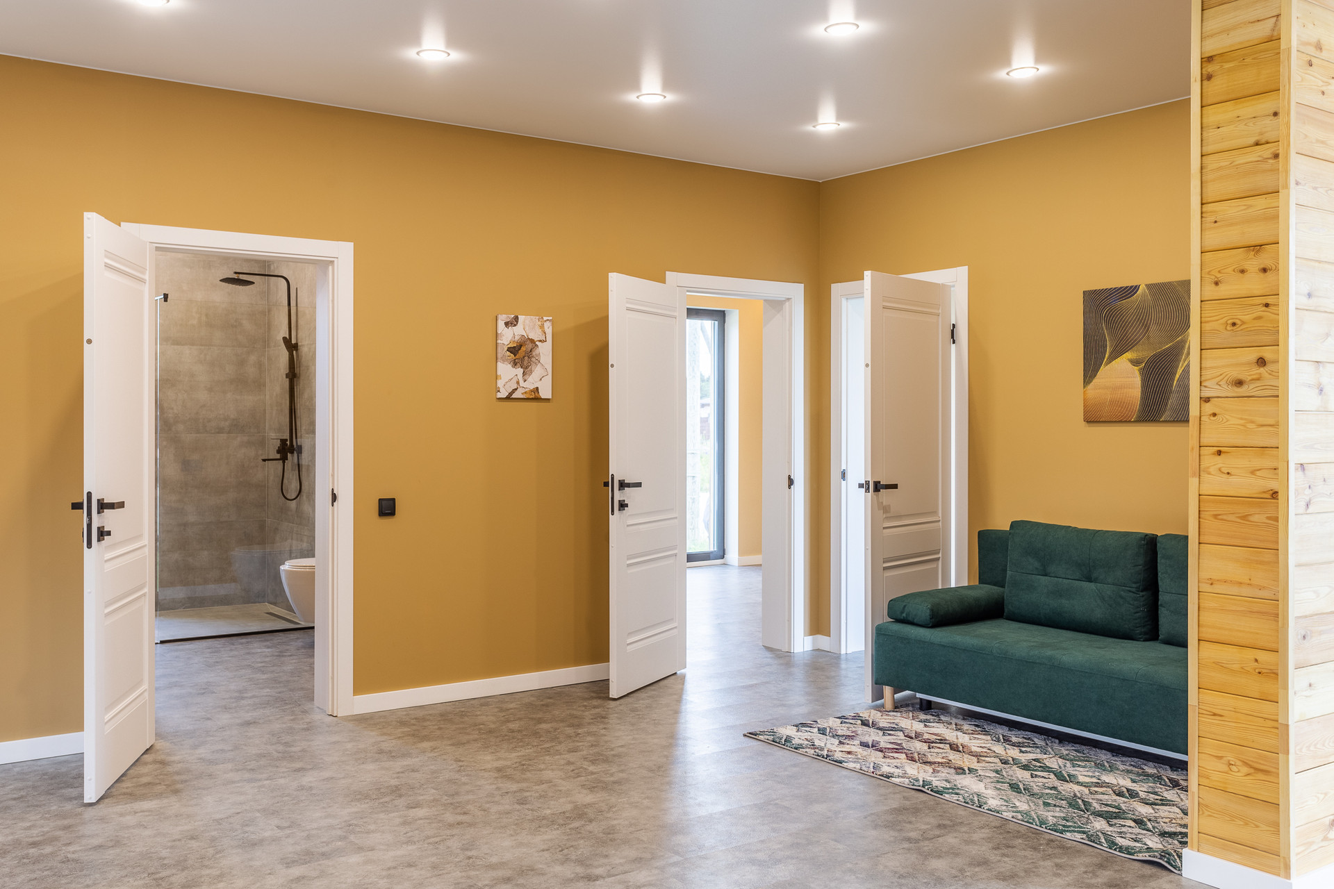 - На полу износостойкий, влагостойкий плотный кварц винил, не трескается, не рассыхается, не боится воды, в санузле - керамогранит/кварц винил.