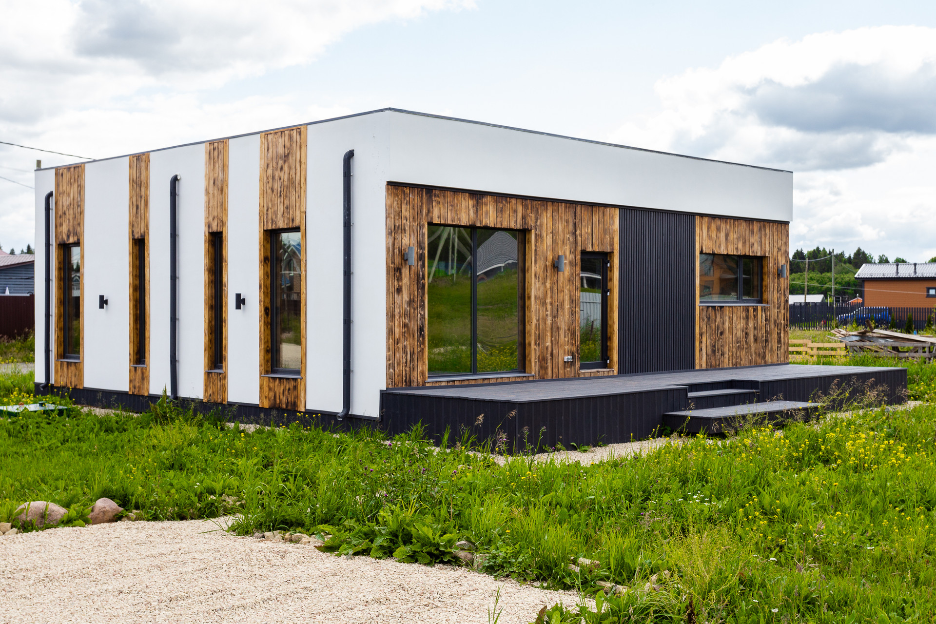 - Пространство дома включает в себя кухню-гостиную, три спальни, ванную комнату и две террасы.
