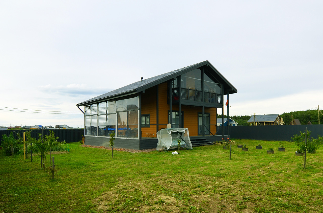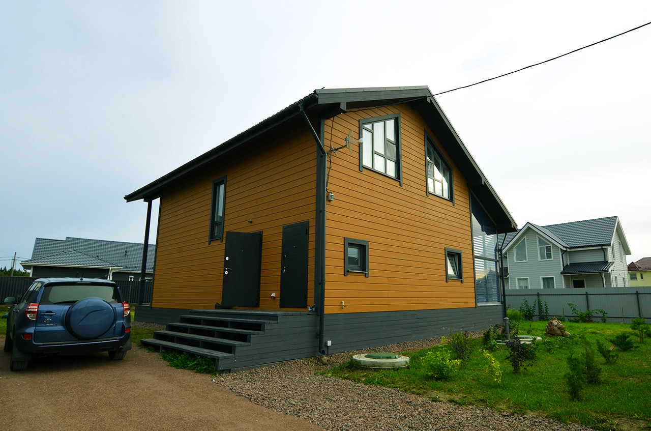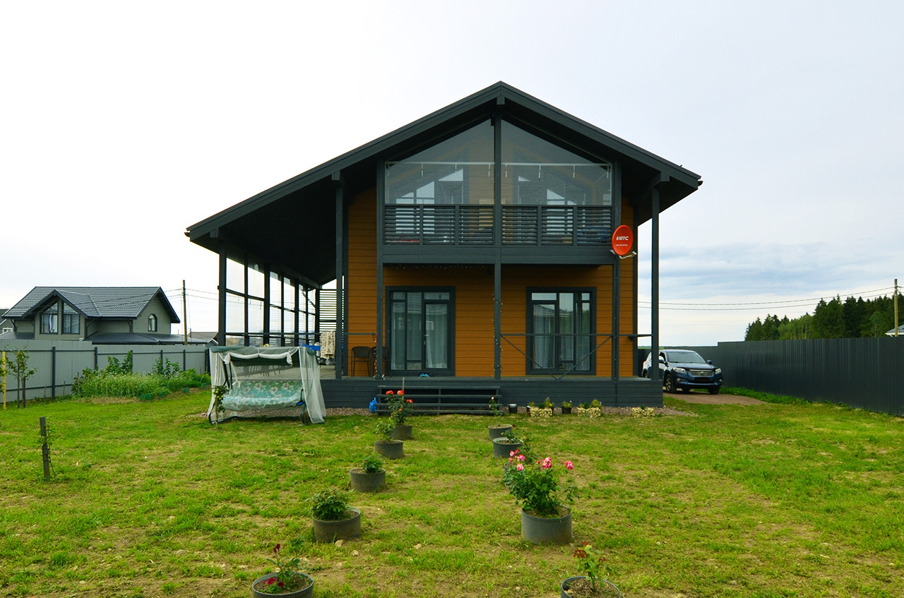 Уютный двухэтажный дом площадью 192,3 кв.м, идеально подходящий для комфортного круглогодичного проживания, построен с применением современной каркасной технологии на надежном свайном фундаменте.