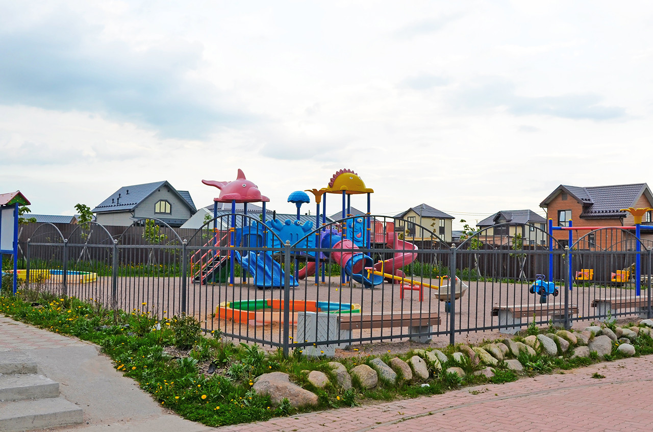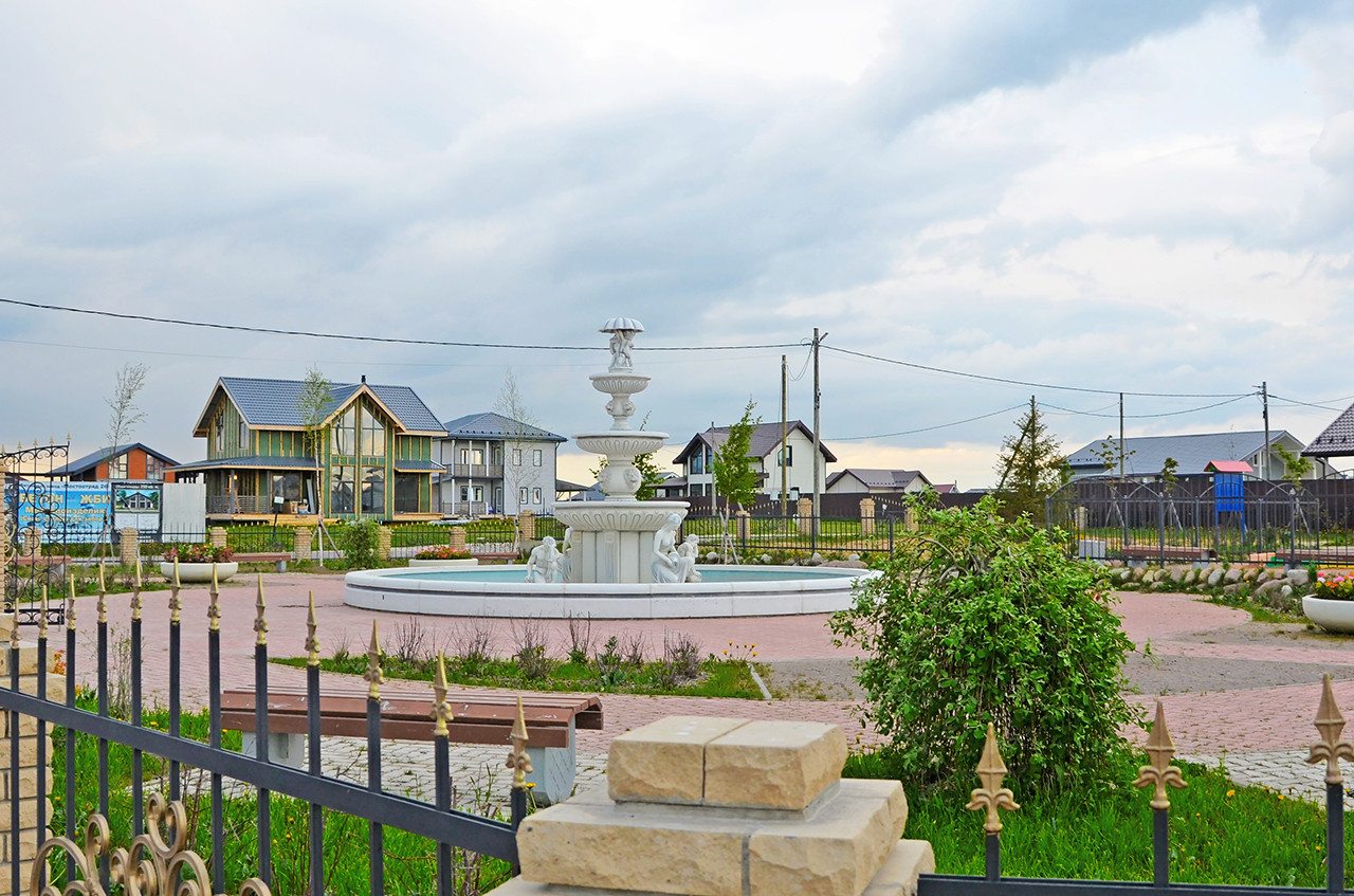 На территории поселка для прогулок создана уютная зона с фонтаном и детской площадкой.