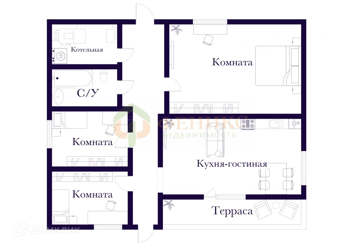 Кухня , уютная и просторная гостиная, 3 изолированные комнаты, холл, с\у, ванна, прихожая, котельная, терраса.