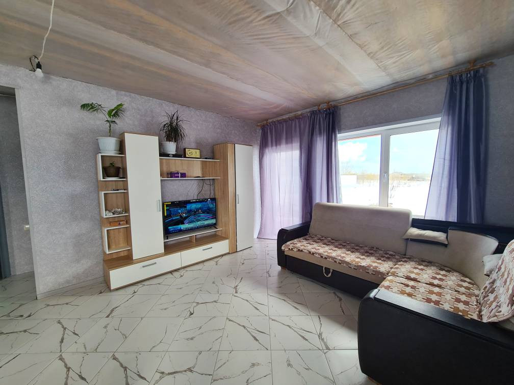 Первый этаж -просторная кухня-гостиная, спальня, холл, совмещенный санузел.