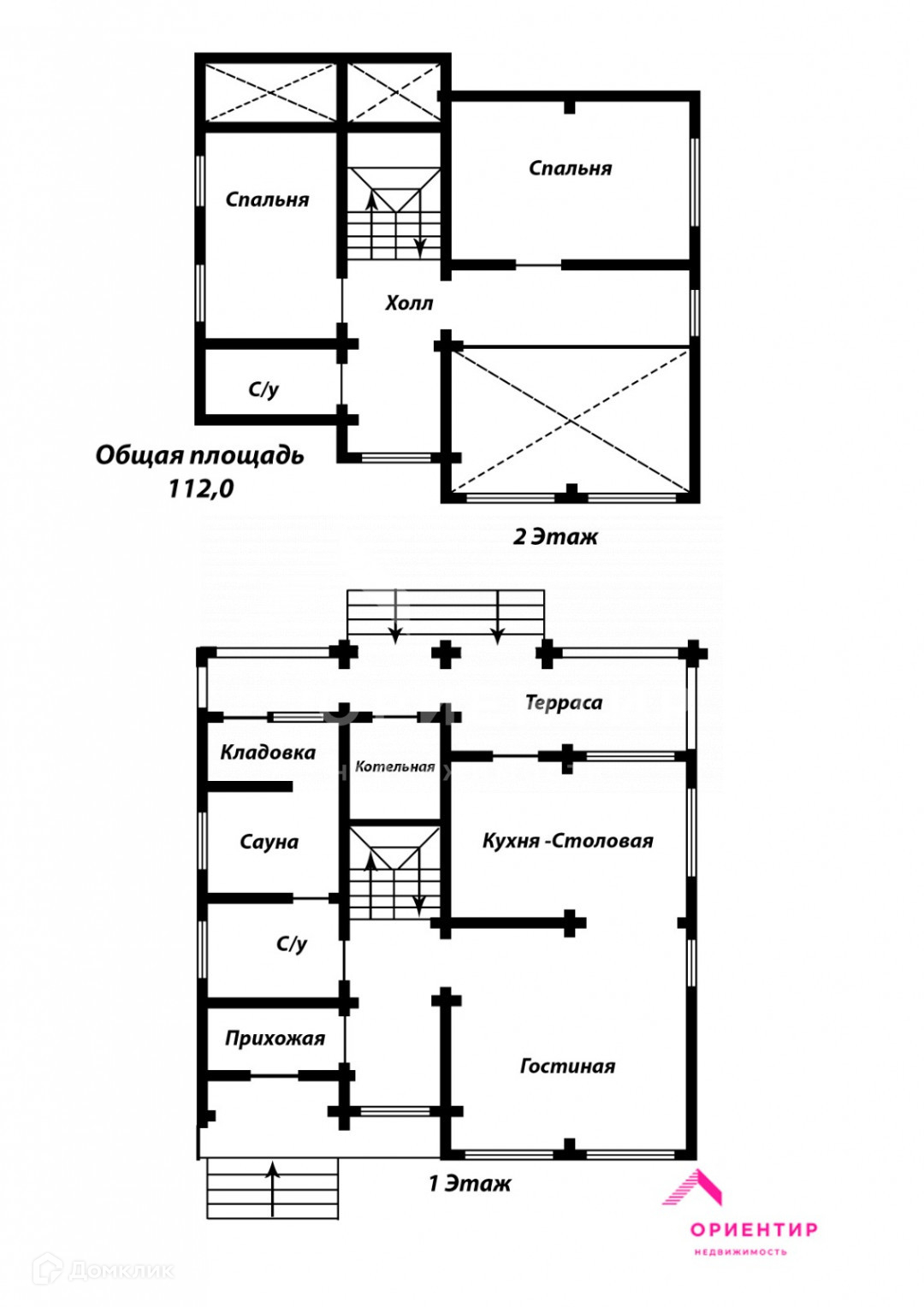 На первом этаже: кухня-столовая, гостиная со вторым светом и камином, санузел с финской сауной, прихожая, терраса и котельная.