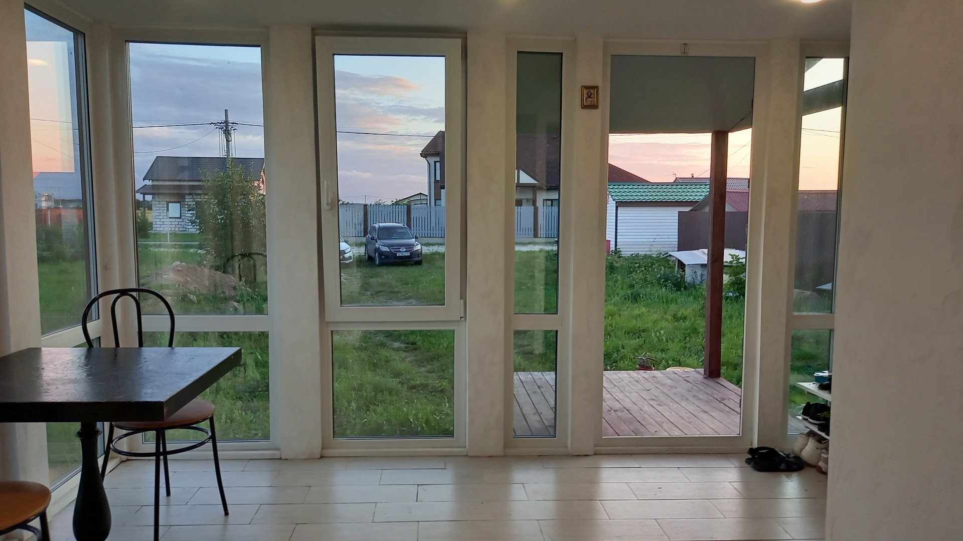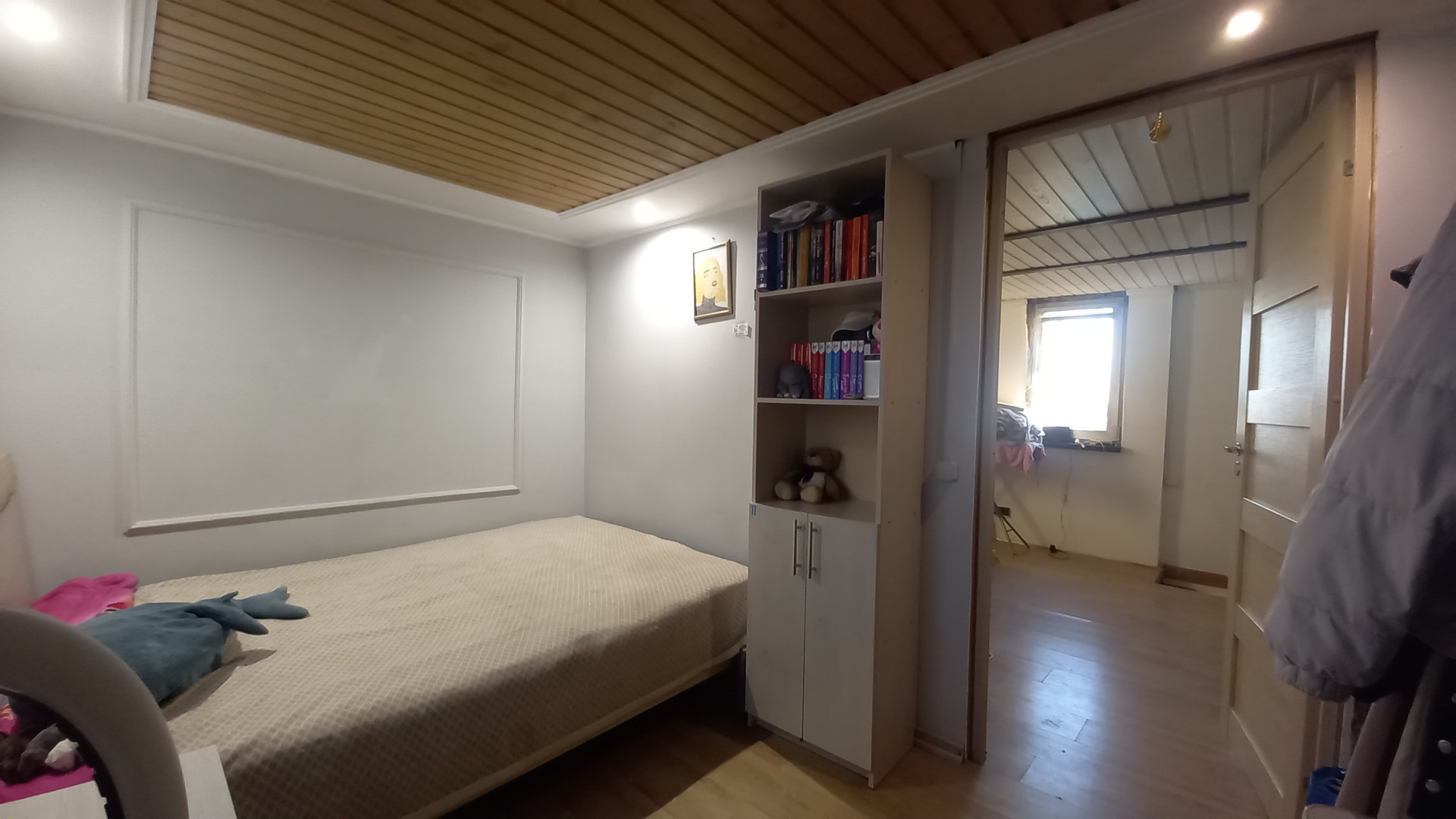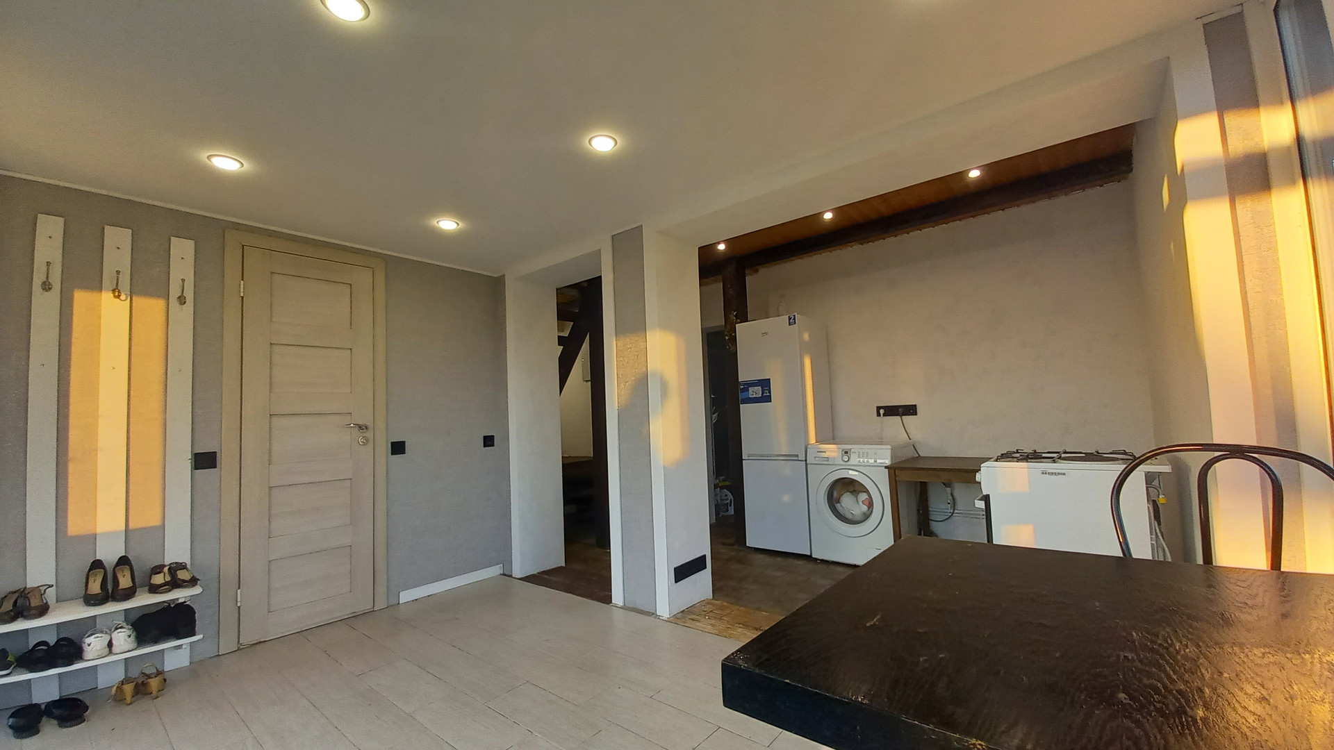 1 этаж - кухня-столовая, гостиная, СУ и комната, можно использовать, как гардеробную.
