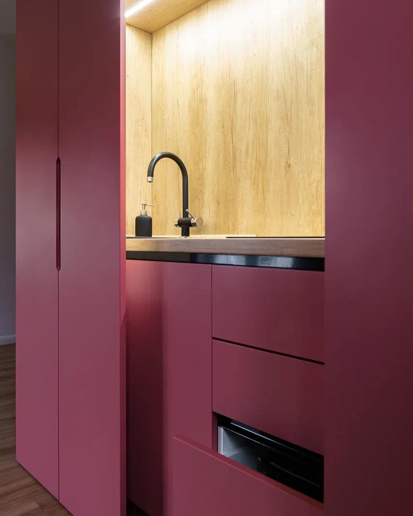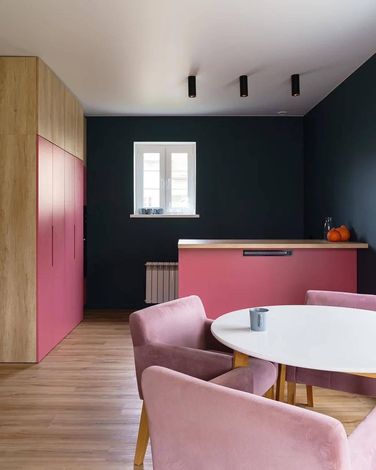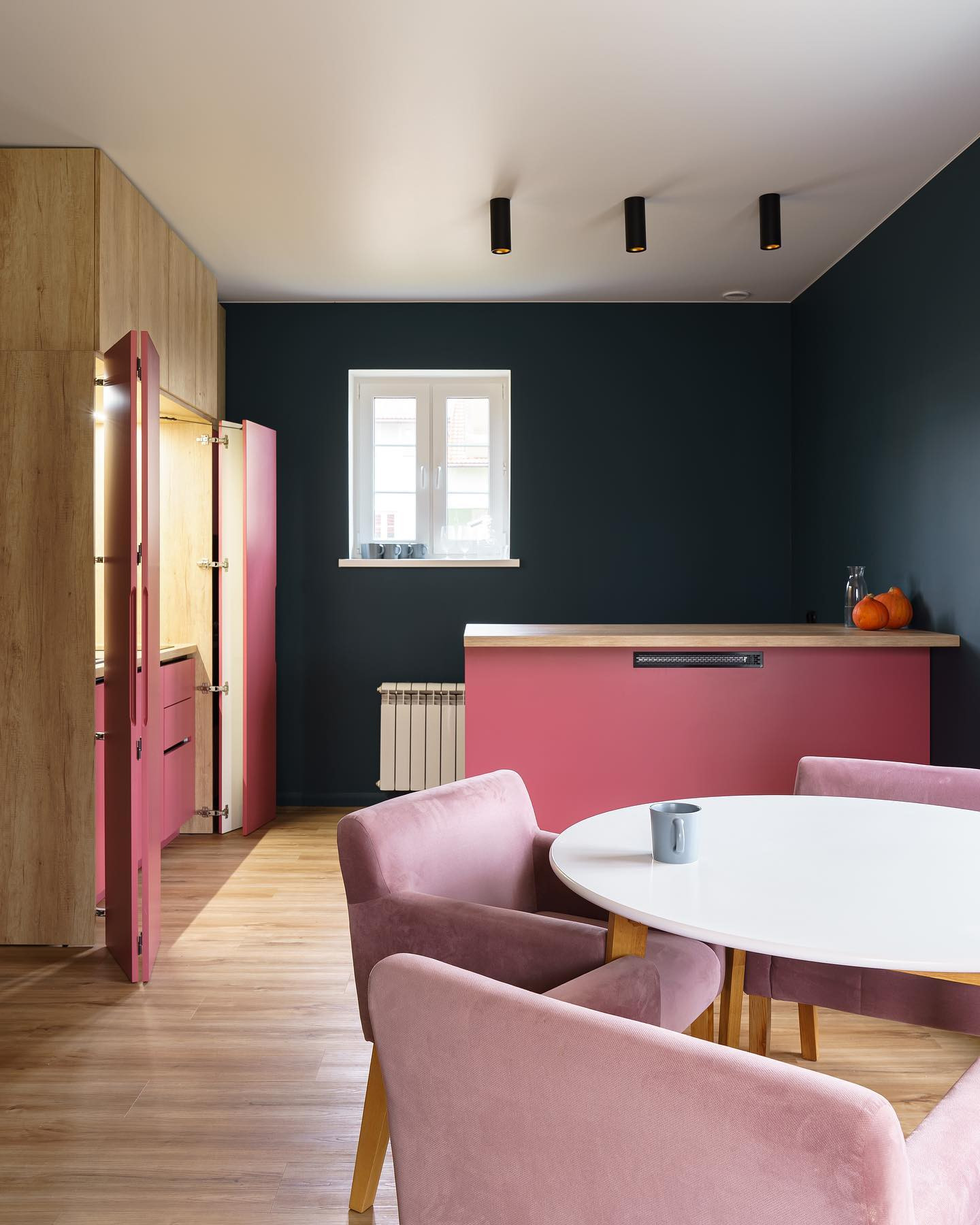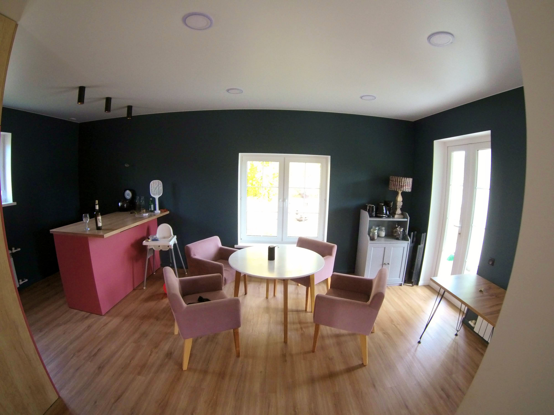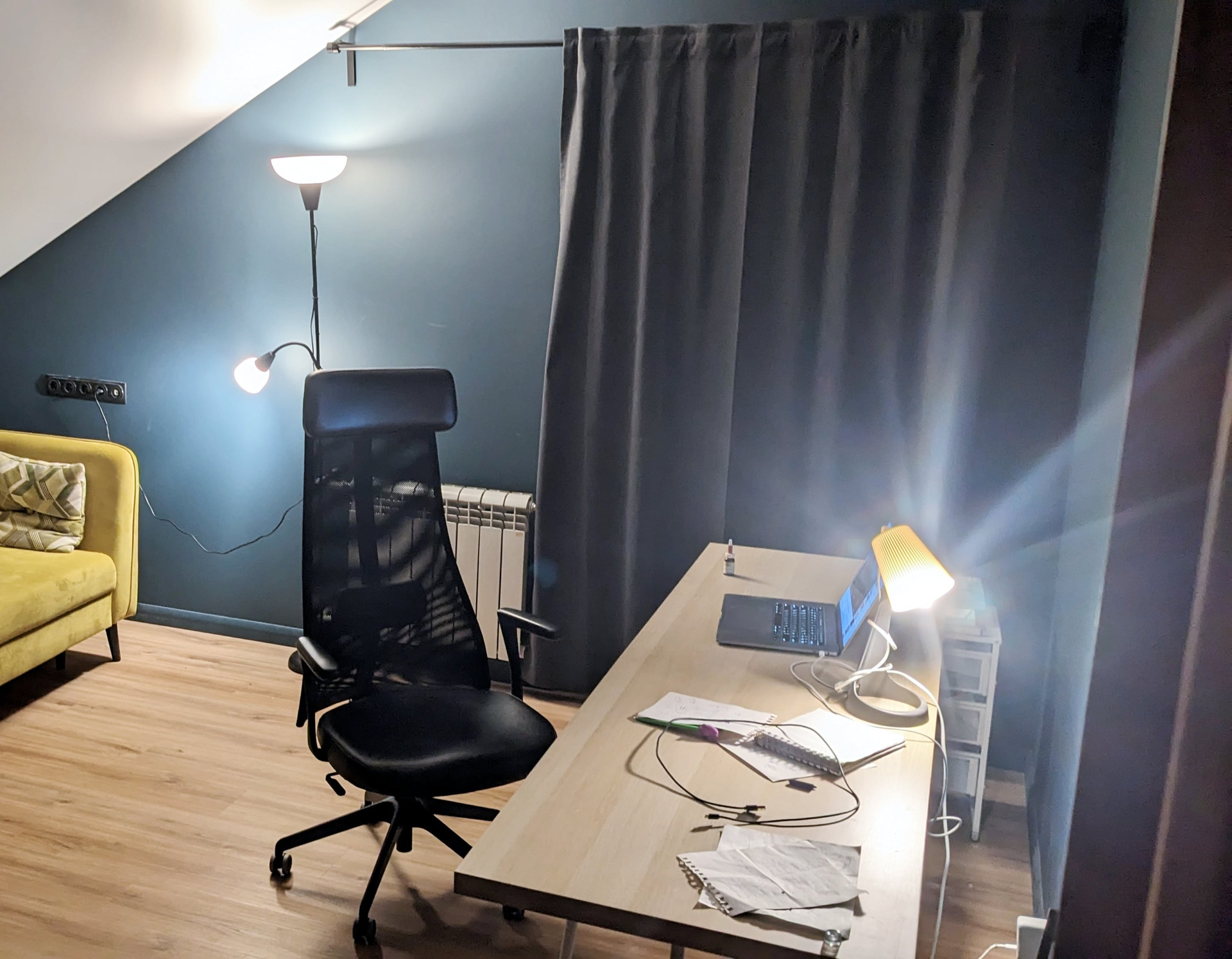 Покрасили стены в цвет nuernberg green, и оказалось что они меняют цвет от зеленоватого до синеватого в зависимости от времени суток. Мы покрасили плинтуса в цвет стен и это смотрится очень круто.