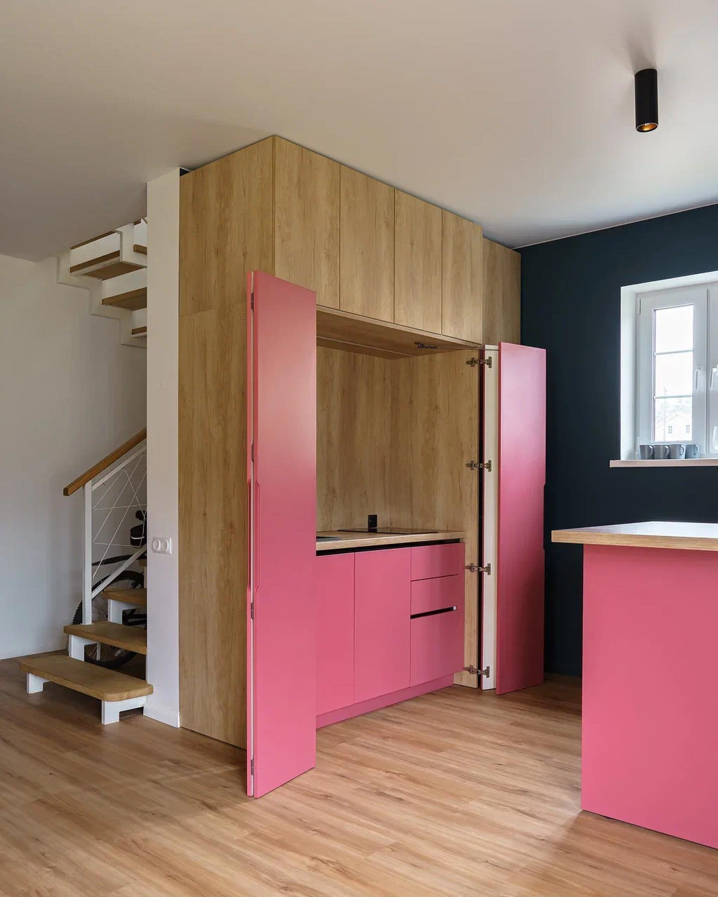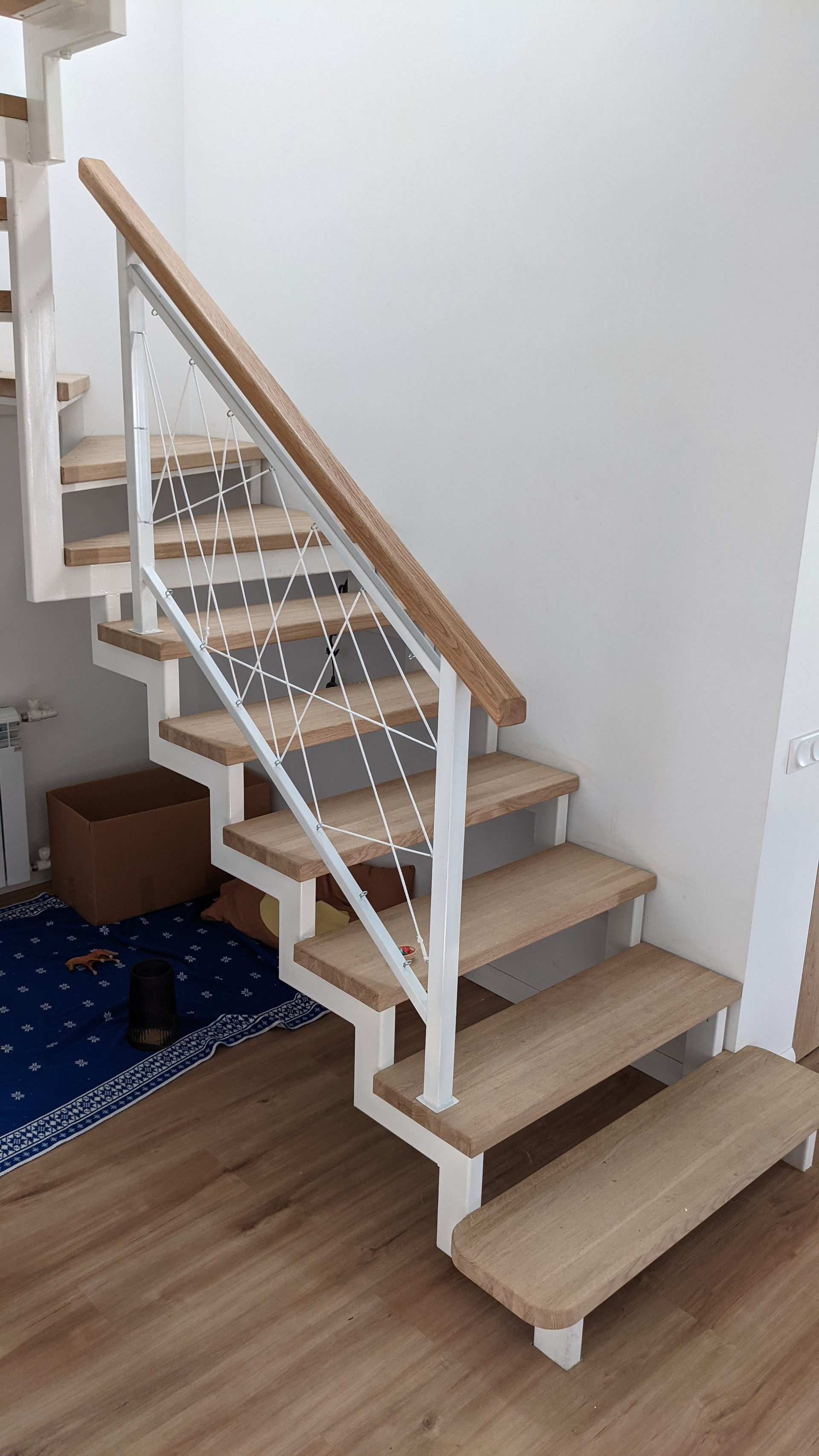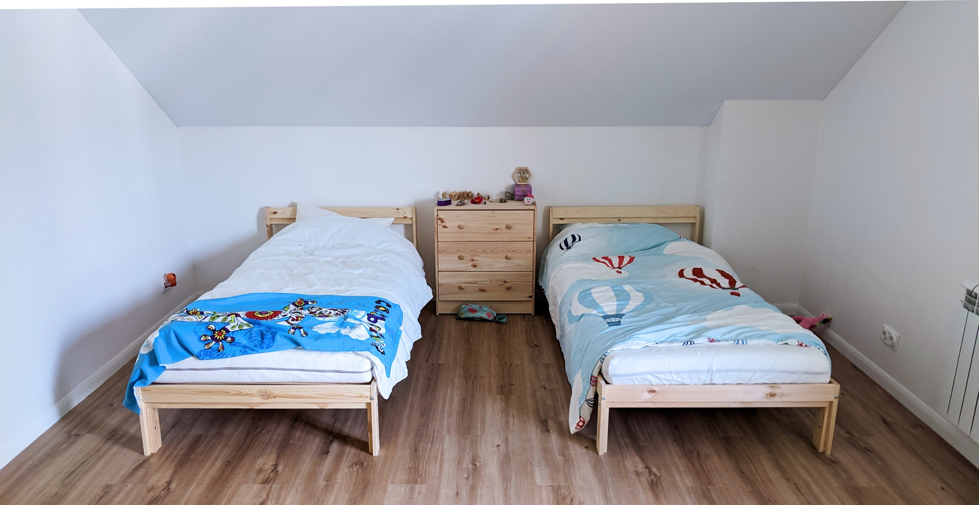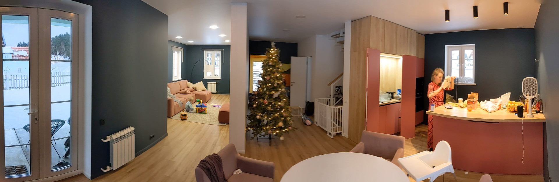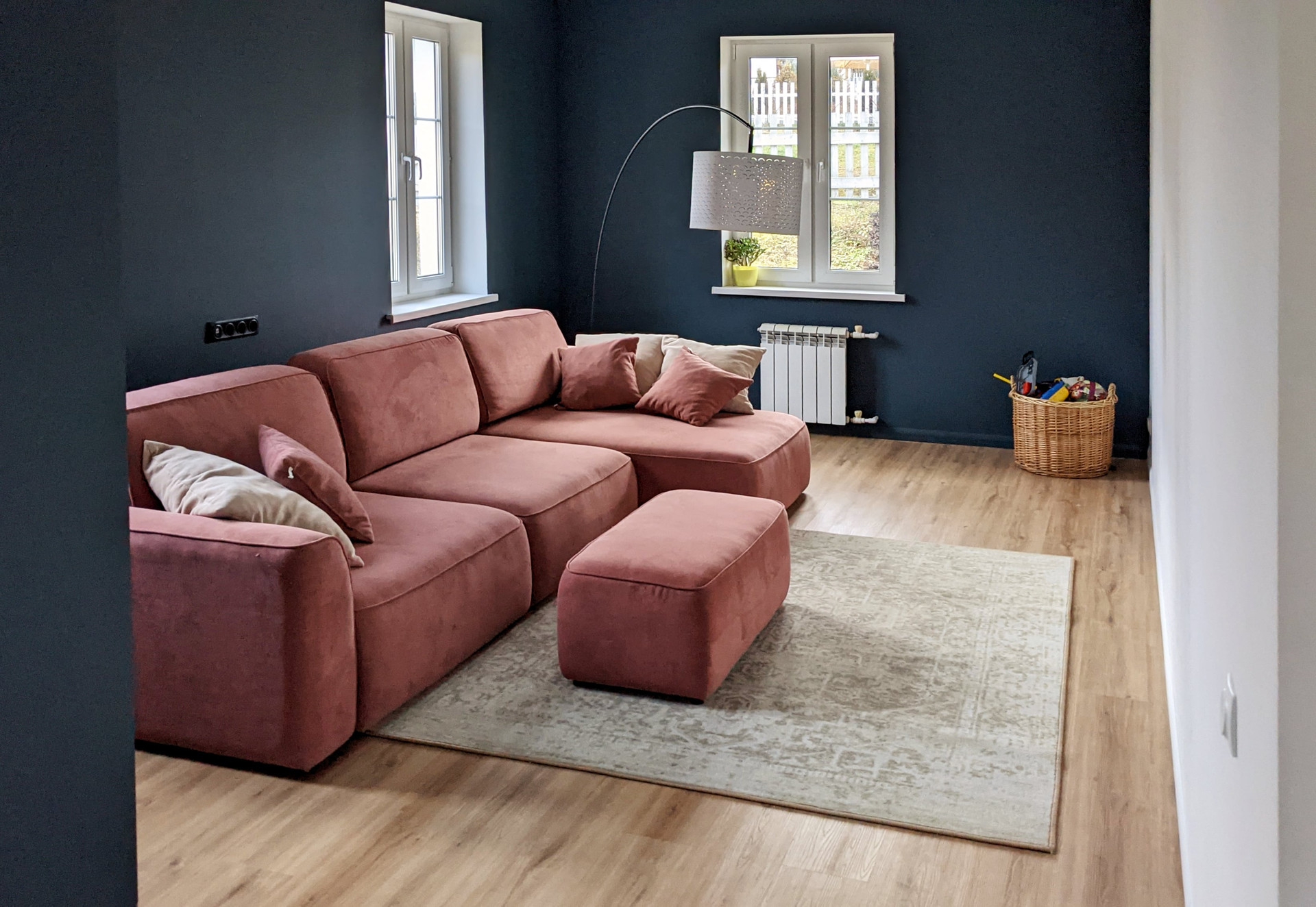 На пол постелили кварцвиниловый ламинат. От него немного изнашиваются носки, зато по полу очень приятно ходить босиком. Даже зимой.
