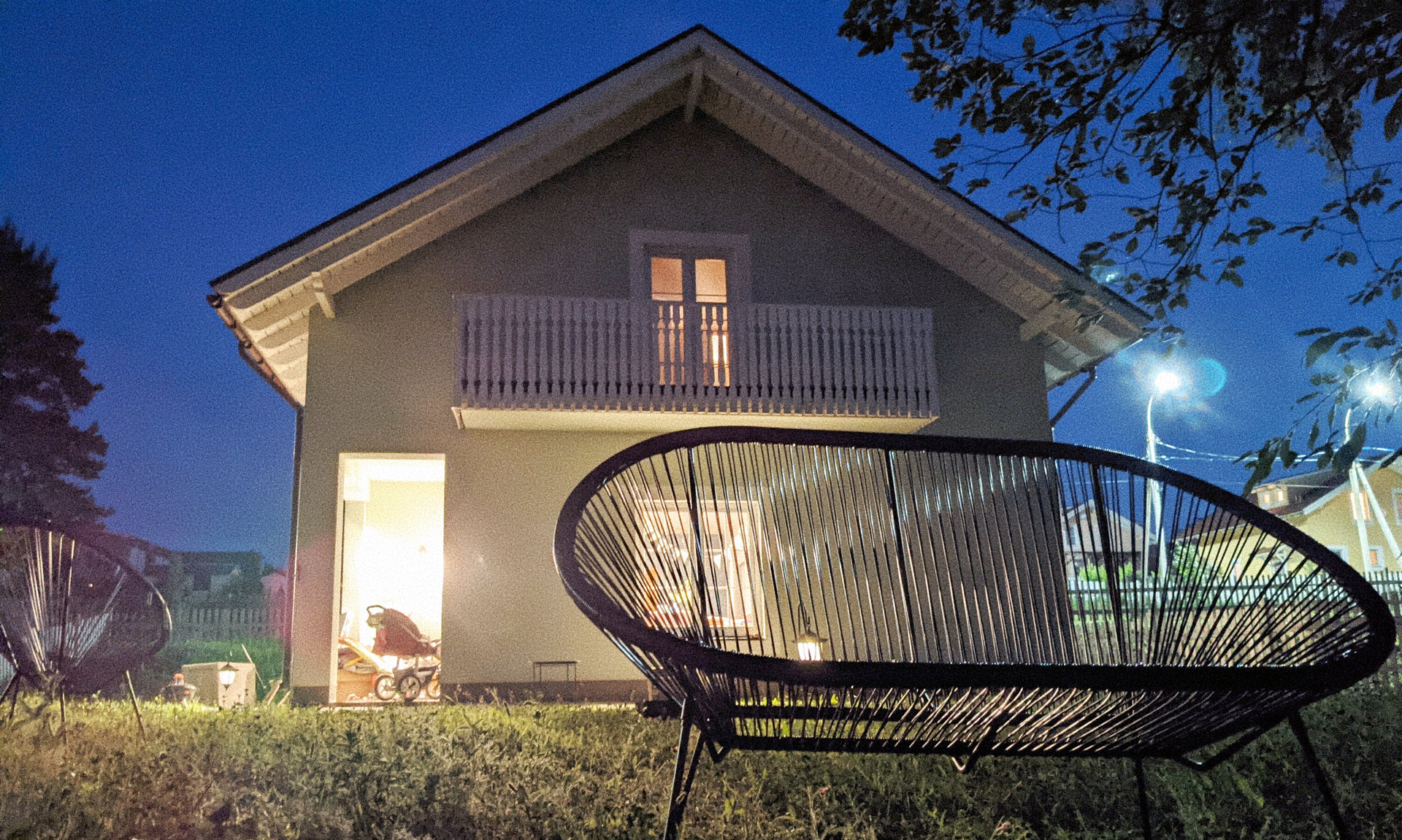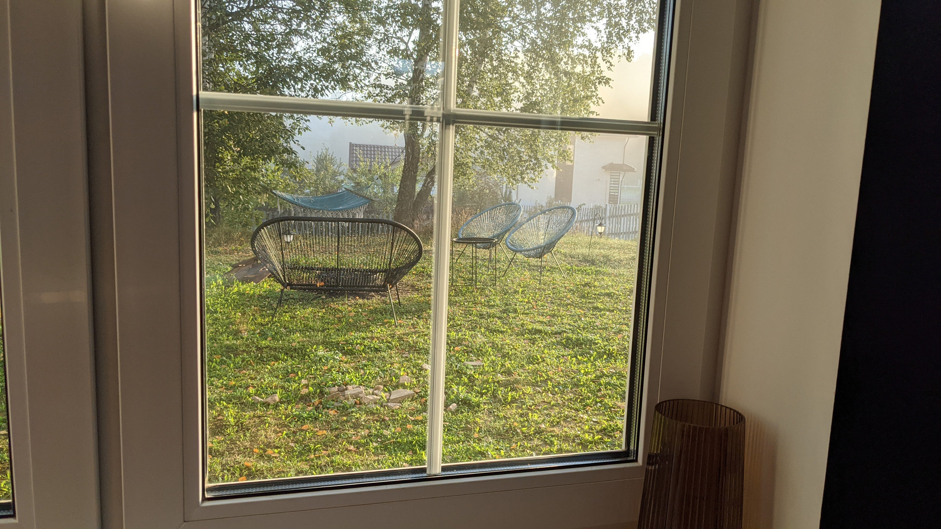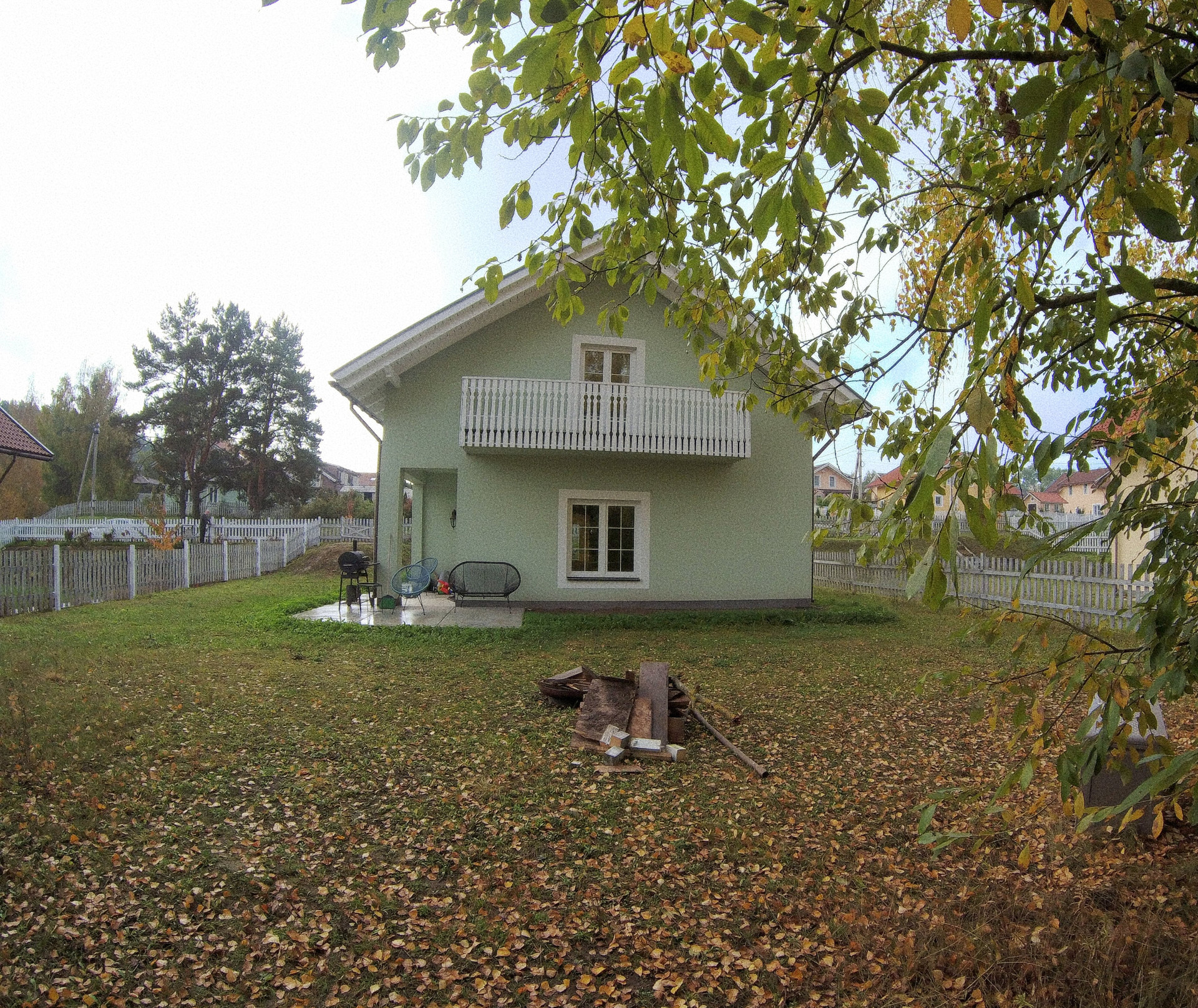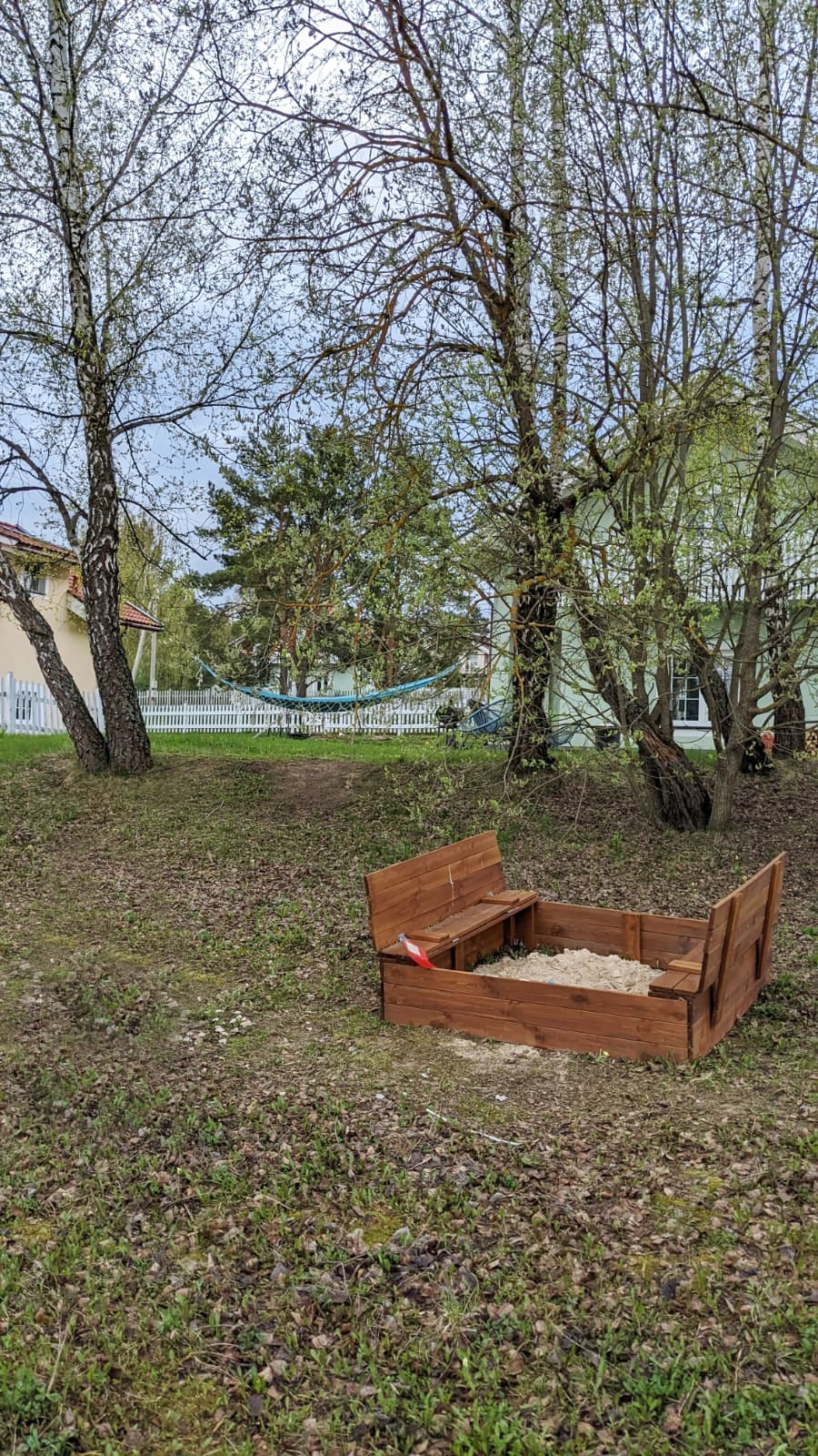 На улице мы почти ничего не делали: участок прекрасен в любое время года и так. Березы создают тень и защищают от ветра. И под ними растут подберезовики и грузди. Между березами натянули гамак. И рядом поставили очаг. Куб березовых дров и остатки деревяшек на дрова тоже оставляем.
