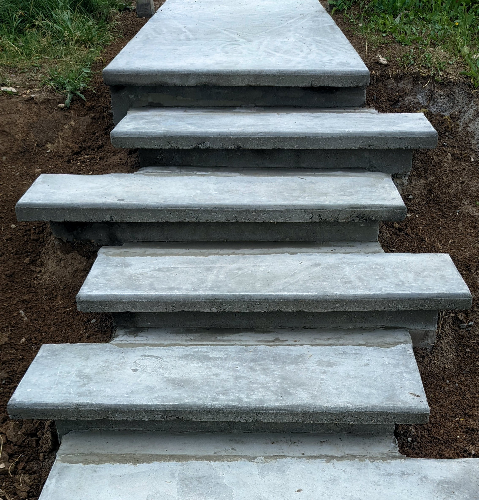 Из фундаментальных ландшафтных работ мы только сделали несимметричную лестницу при входе на участок, и небольшую террасу у заднего входа. И соединили это все дорожками. И всё это из глаженого бетона. Непривычно но интересно.