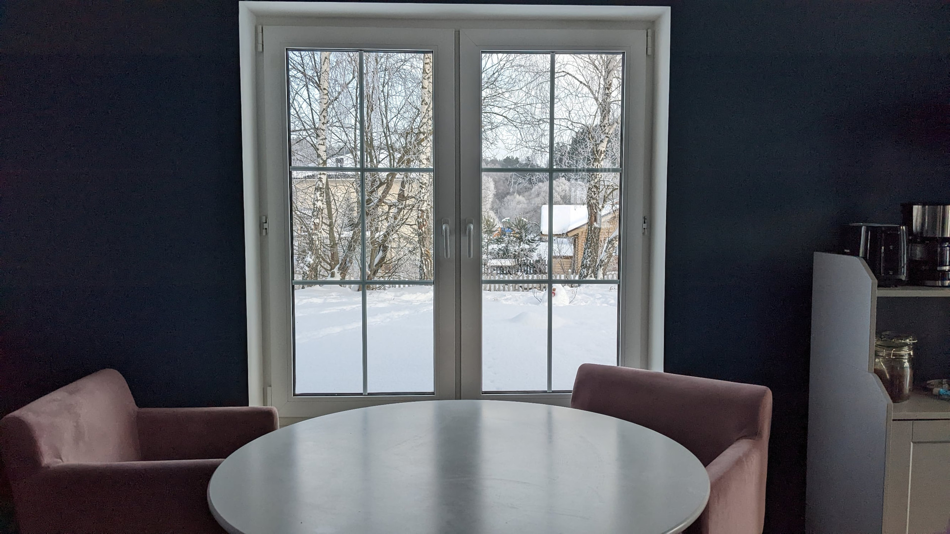 Вместо глухой металлической входной двери мы поставили стеклянную, в стилистике окон. И прихожая преобразилась: стала светлой и уютной. А с улицы кстати ничего не видно потому что перед дверью склон. Окон кстати очень много и они большие.