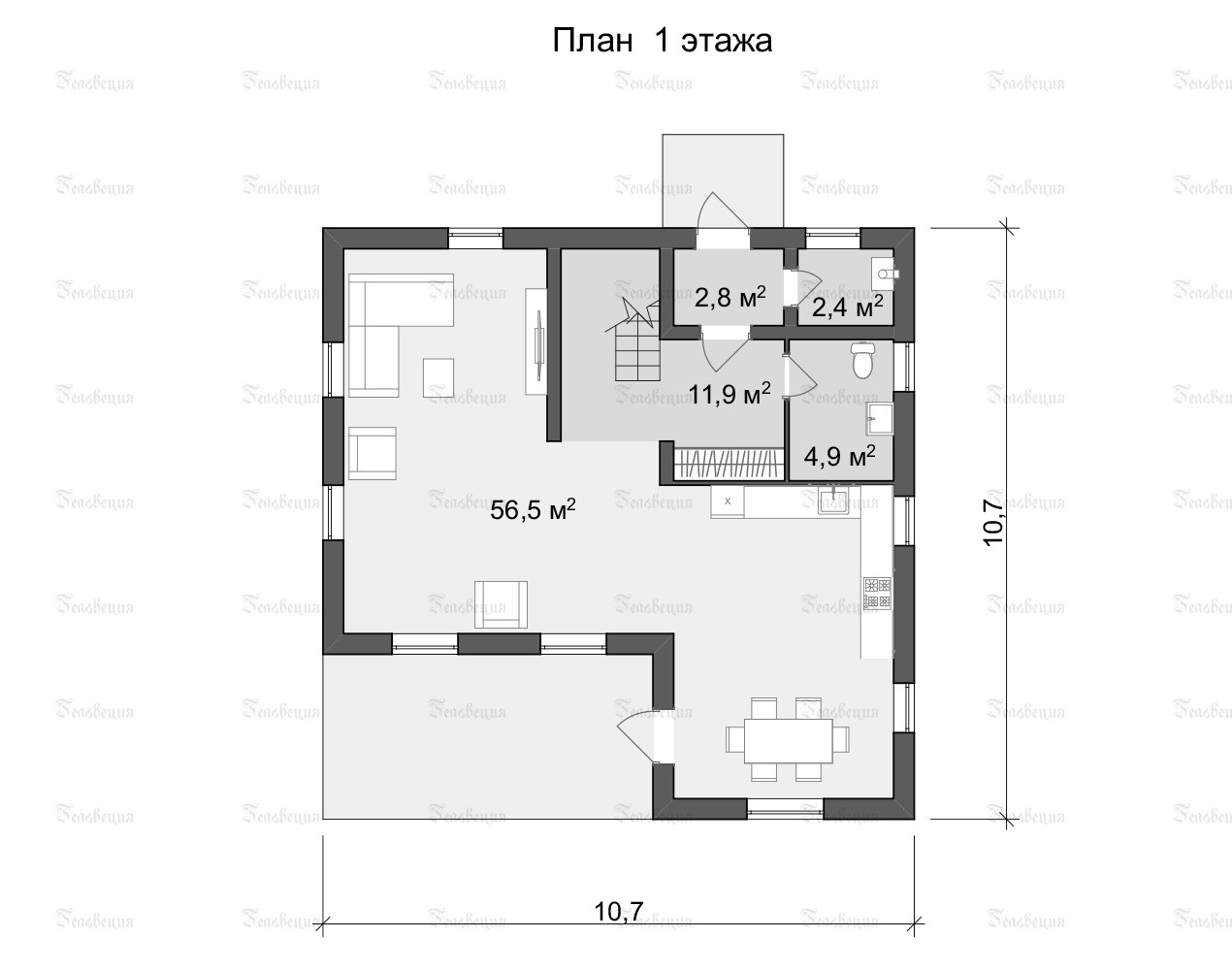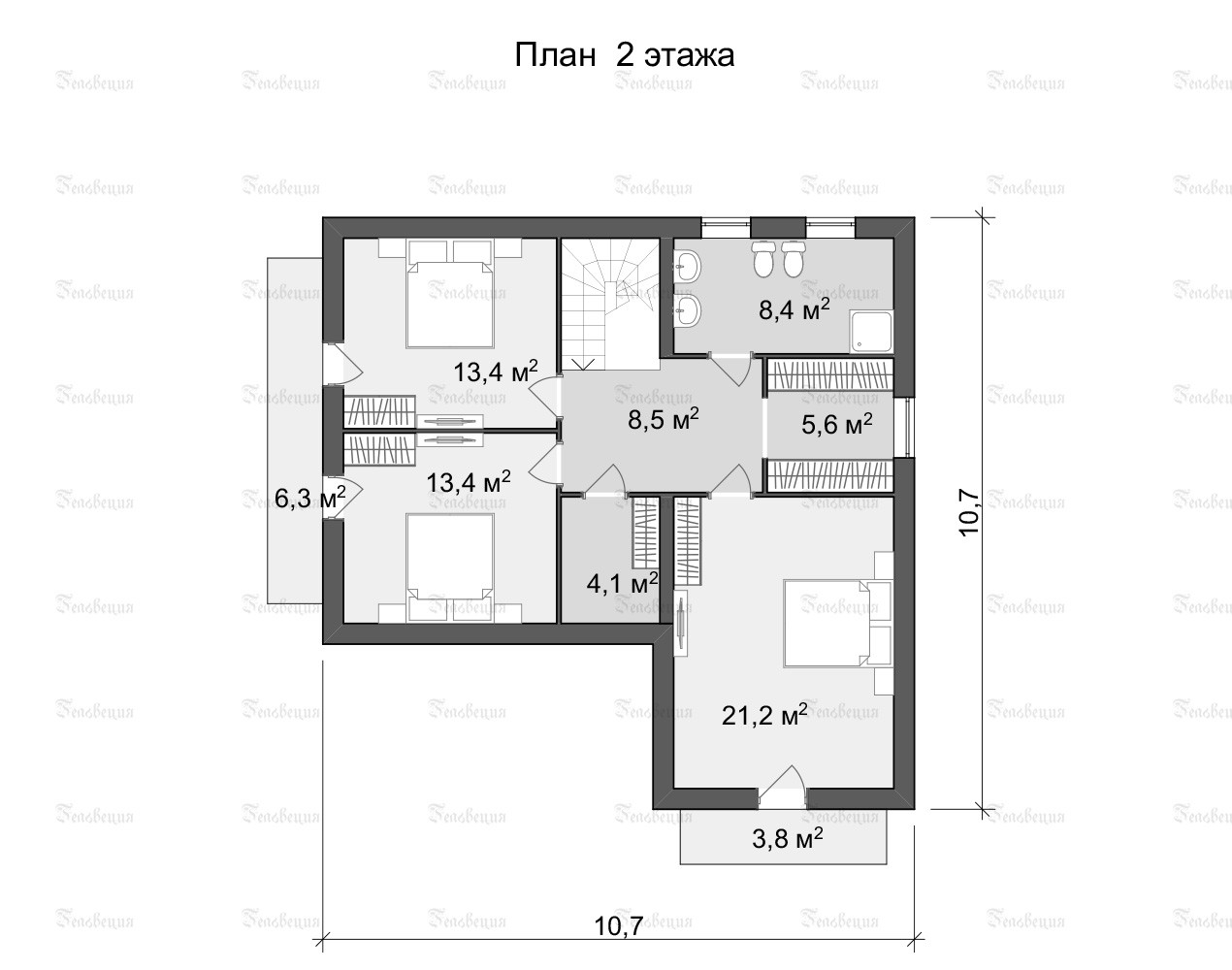 На первом этаже гостиная, кухня, санузел, кладовая, бойлерная. На втором этаже 4 спальни и санузел.