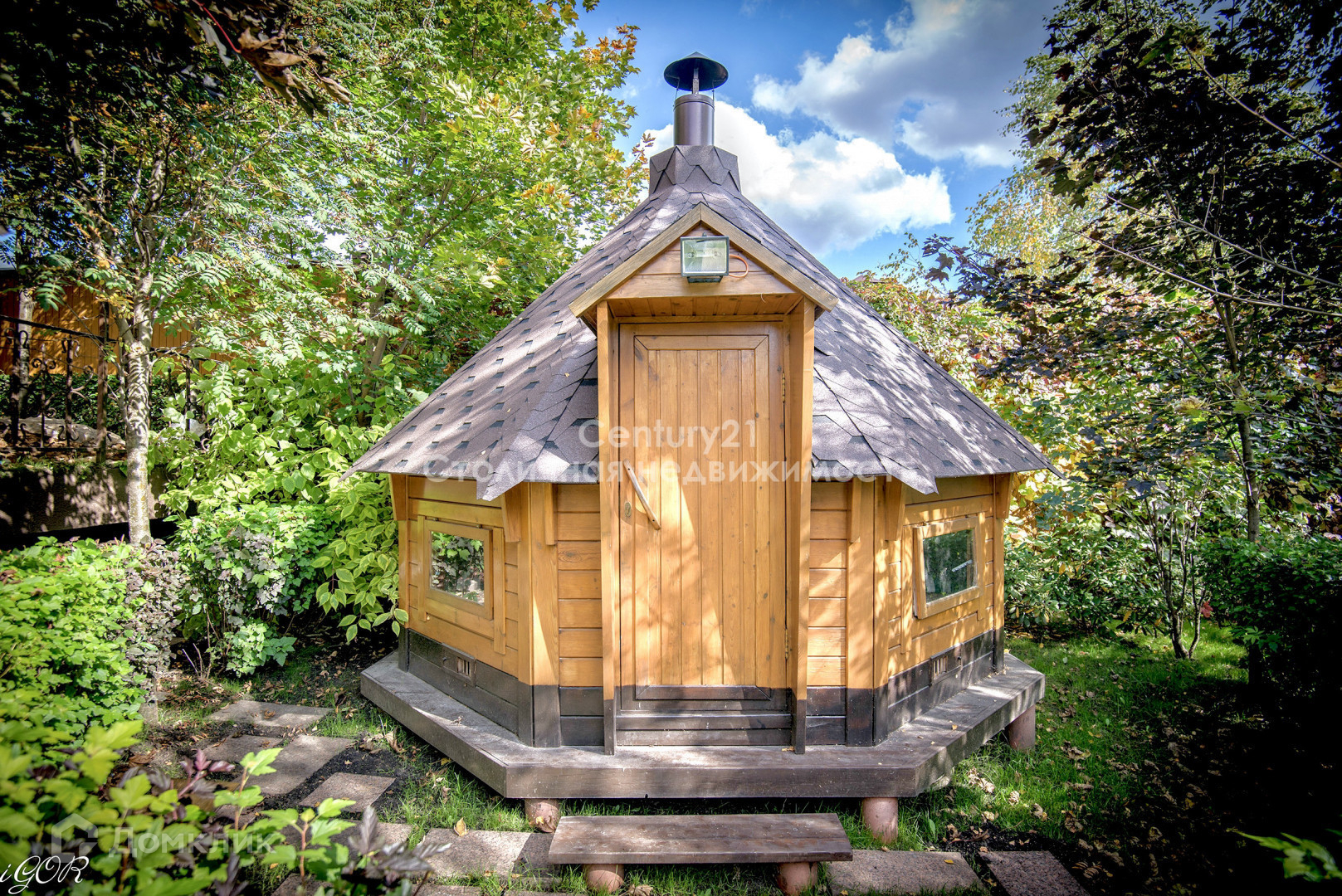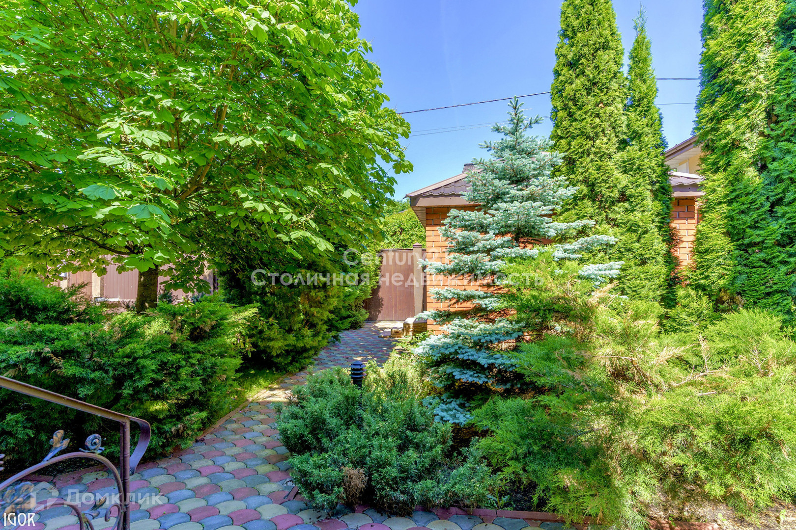 Дом расположен на благоустроенном, озелененном участке, площадью 12 соток, тeррасиpован в двух уровняx, высажены хвойные насаждения, произведен дренаж, вымощены пешеходные дорожки.