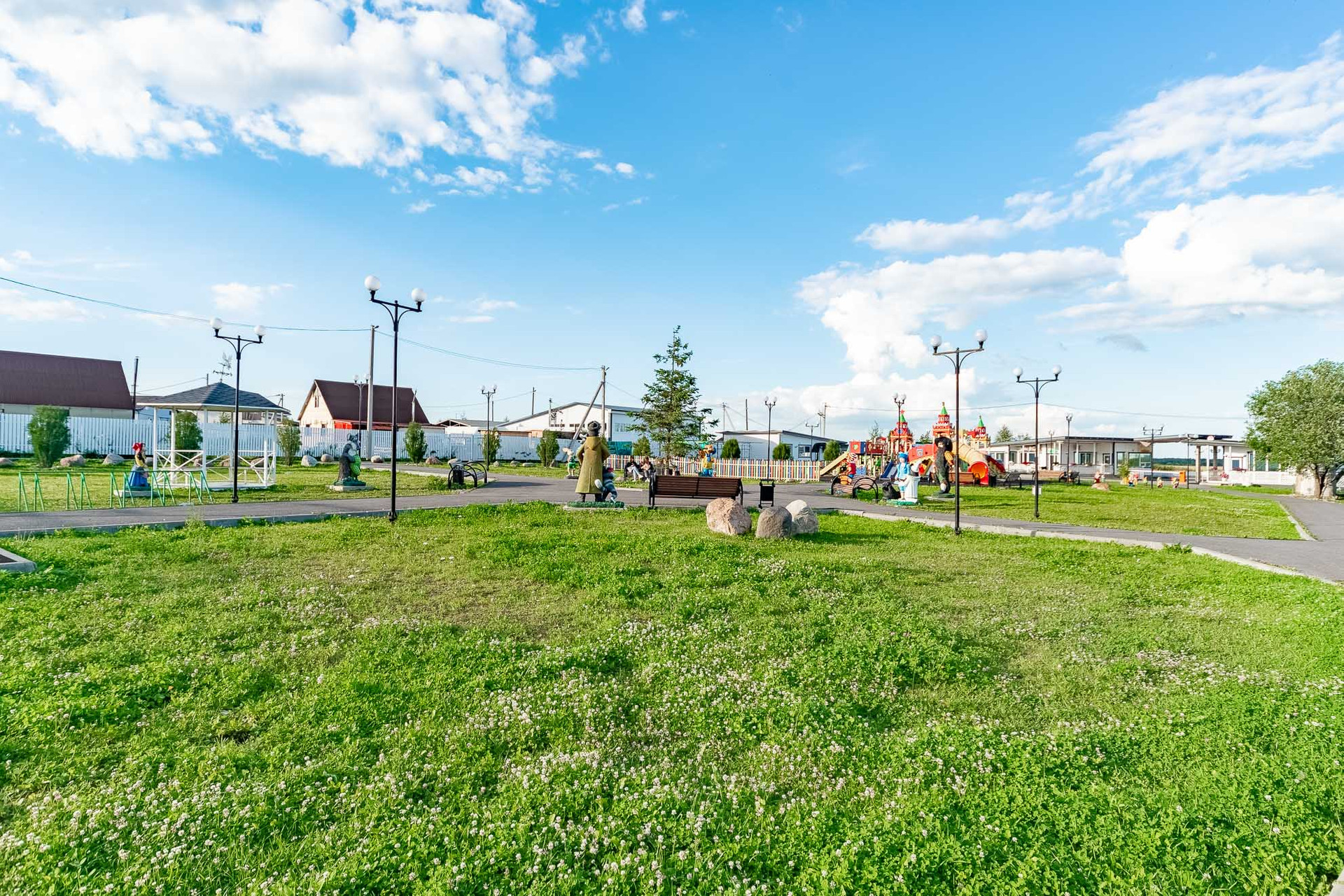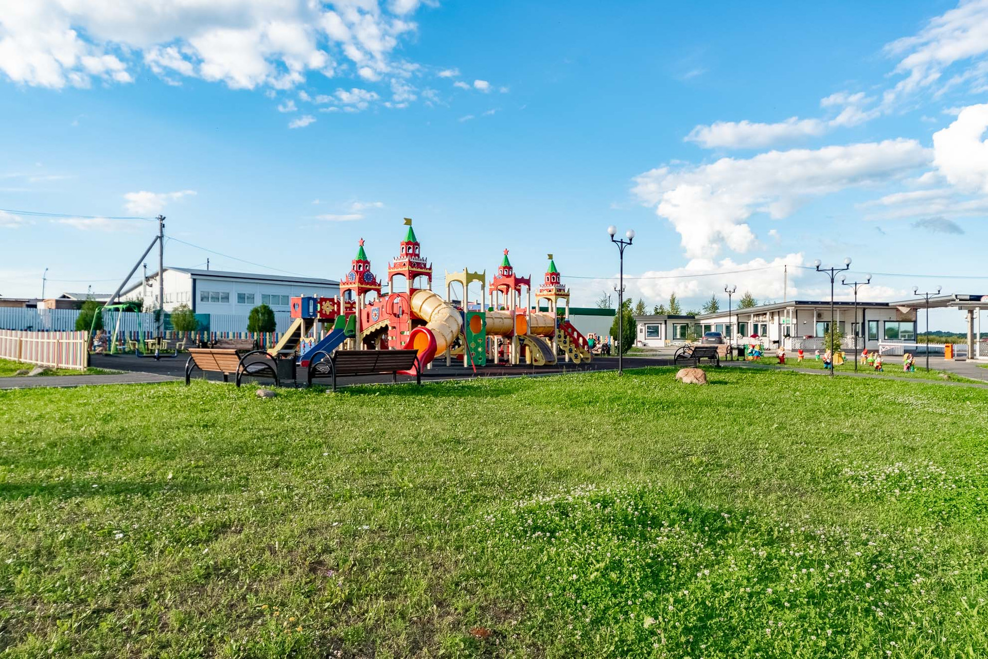 На территории самого поселка присутствует круглосуточная охрана, детская площадка, магазин и свое кафе. Вся территория закрытая.