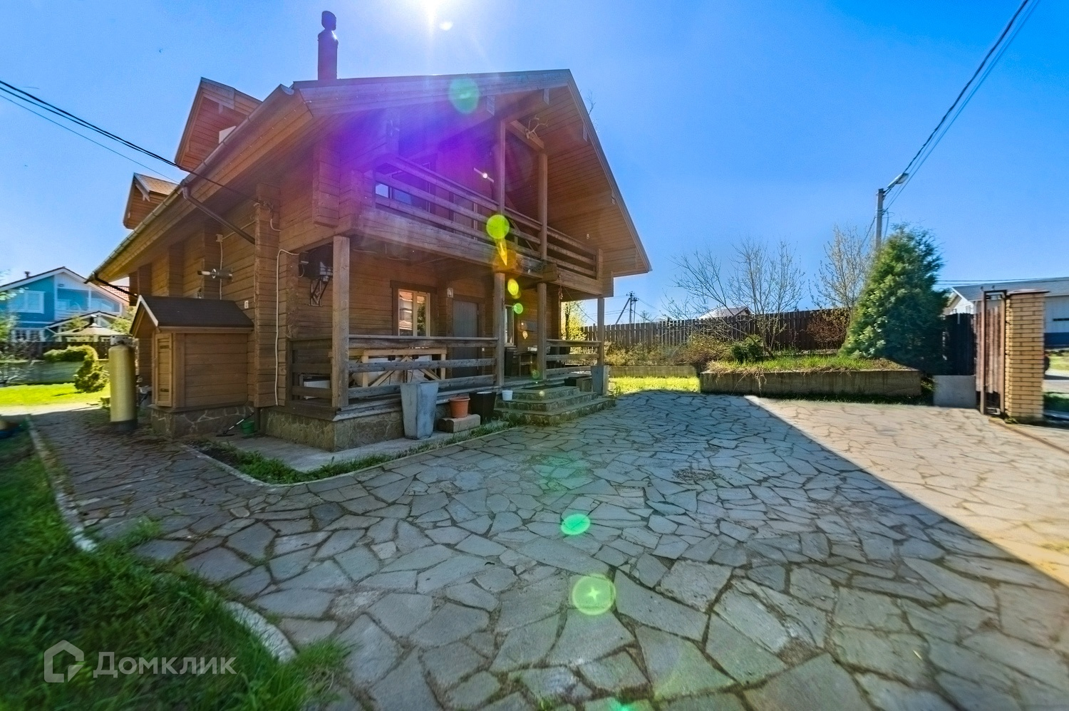 На участке установлен забор по периметру, построен хоз блок для хранения инвентаря, организовано два въезда - один к центральному входу, второй под навес для двух автомобилей.