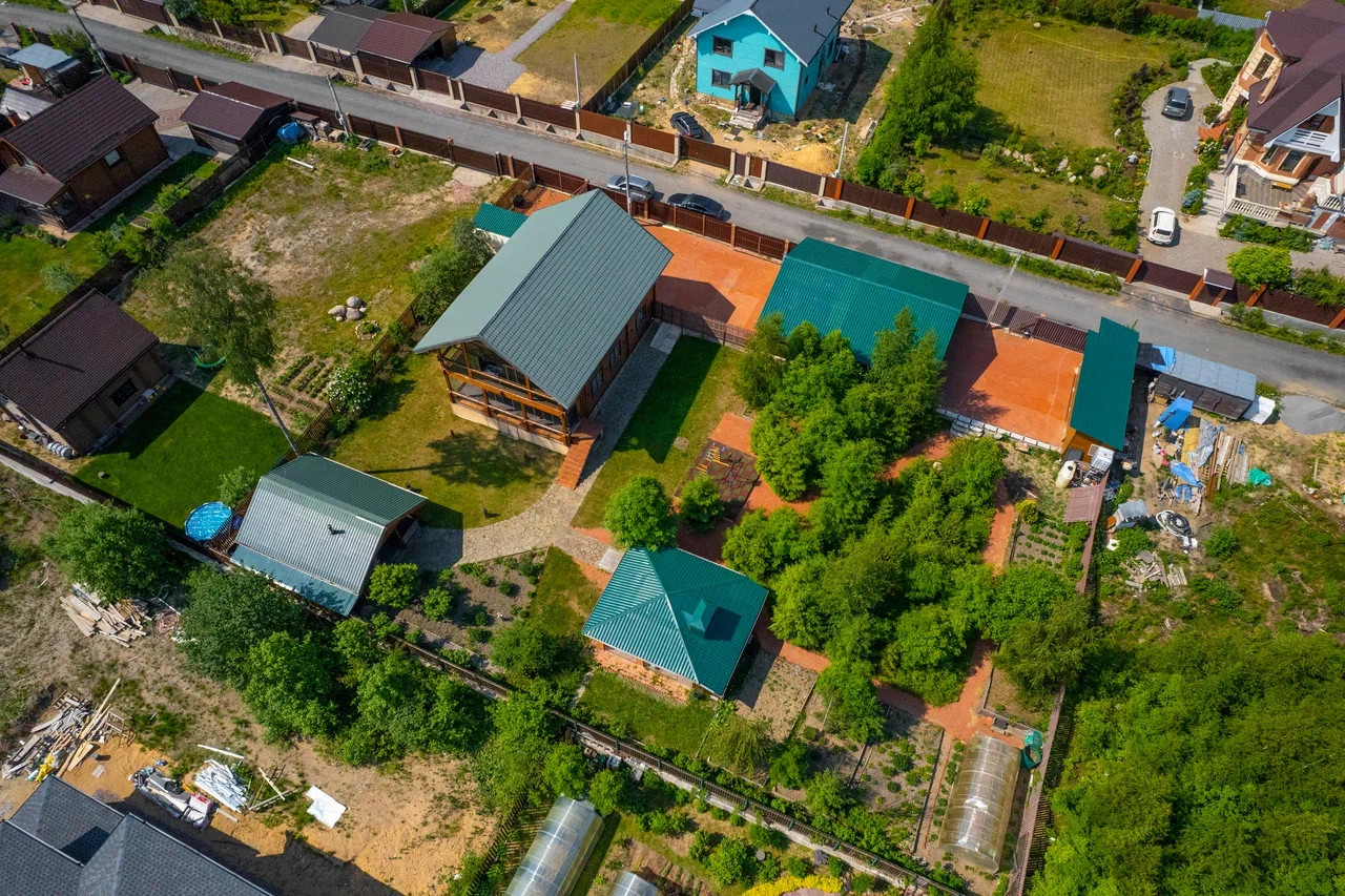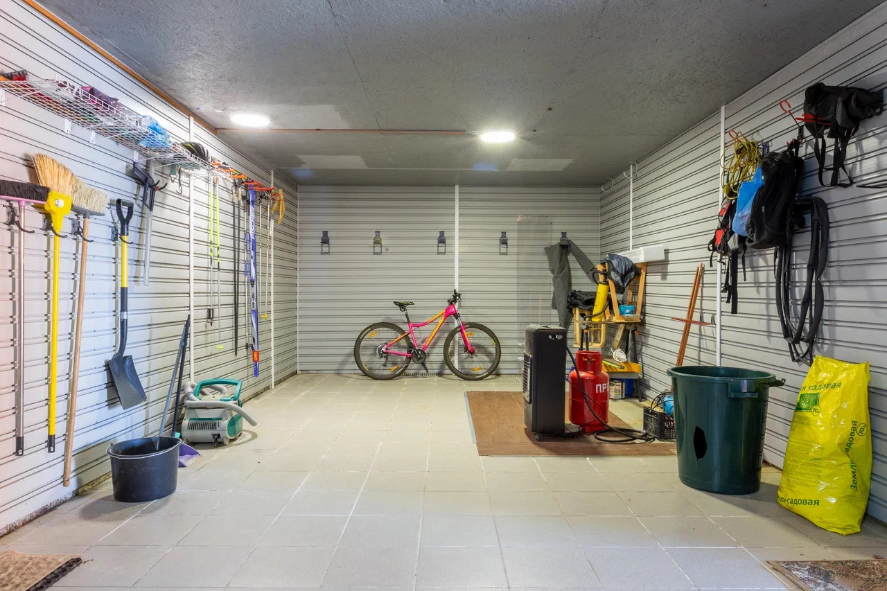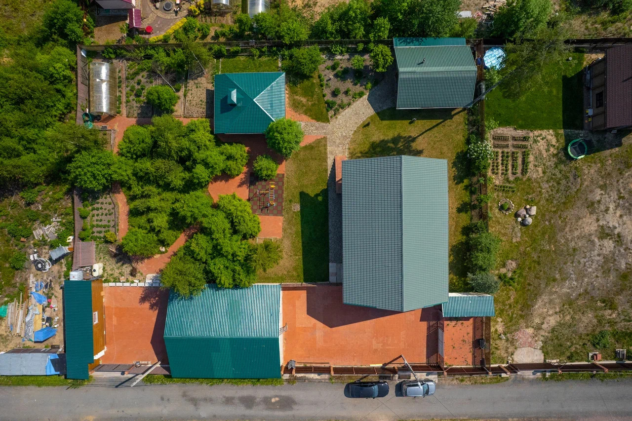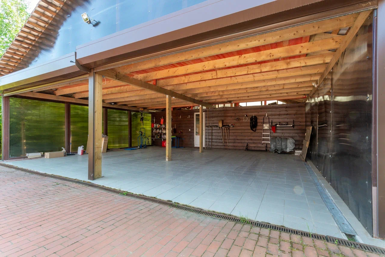 На бетонной монолитной плите расположены: закрытый просторный гараж на 2 машино-места с двумя электрифицированными подъёмными воротами, мастерская с отдельным входом (общая площадь 120 кв.м,), небольшой деревянный домик со всеми коммуникациями включая туалет, душевая, раковина.