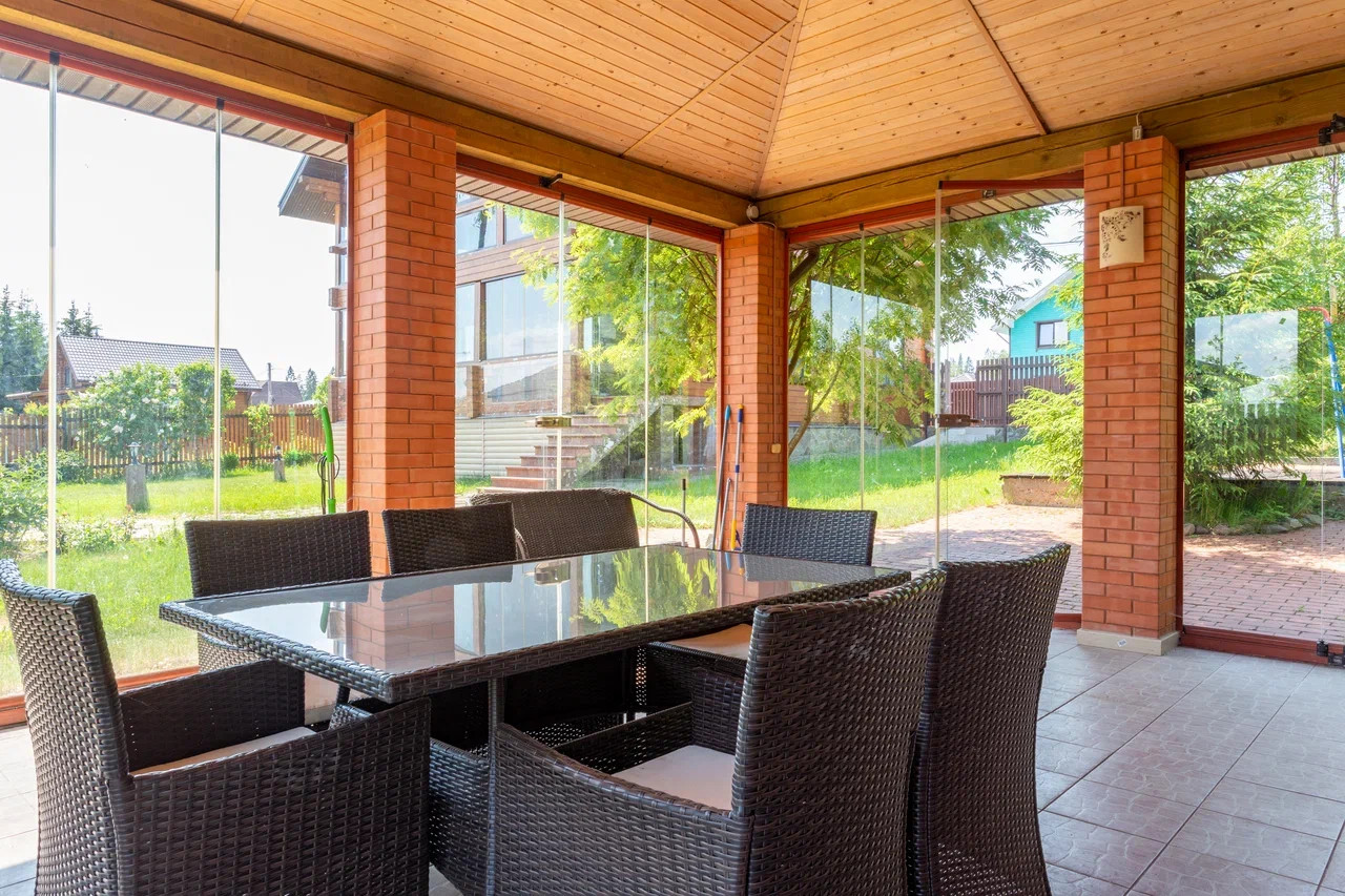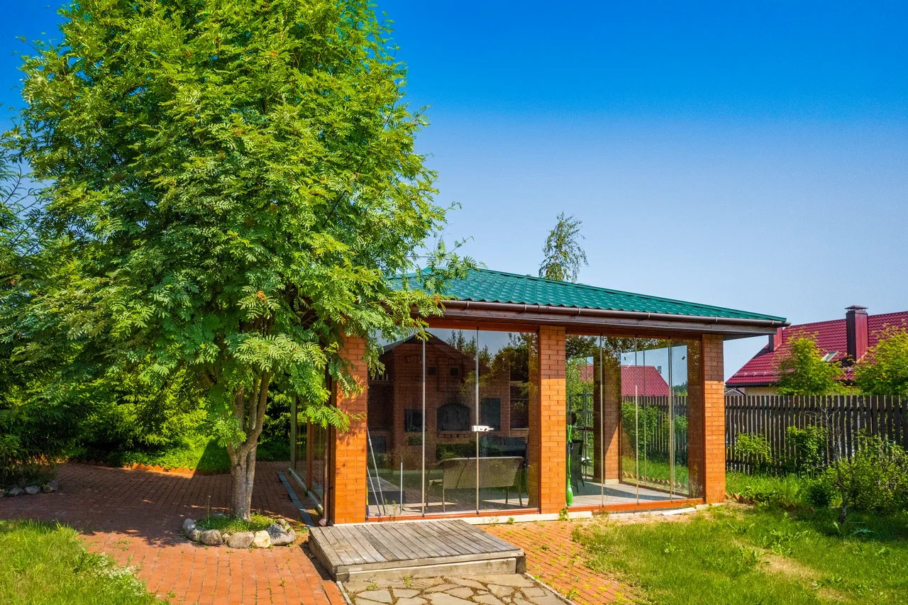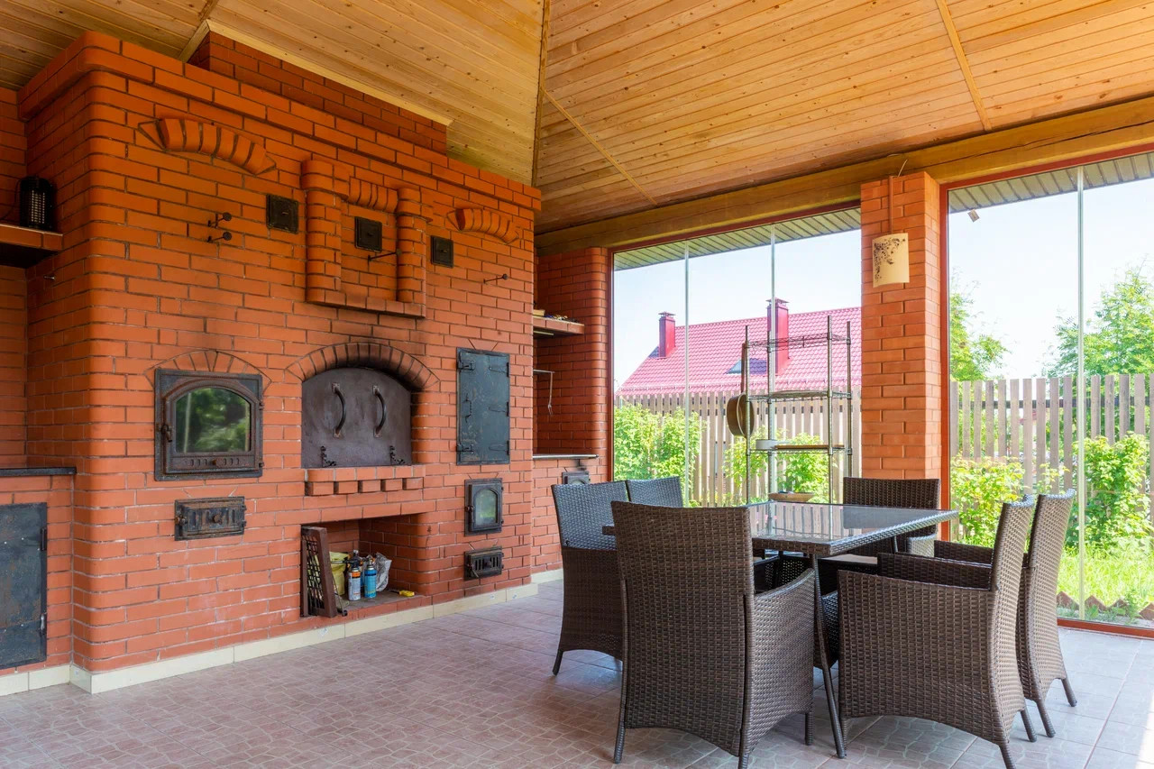 Летняя кухня, 6х6 м, установлена на бетонной монолитной плите, с безрамным остеклением, заведена вода, электричество и канализация. Печь по индивидуальному проекту, длиной 6 метров, включает в себя: раковину с разделочным столом, коптильню, русскую печь, мангал, обычную печь на дровах. Кровля - металлочерепица.