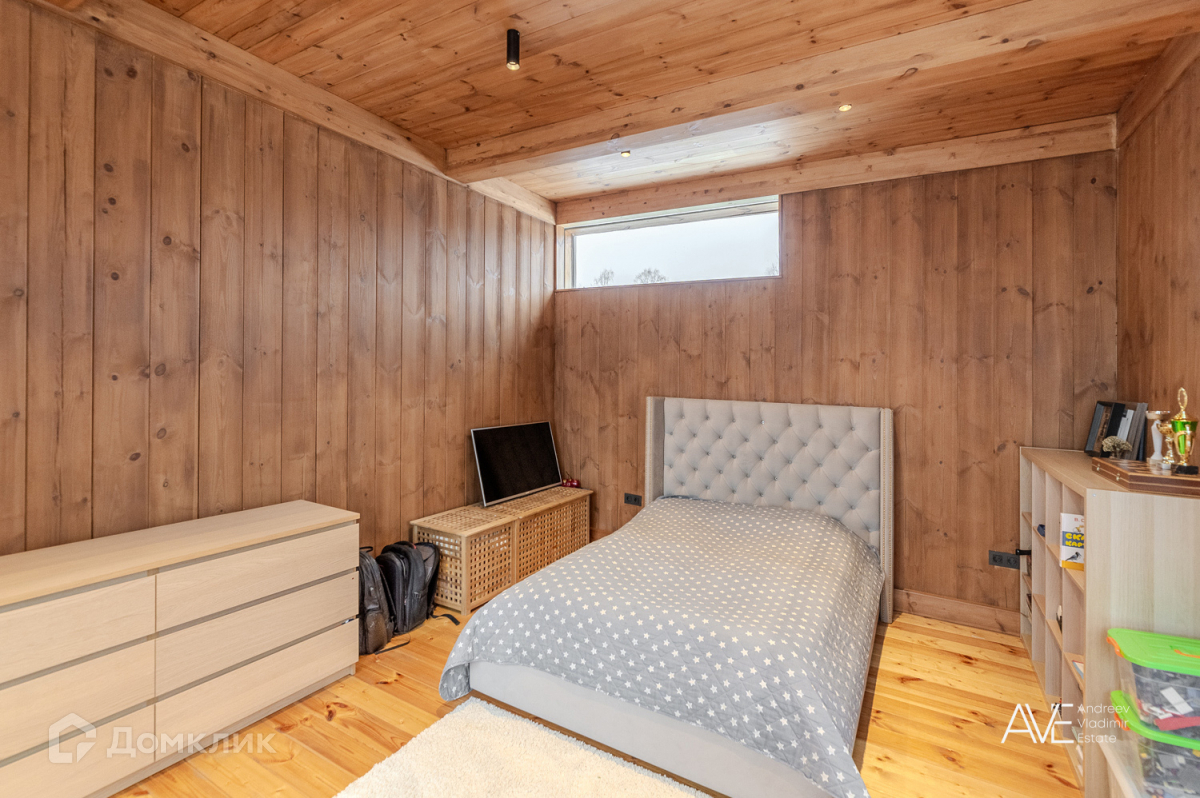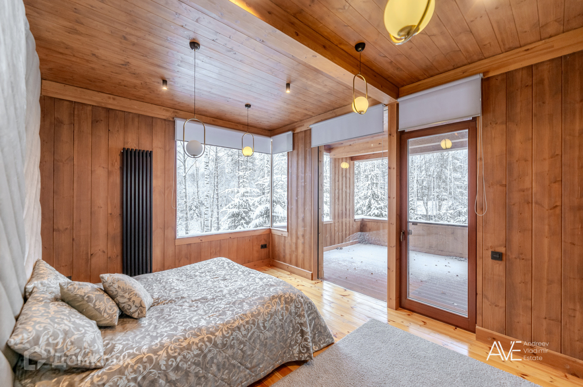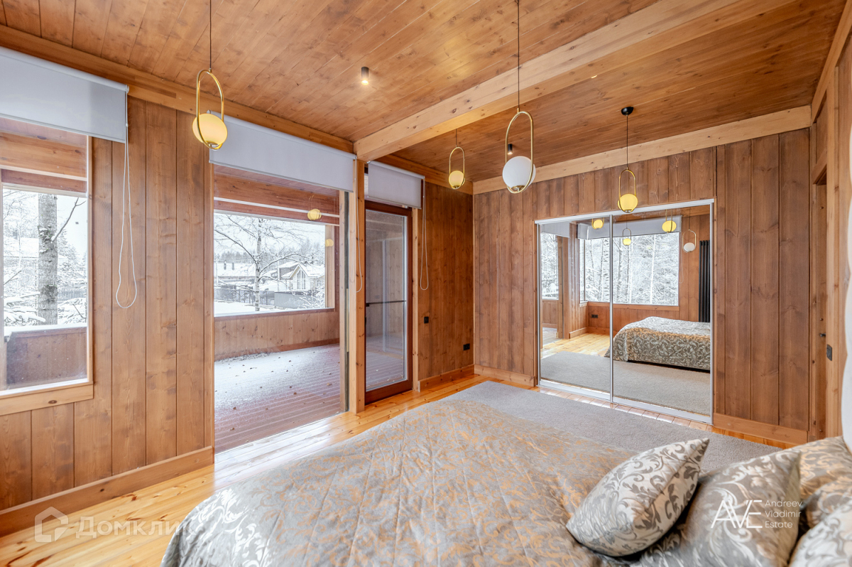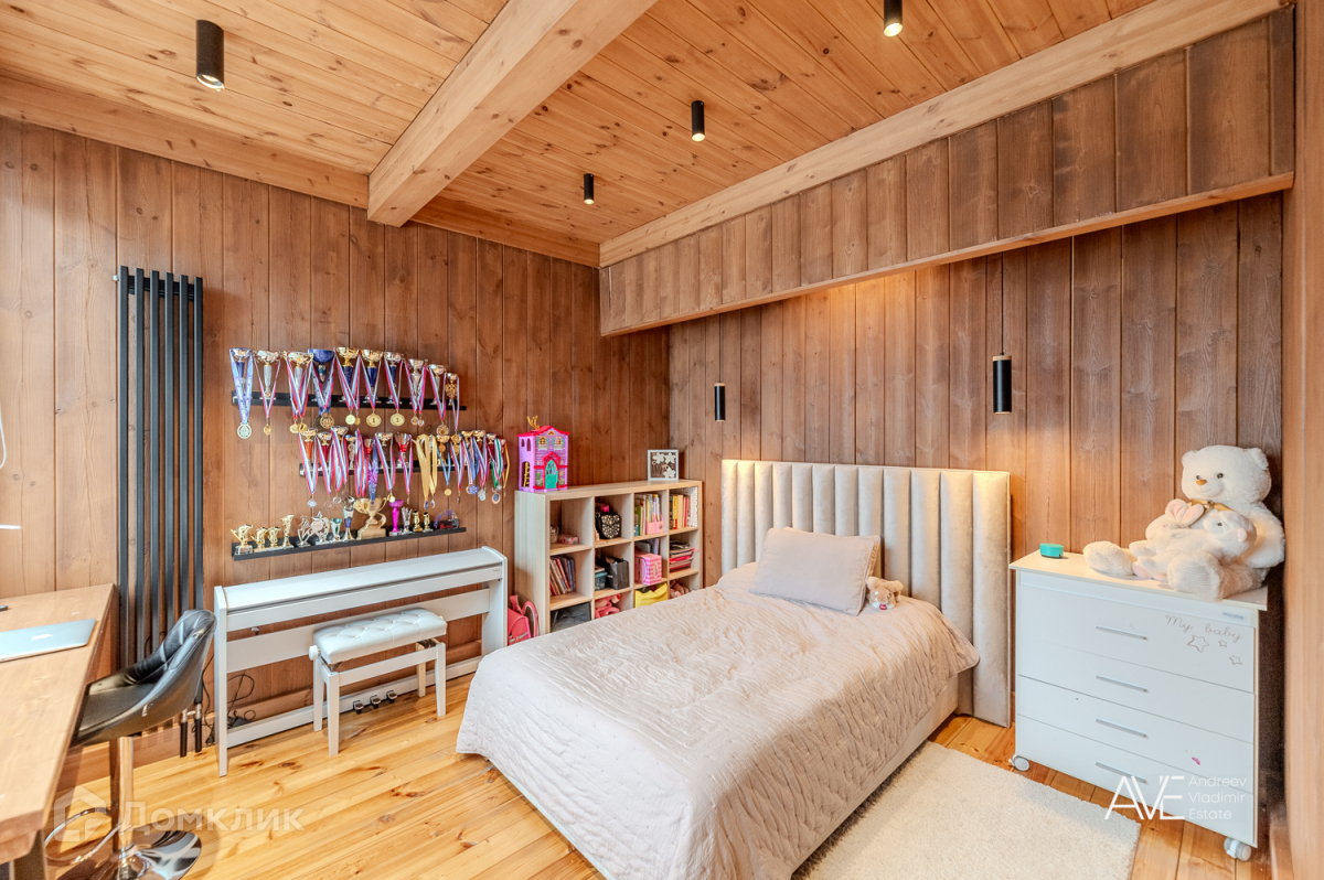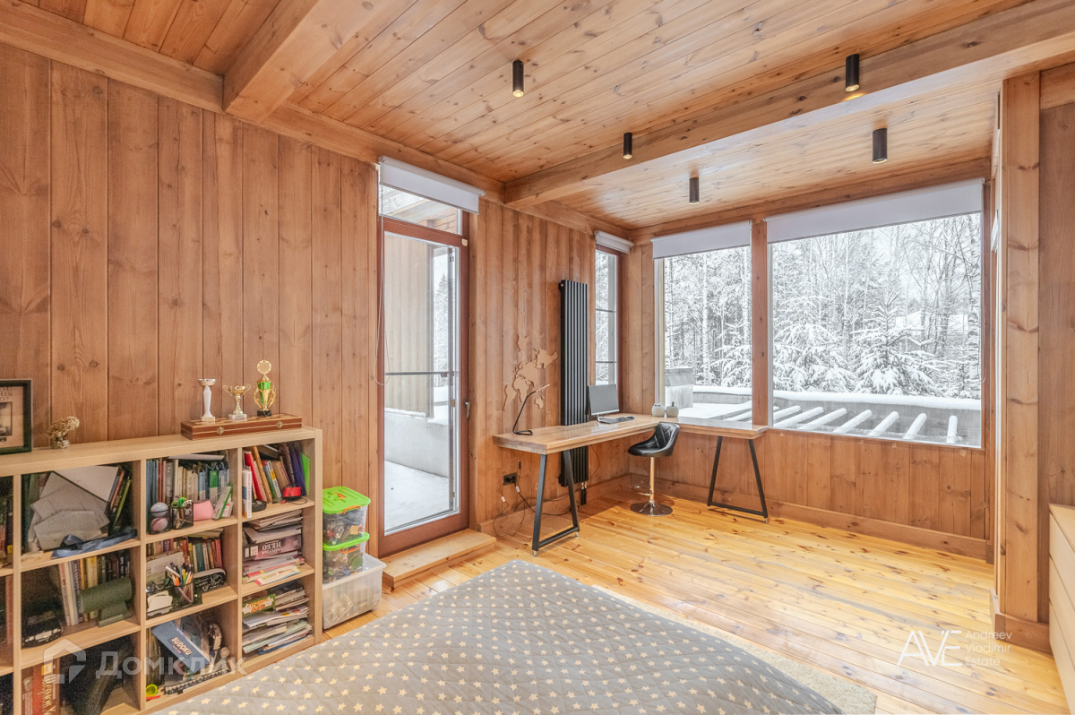 На втором этаже расположены две детские спальные комнаты, одна из которых со своим выходом на просторную эксплуатируемую кровлю, просторный санузел с отдельно стоящей ванной и душевой, а так же хозяйская спальня с двумя гардеробами и выходом на крытую уютную террасу с видом на лес и озеро.