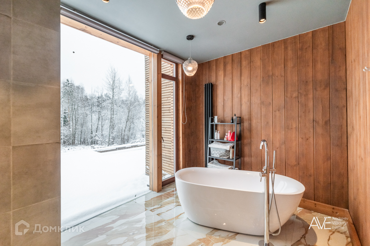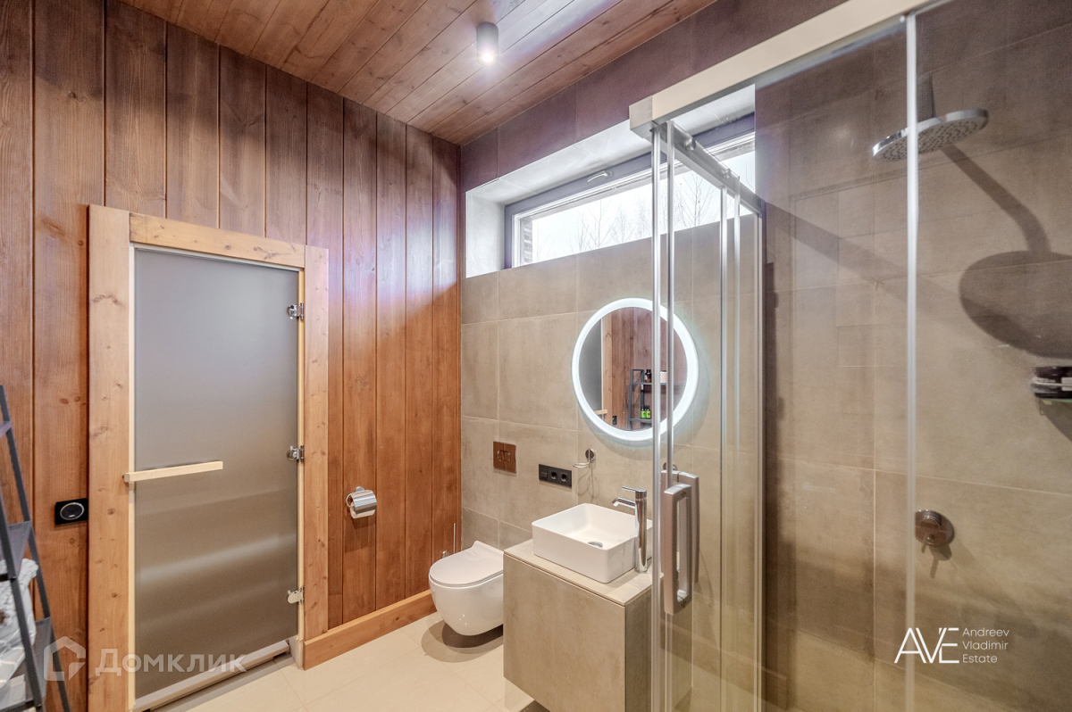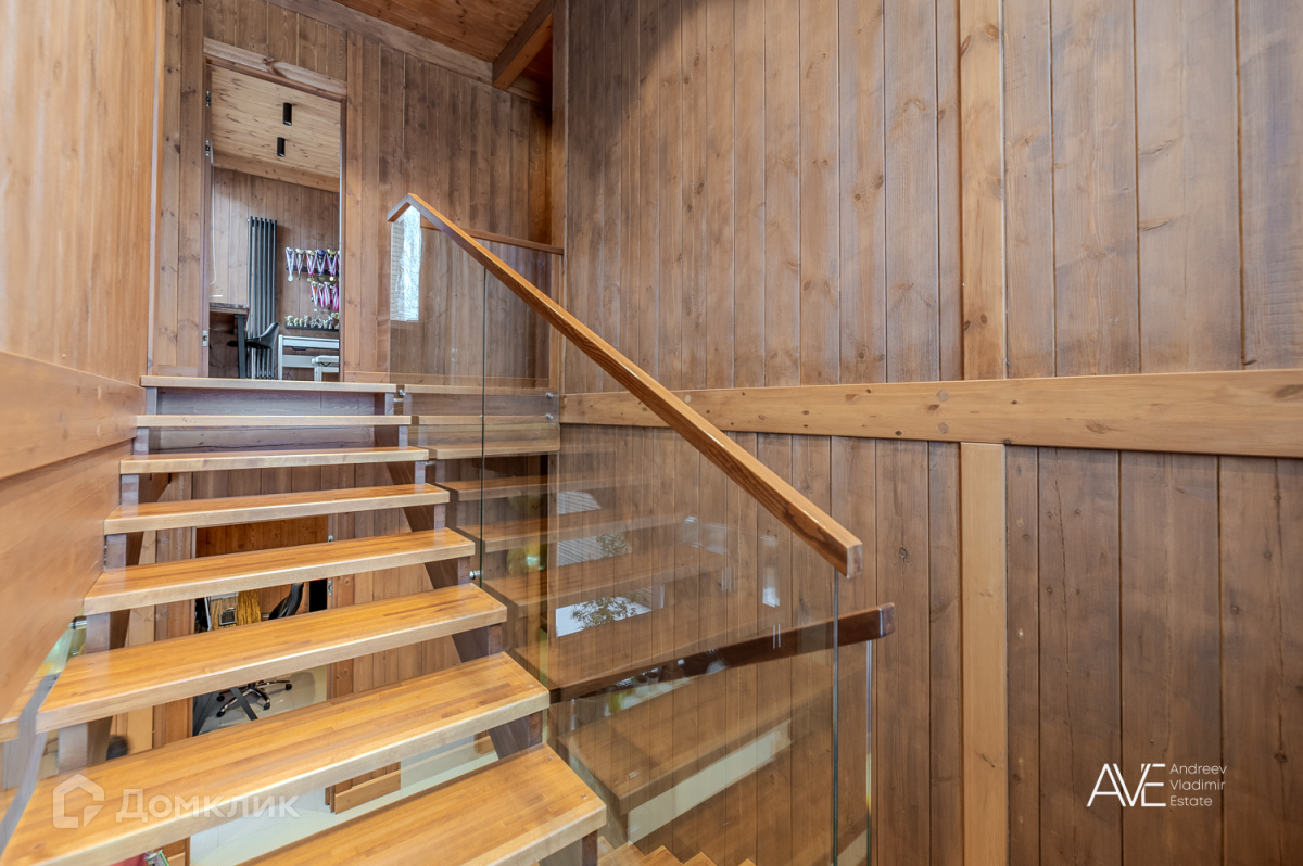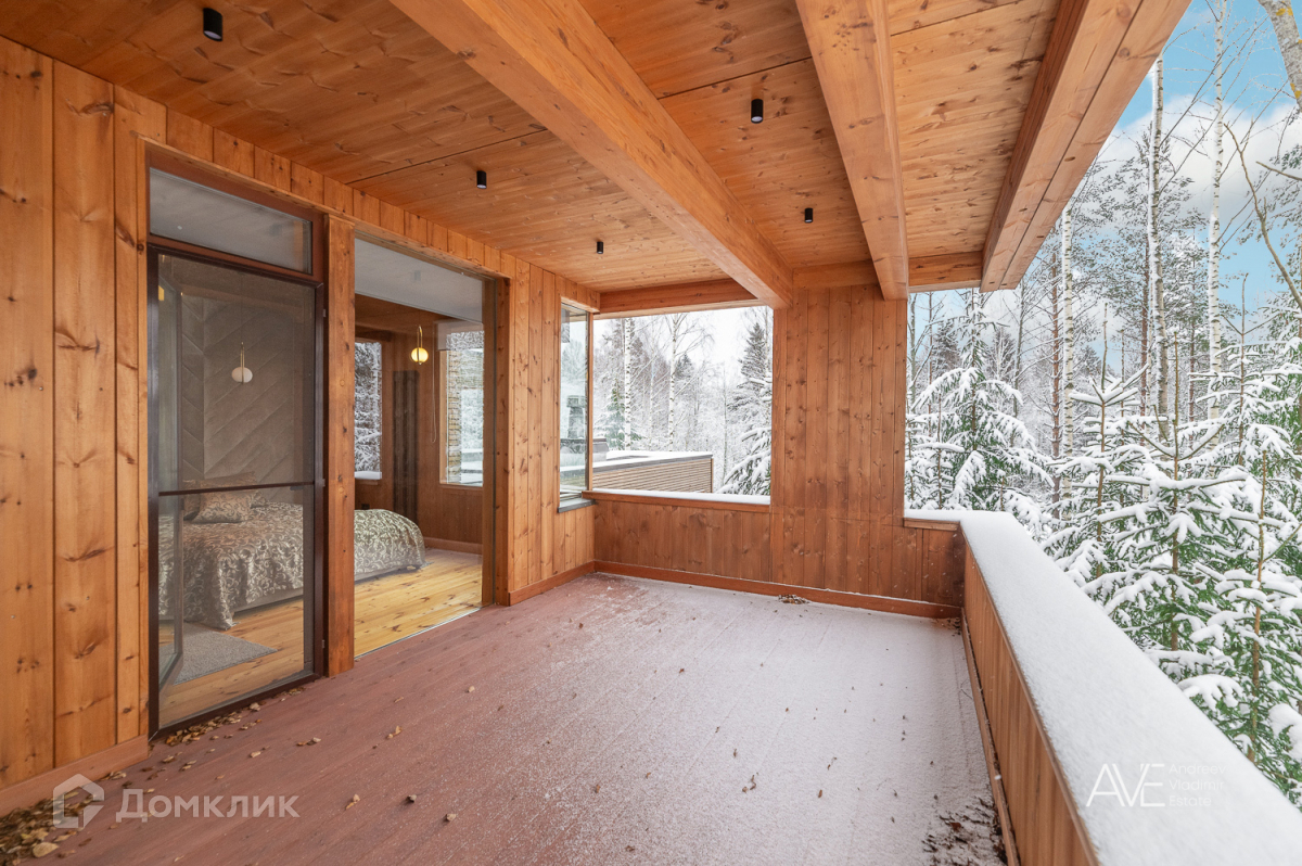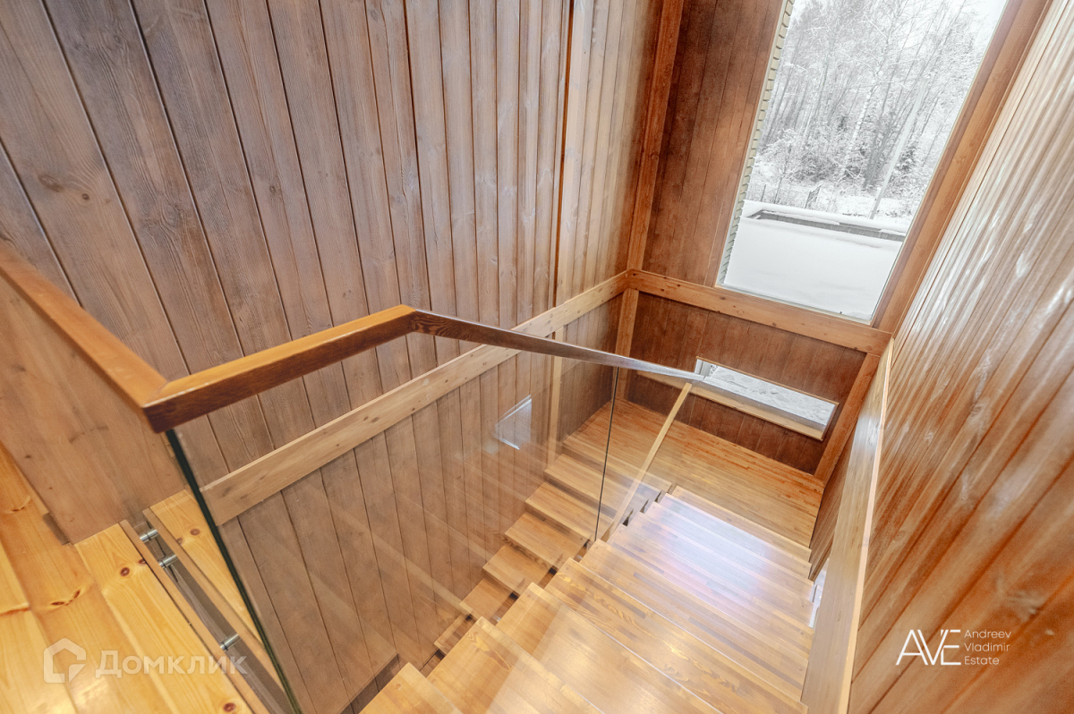 На втором этаже расположены две детские спальные комнаты, одна из которых со своим выходом на просторную эксплуатируемую кровлю, просторный санузел с отдельно стоящей ванной и душевой, а так же хозяйская спальня с двумя гардеробами и выходом на крытую уютную террасу с видом на лес и озеро.