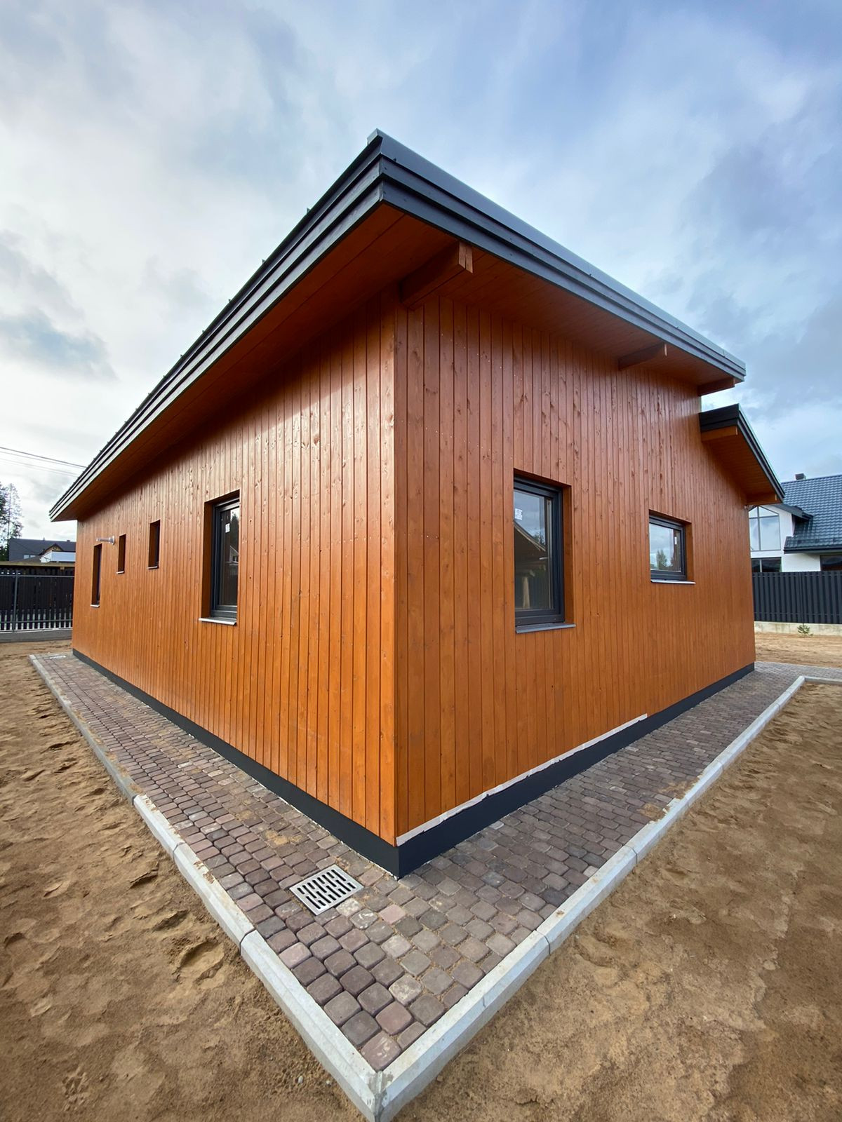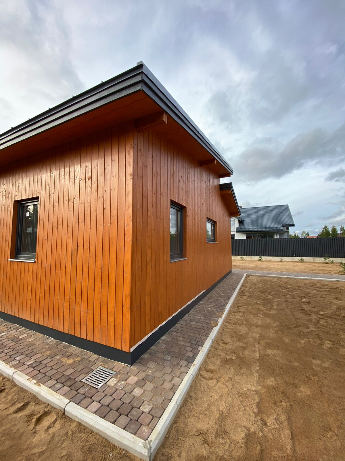 Фундамент дома представляет собой монолитную плиту толщиной 300 миллиметров, что обеспечивает надёжность и устойчивость конструкции. Сам дом выполнен по каркасной технологии, что гарантирует его энергоэффективность и экологичность.