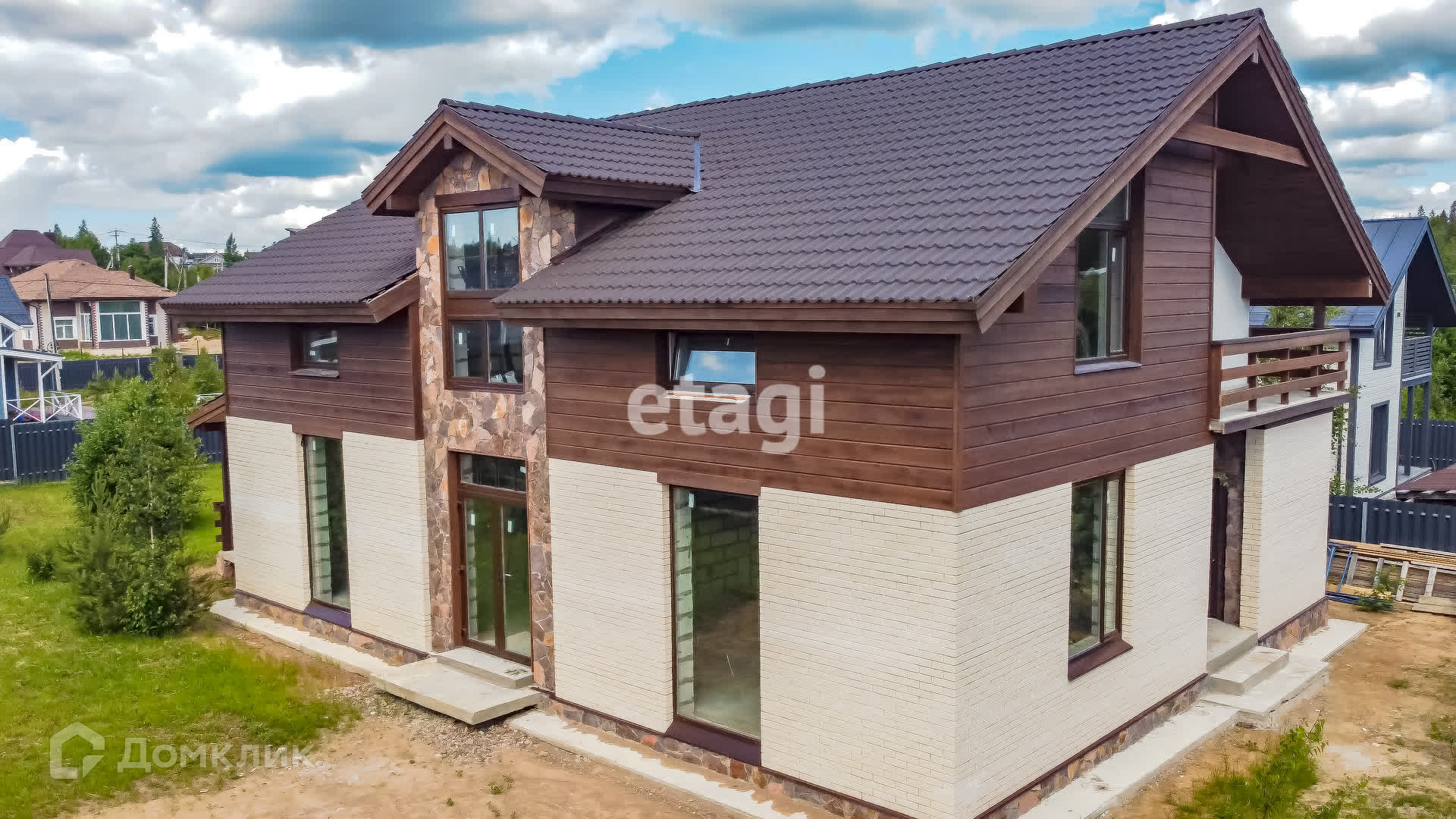 Стены газобетон,облицовка кирпич и натуральный камень так же имитатор бруса. Крыша Черепица , перекрытия и лестница железобетонные.