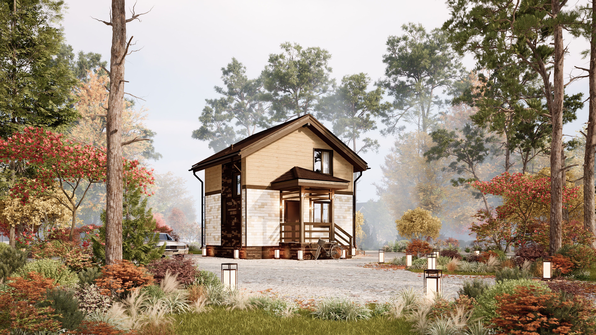 Это уютный и функциональный двухэтажный дом, который идеально подойдёт для небольшой семьи из трёх человек.