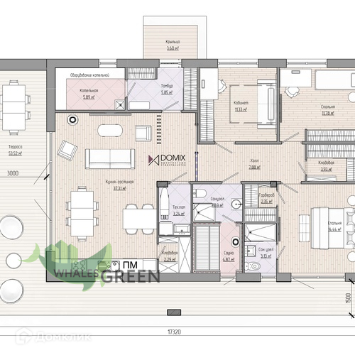 На пространстве всего 173 м2 в доме предусмотрено мастер спальня с гардеробной и своим санузлом, две отдельные комнаты, большая кухня-гостиная с кладовой при кухне, постирочная, гардеробная, и даже сауна!